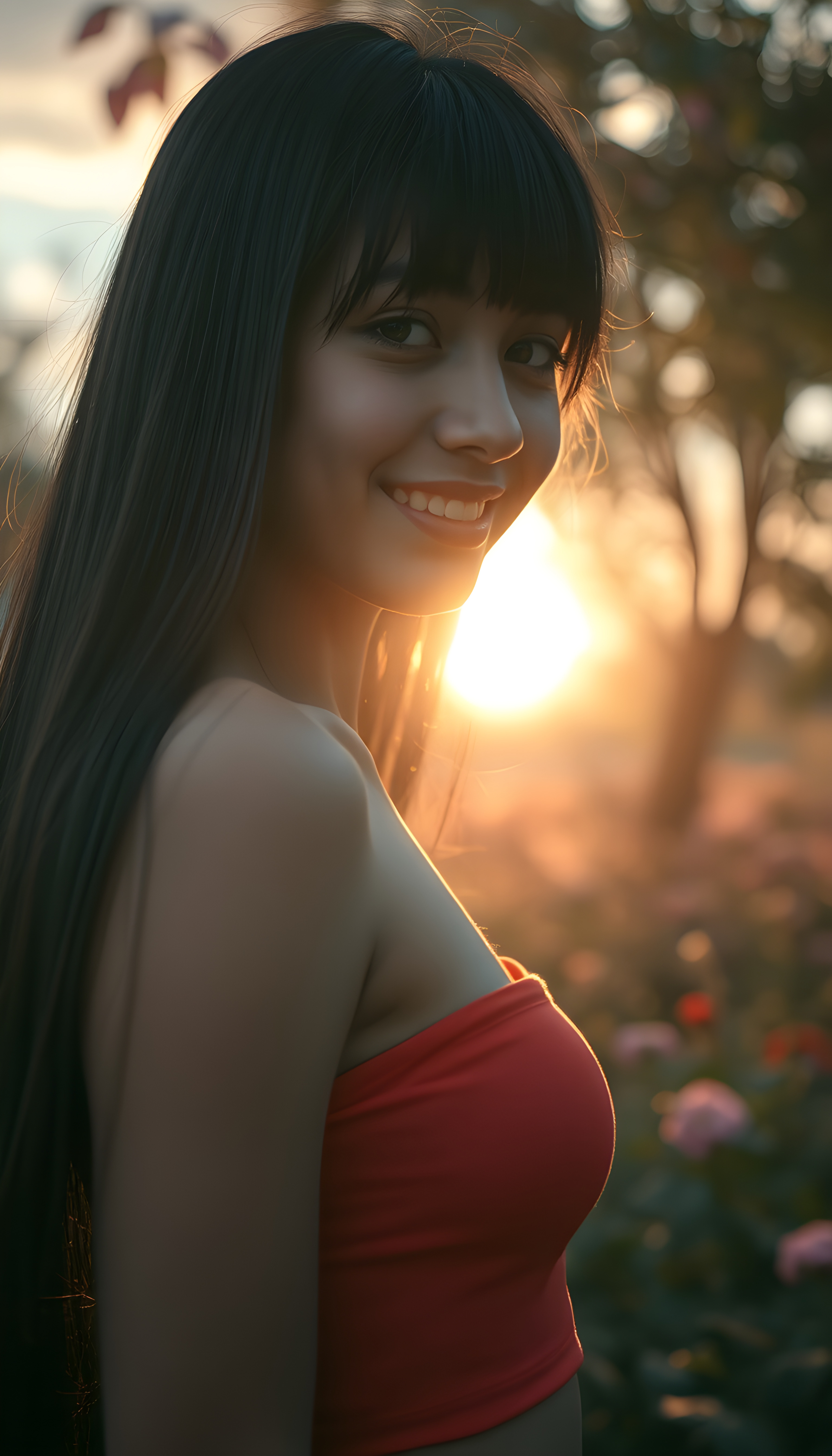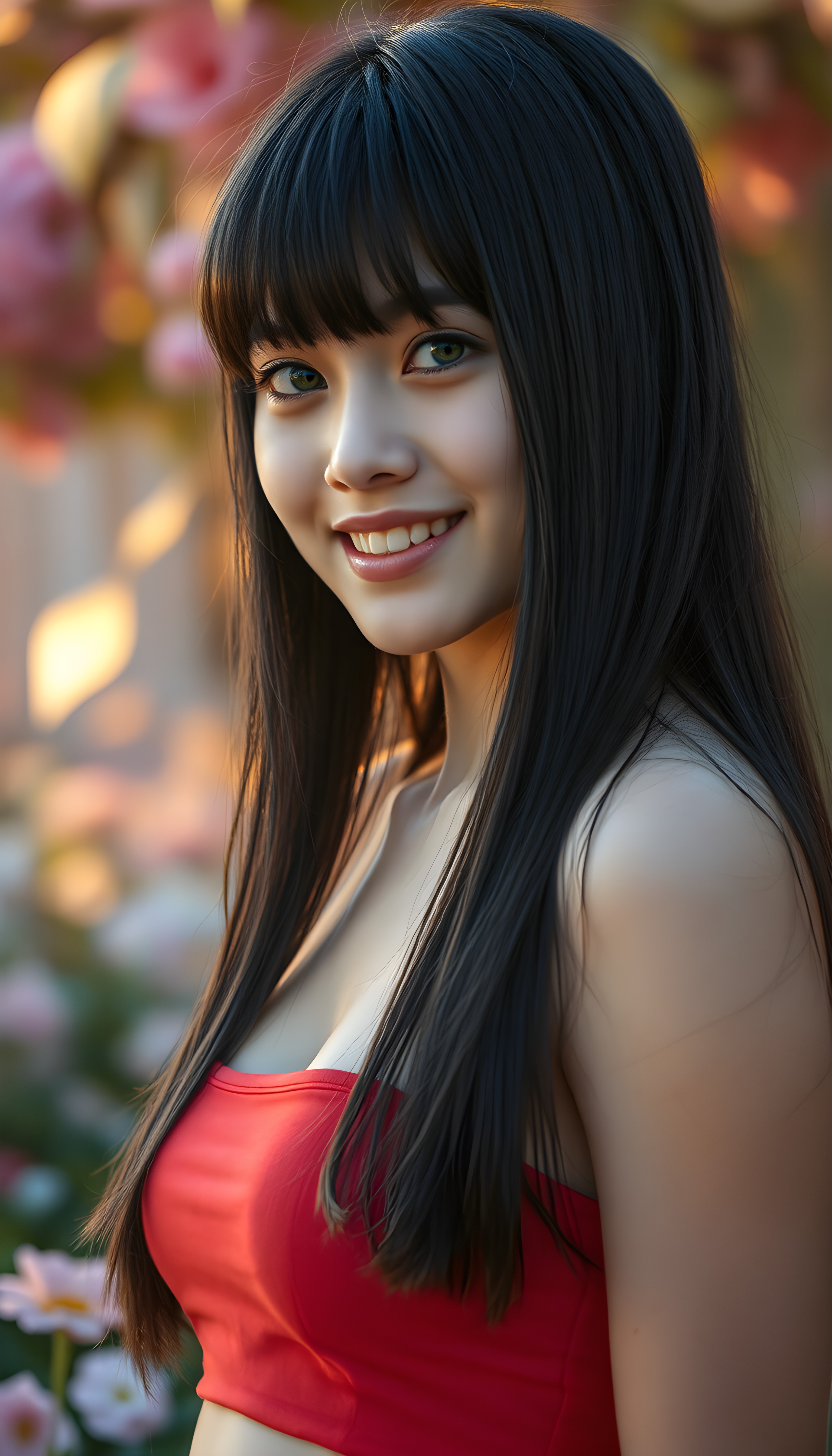 a photo realistic and radiant side portrait of a young well busty seductive teenage girl with straight black very long hair, soft bangs, same length left and right, her eyes sparkling with vibrant green hues, adorned in a light red cropped tank top. She stands confidently in a whimsical, pastel-hued garden, bathed in soft, golden sunlight. Her smile is warm and inviting, white teeth, enhancing her youthful charm and beauty. The background features dreamy, pastel-colored clouds and gentle light beams, creating a serene and enchanting atmosphere with a beautiful sunset