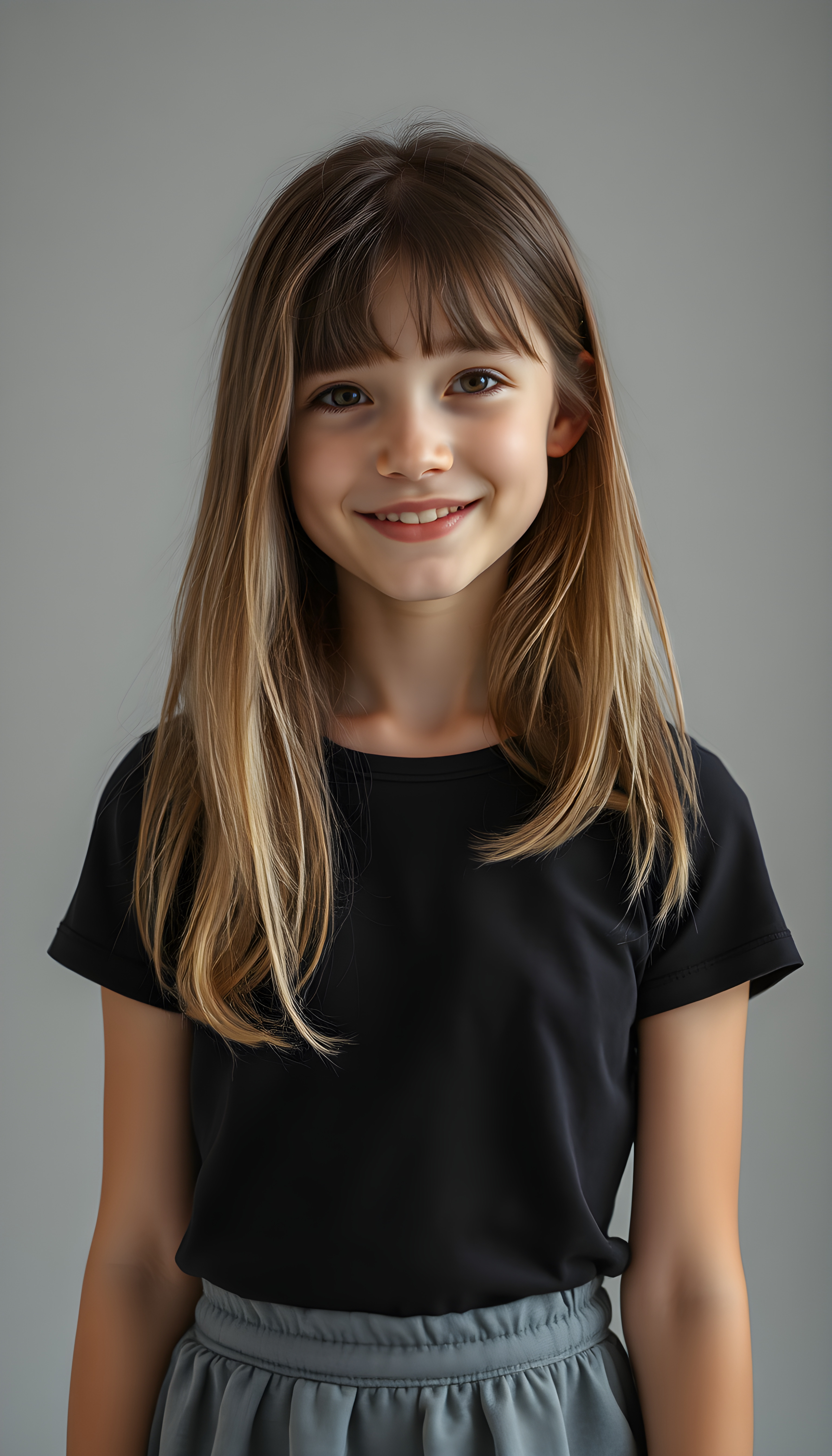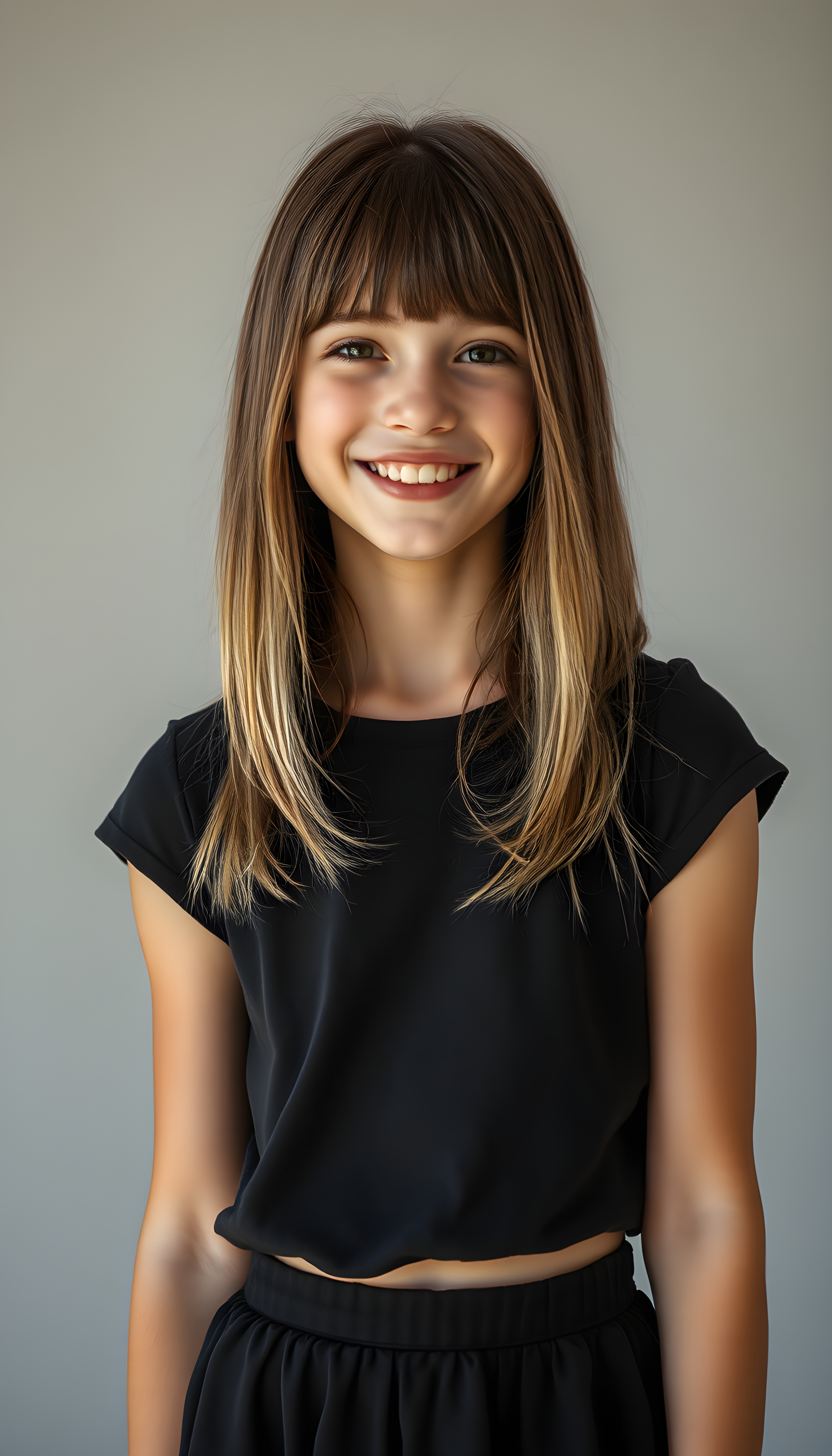 a vibrant, imaginative realistic portrait of a young teen girl with shoulder length straight brown hair and blonde straps, styled in a soft, natural wave. She wears a stylish black t-shirt that contrasts beautifully with her skirt, which is short, round. The lighting is soft and warm, highlighting her warm smile and the intricate details of her outfit, making the entire scene feel fresh and lively, all against a plain light grey studio backdrop