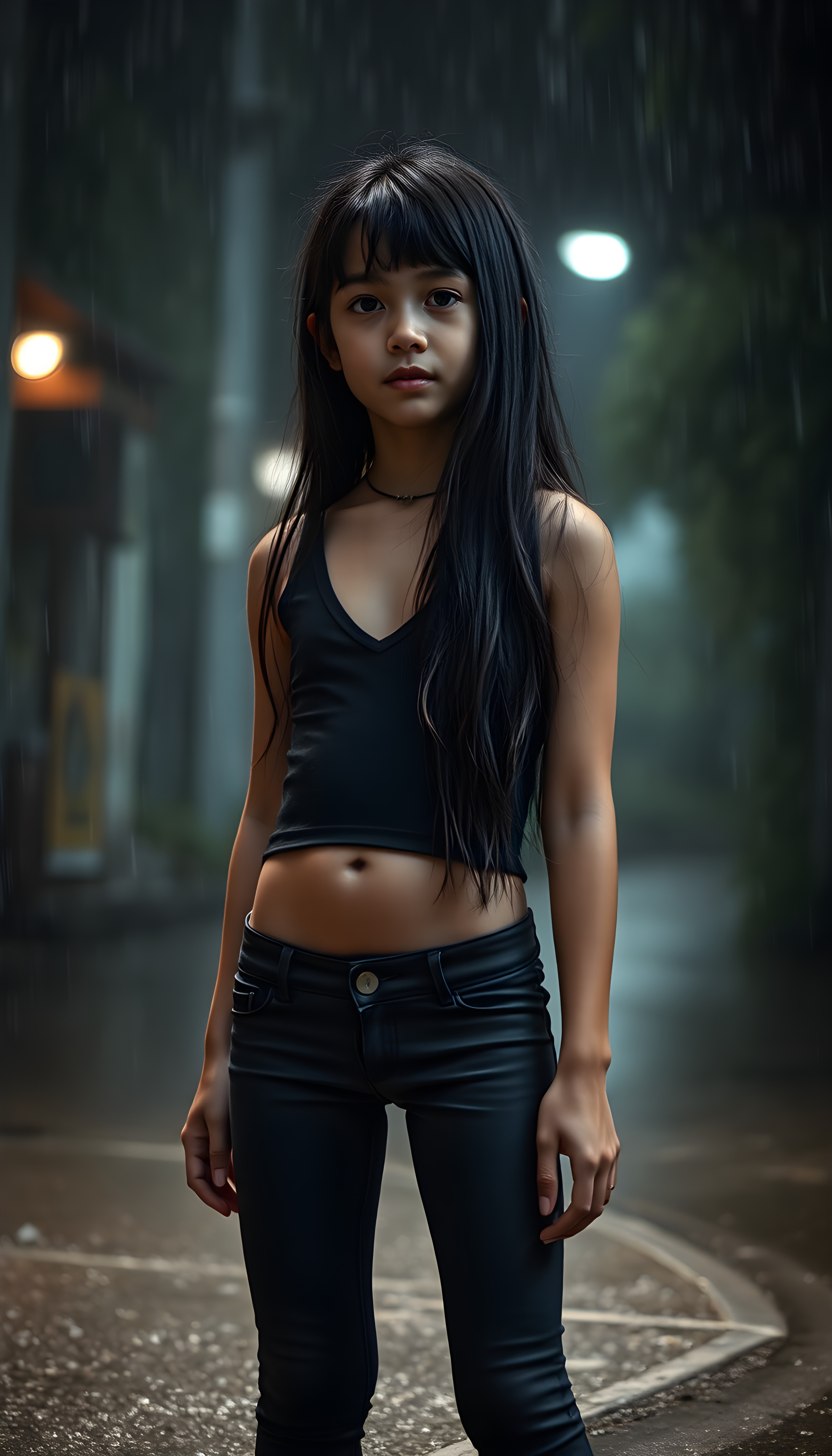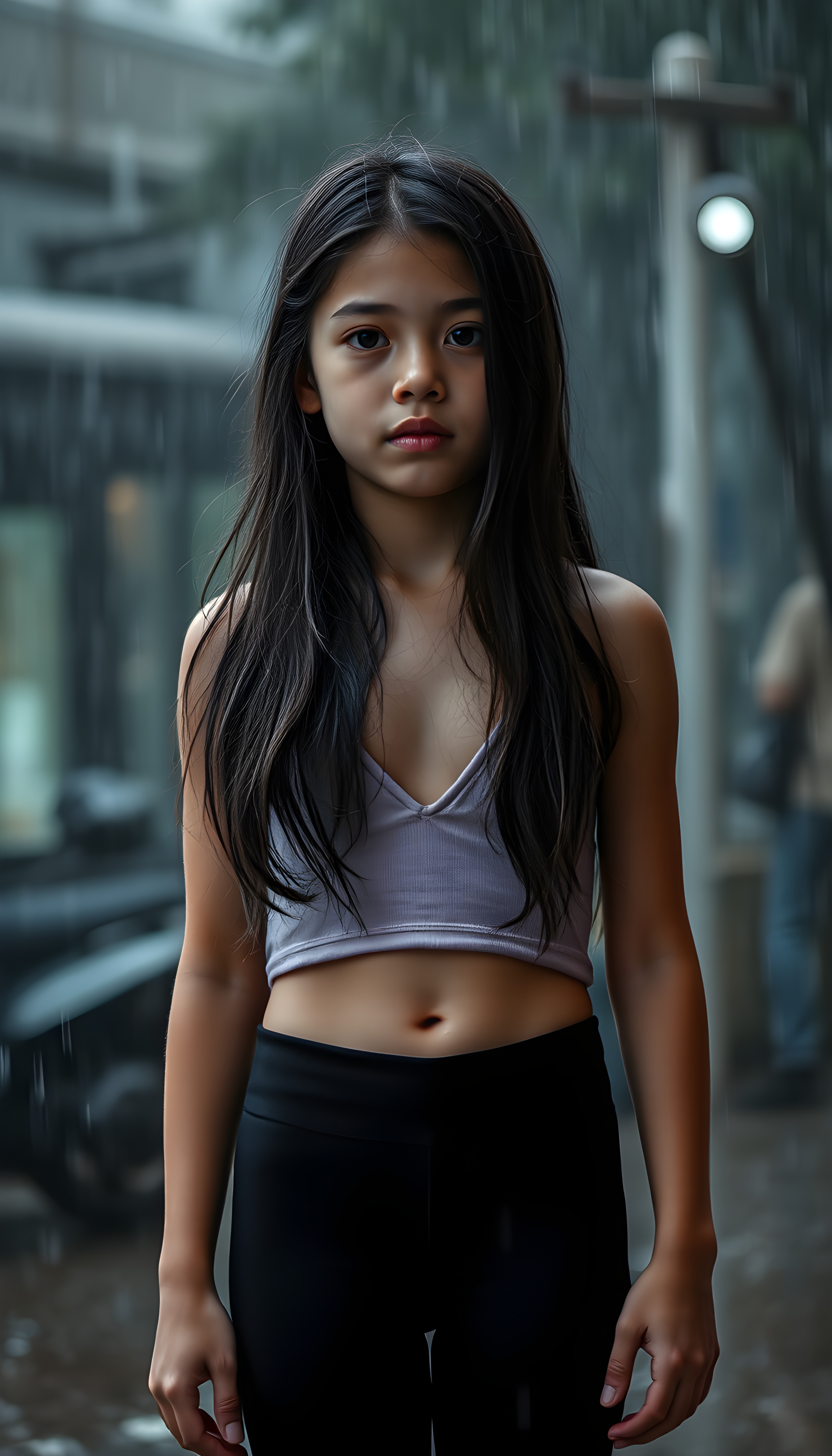 a young girl with cropped tank top, deep v-neck, leggins, long wavy straight black hair, ((accentuating her ((navel)), stand in heavy rain, wet hair