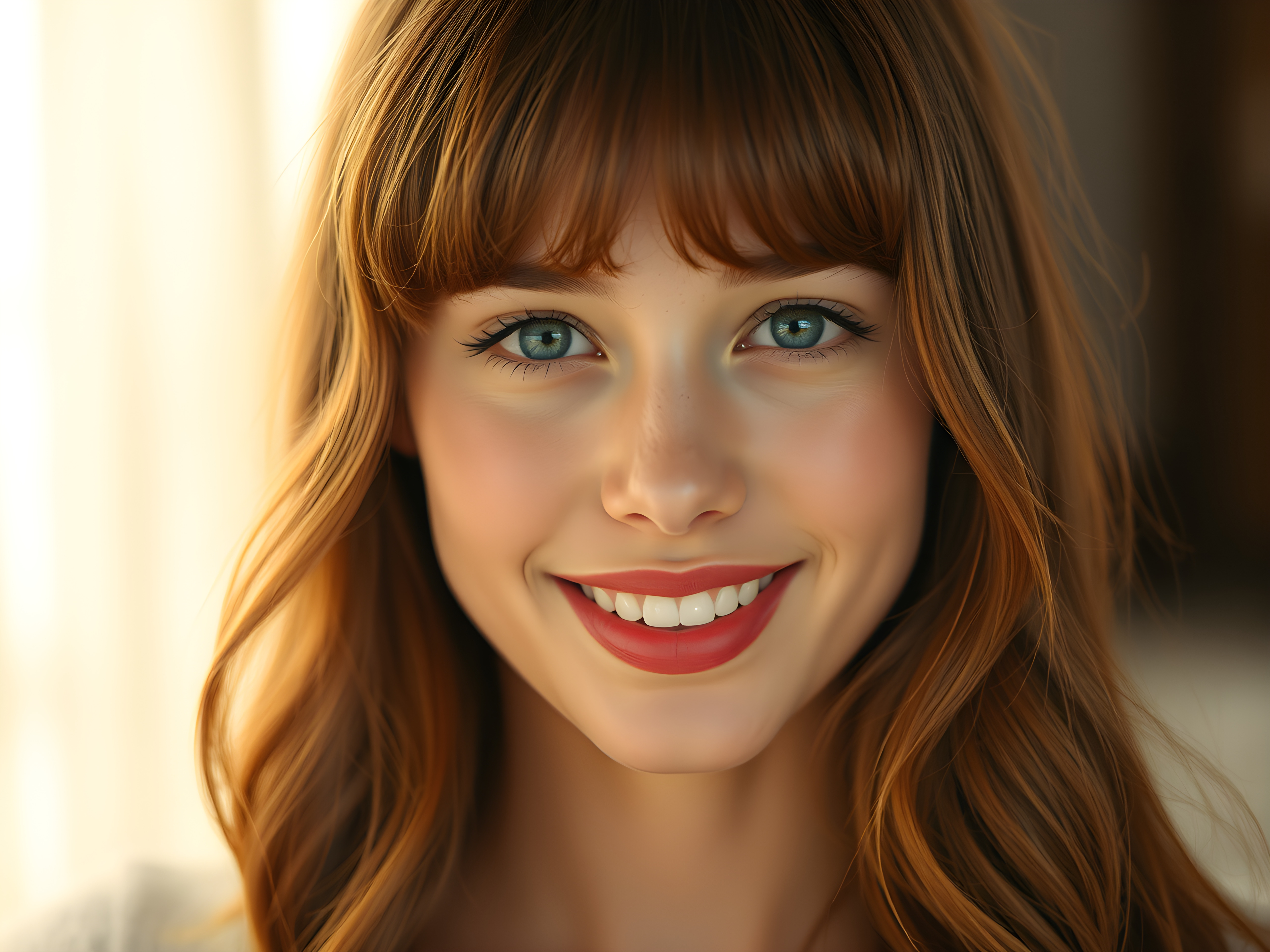 A radiant young teenage girl with a flawless, flawless silver complexion, her deep blue eyes shimmering with reflections of light, set against a soft, ethereal background. Her full, red lips are slightly parted, revealing a dazzling smile with white teeth. Her hair is a rich, reddish-brown, flowing in gentle waves and bangs that frame her face perfectly. The scene is bathed in a warm, golden light, highlighting her youthful beauty and creating a sense of serene elegance.