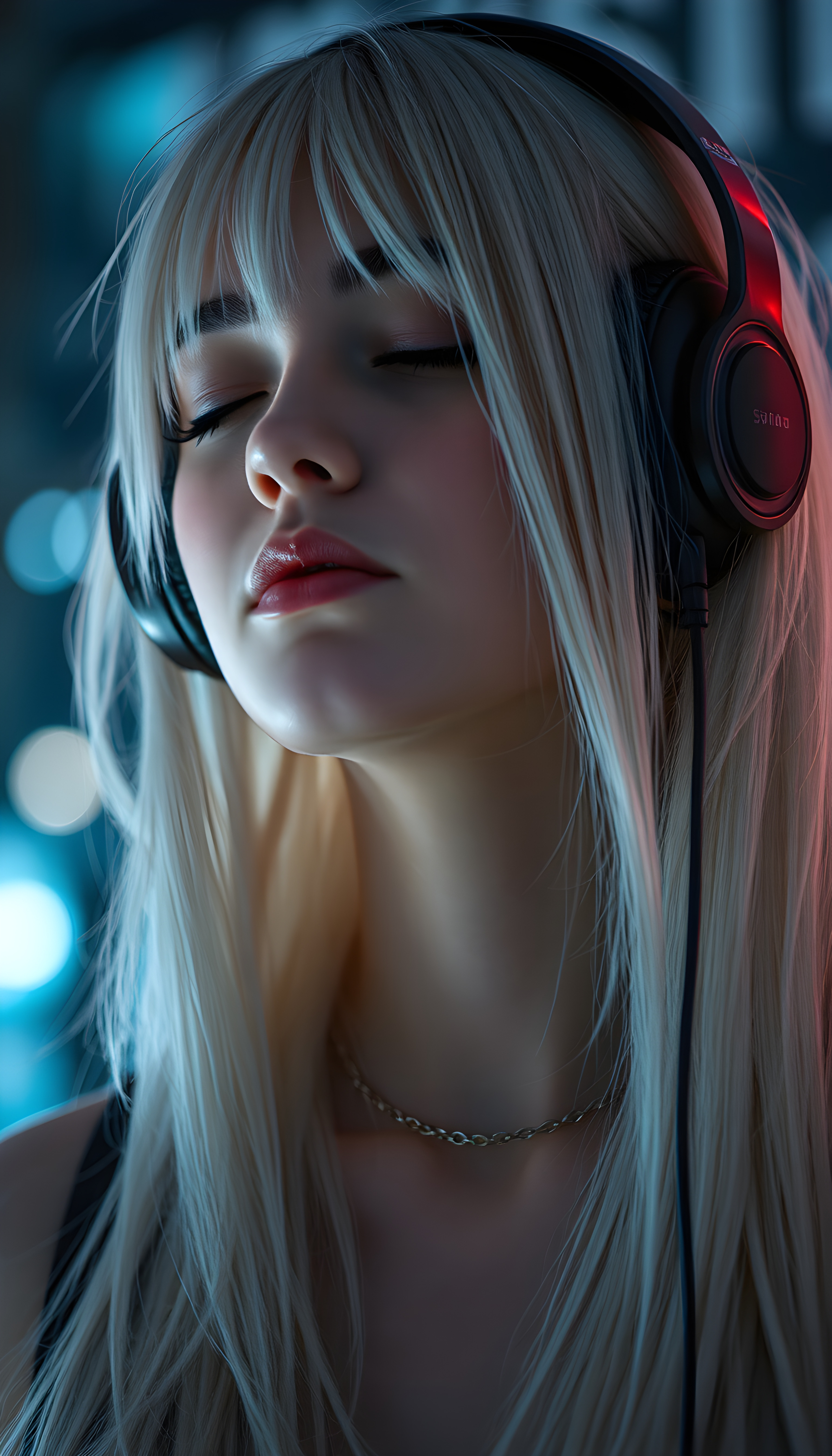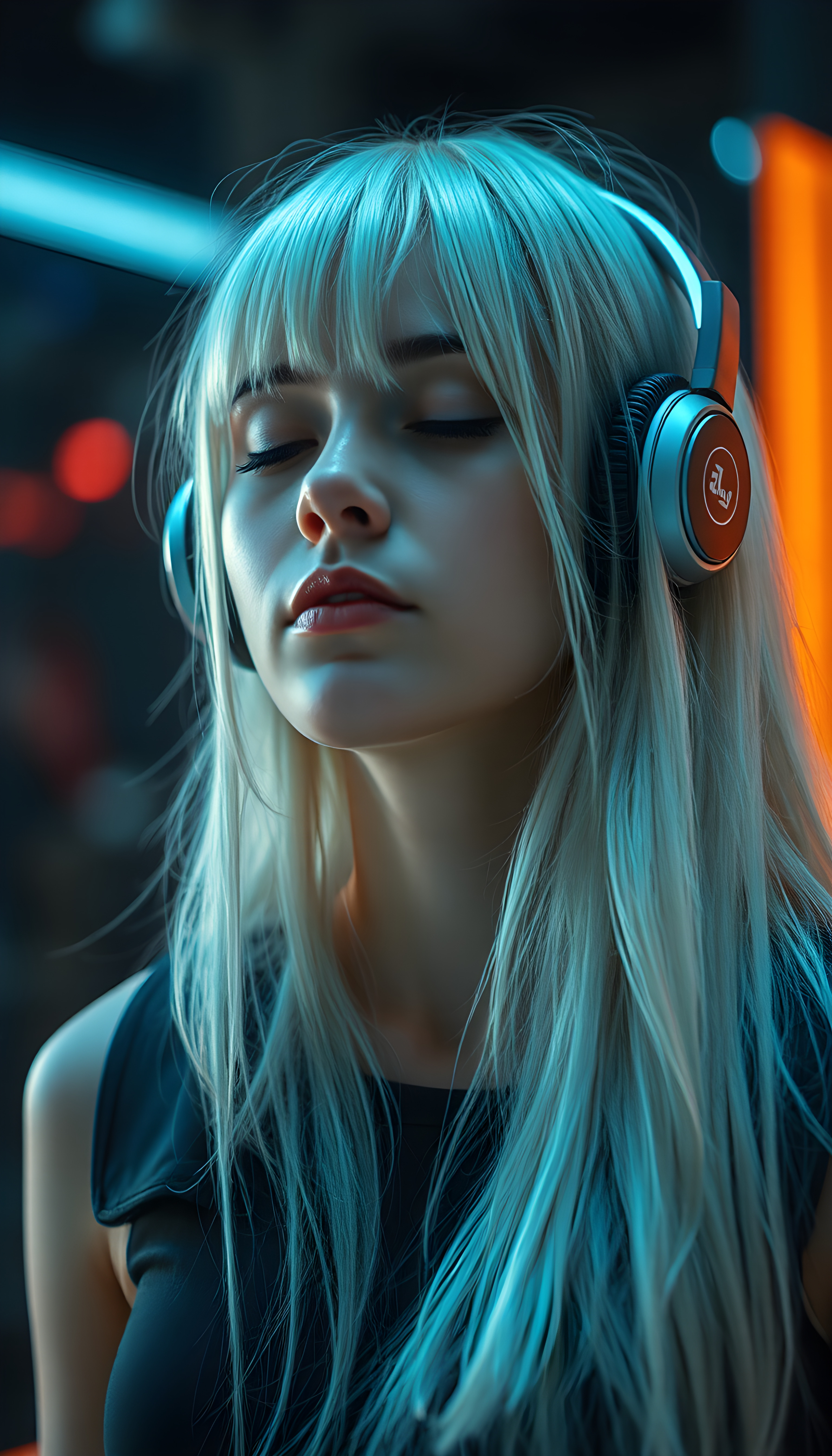 A futuristic techno girl wears headphones. Her eyes are closed and she is listening to music. Peaceful face. Long, white hair falls over her upper body and is the same length on the right and left.