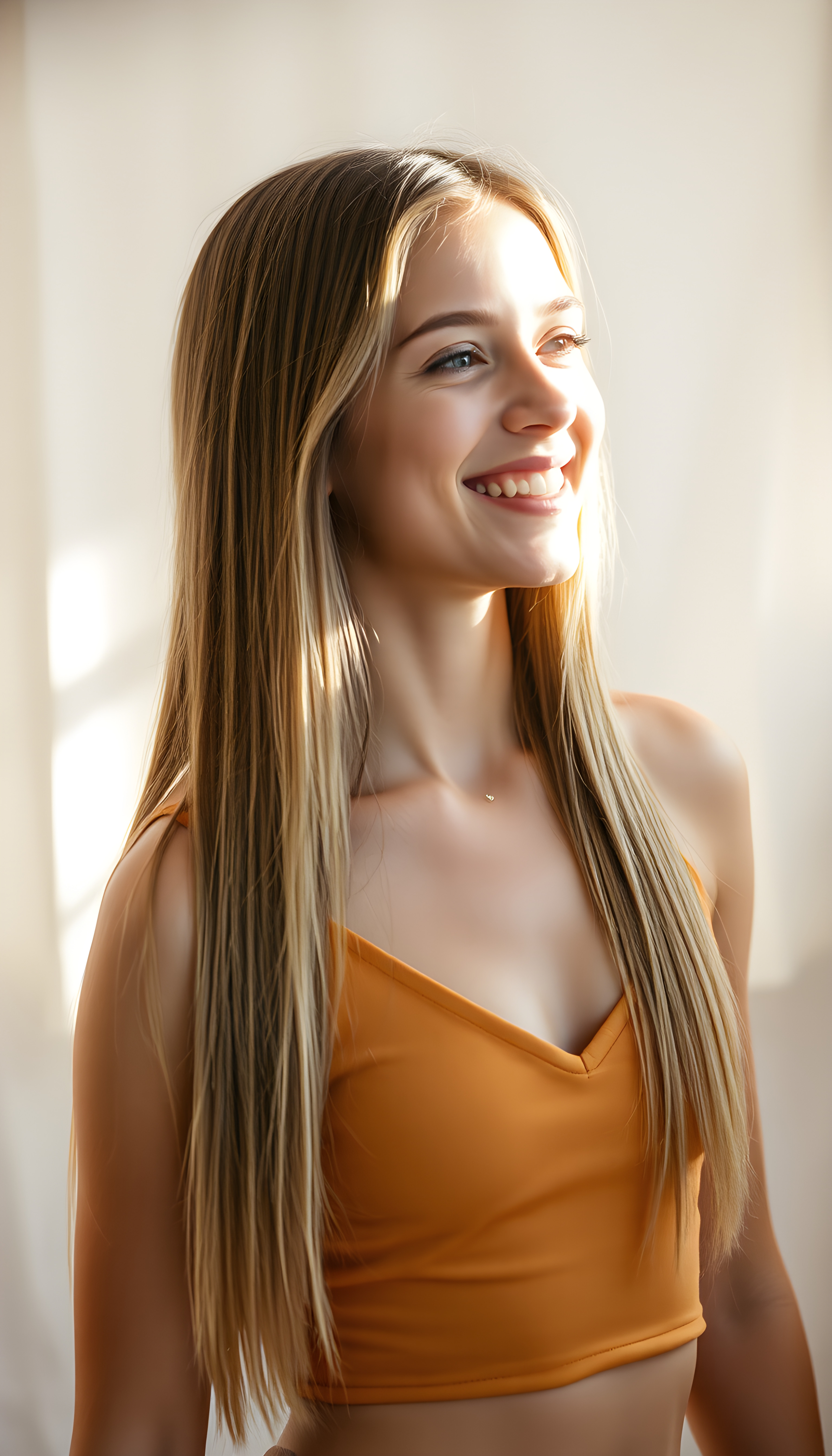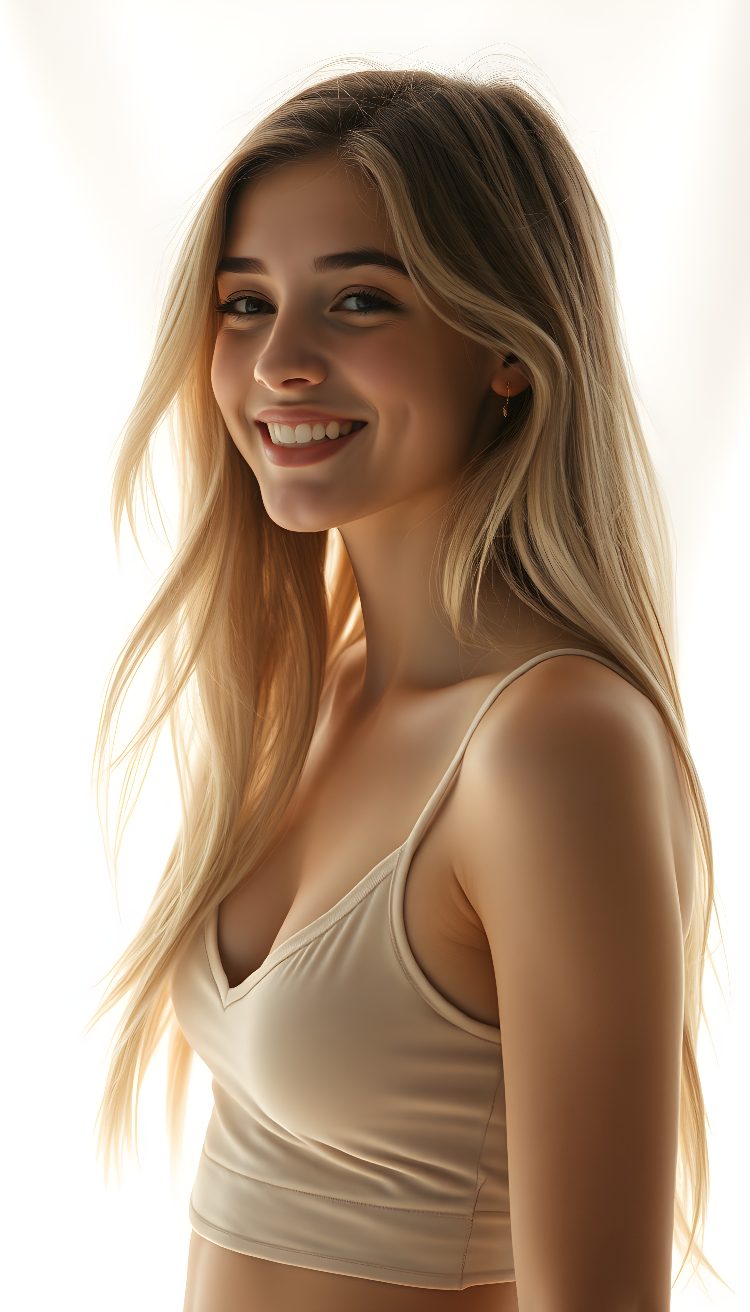 A vibrant and radiant young woman with long straight, light amber hair and white highlights, wearing a light amber short tank top with a deep V-neck. She has a radiant smile, revealing white teeth, exuding joy and youthfulness. Her petite, perfectly proportioned figure is accentuated by her clothing. She stands against a pristine white backdrop, with sunlight filtering through, casting a warm glow. Her side view reveals a youthful, elegant presence, with a cute, detailed face that sparkles with innocence and happiness.