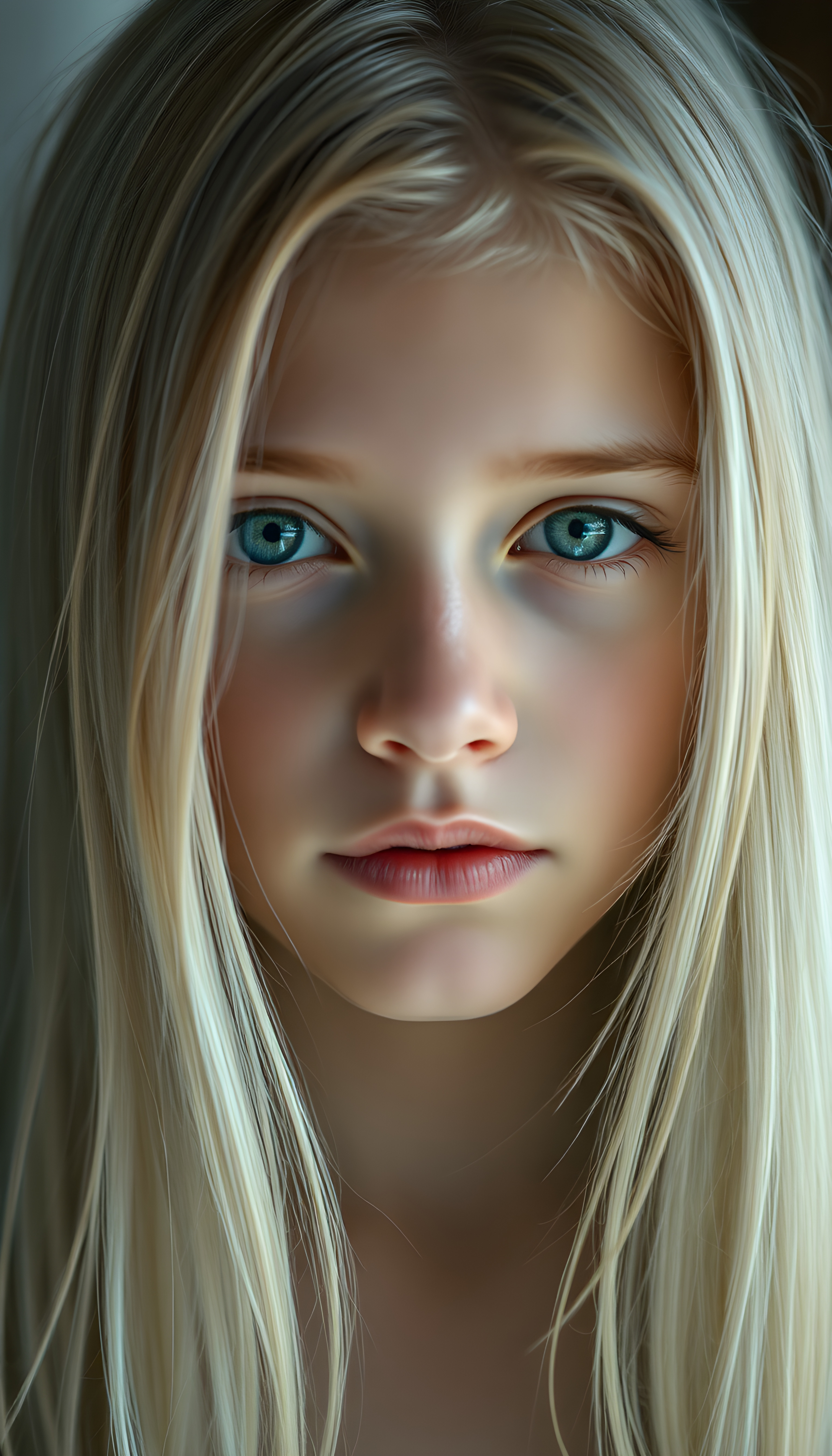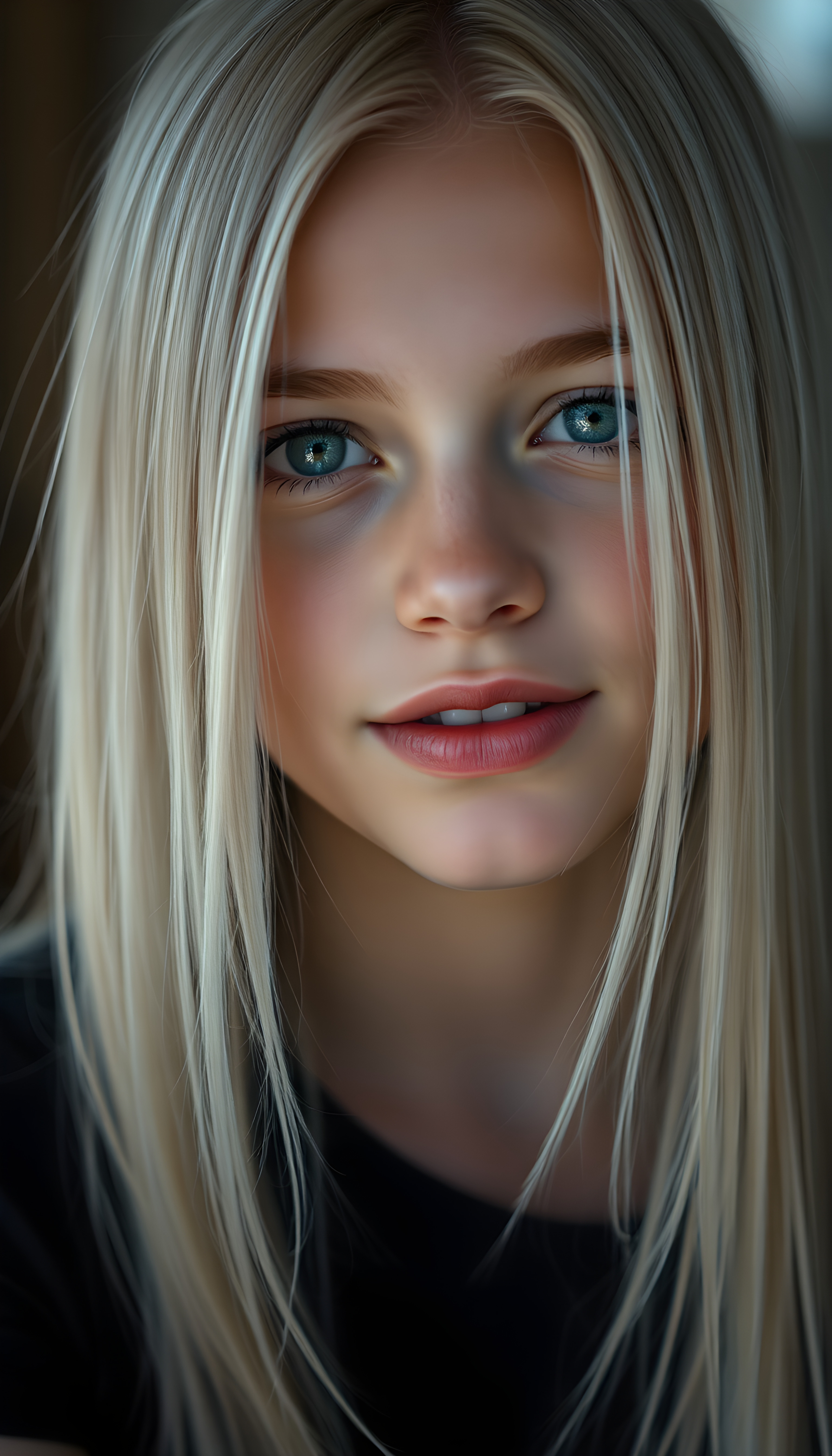 A young stunning girl. Peaceful face. Long, white hair falls over her upper body and is the same length on the right and left, full kissable lips, blue eyes, white teeth