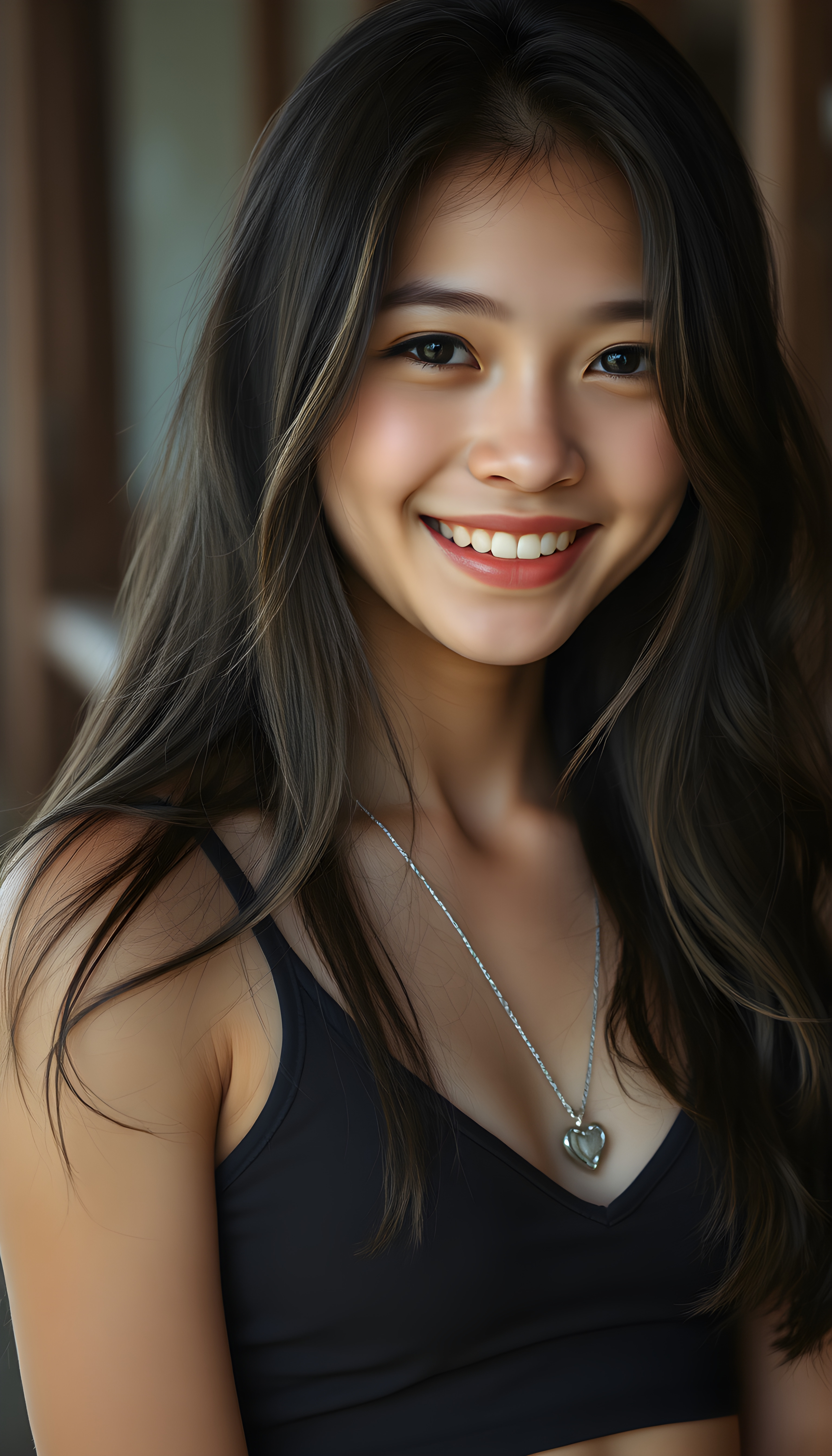 a (((young cute happy well busty seductive Thai teen girl, black long wavy hair with blond highlights))), smile very happy, (wears a short cropped tank top with deep v-neck), perfect curved body ((perfect portrait)), ((straight smooth hair)), silver necklace heart