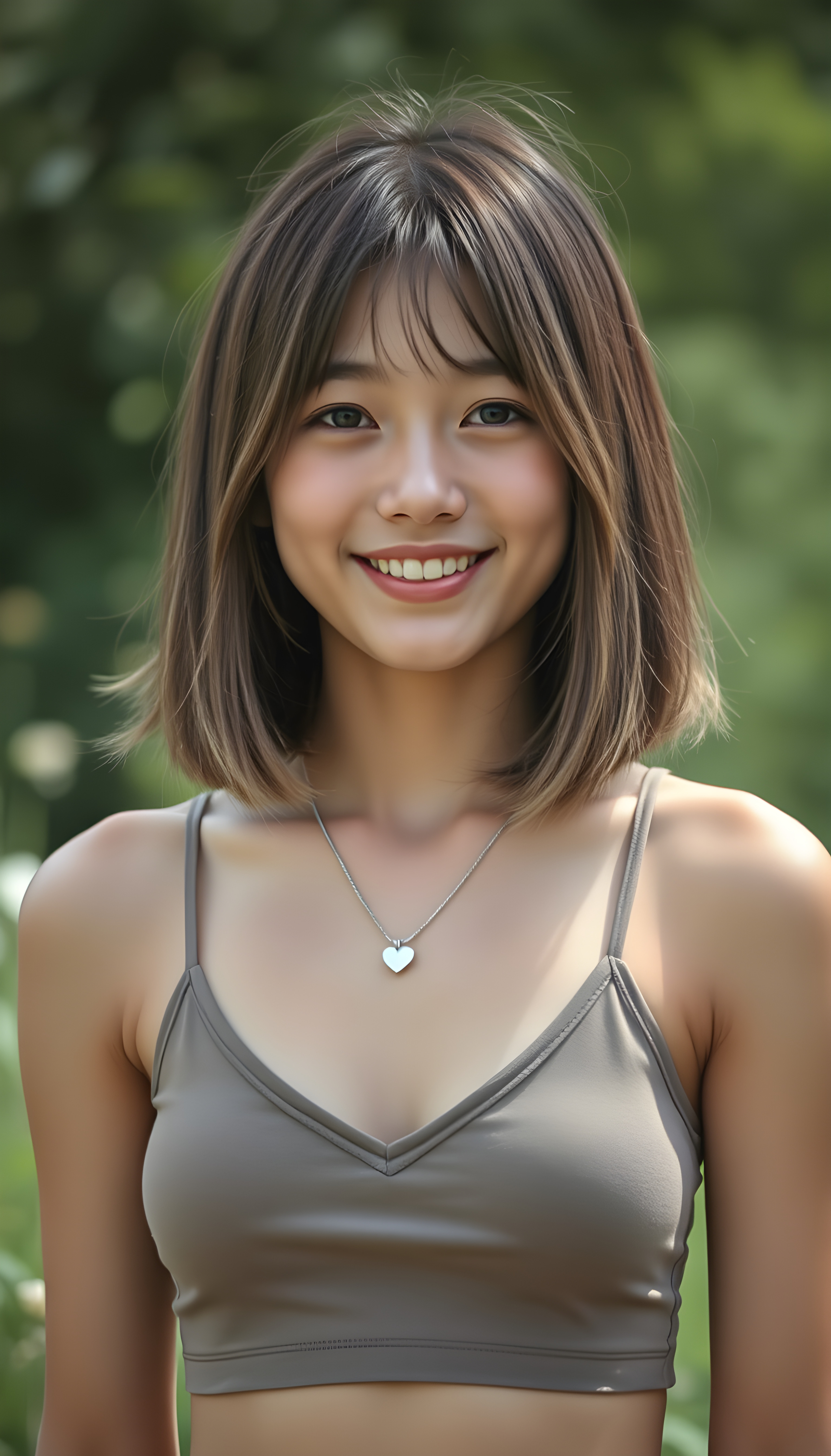 a (((young cute happy well busty Japanese teen girl, brown hair with blond highlights))), smile very happy, (wears a short cropped tank top with deep v-neck), perfect curved body ((perfect portrait)), ((straight smooth hair, bob cut)) ((sunny green backdrop meadow)), silver necklace heart