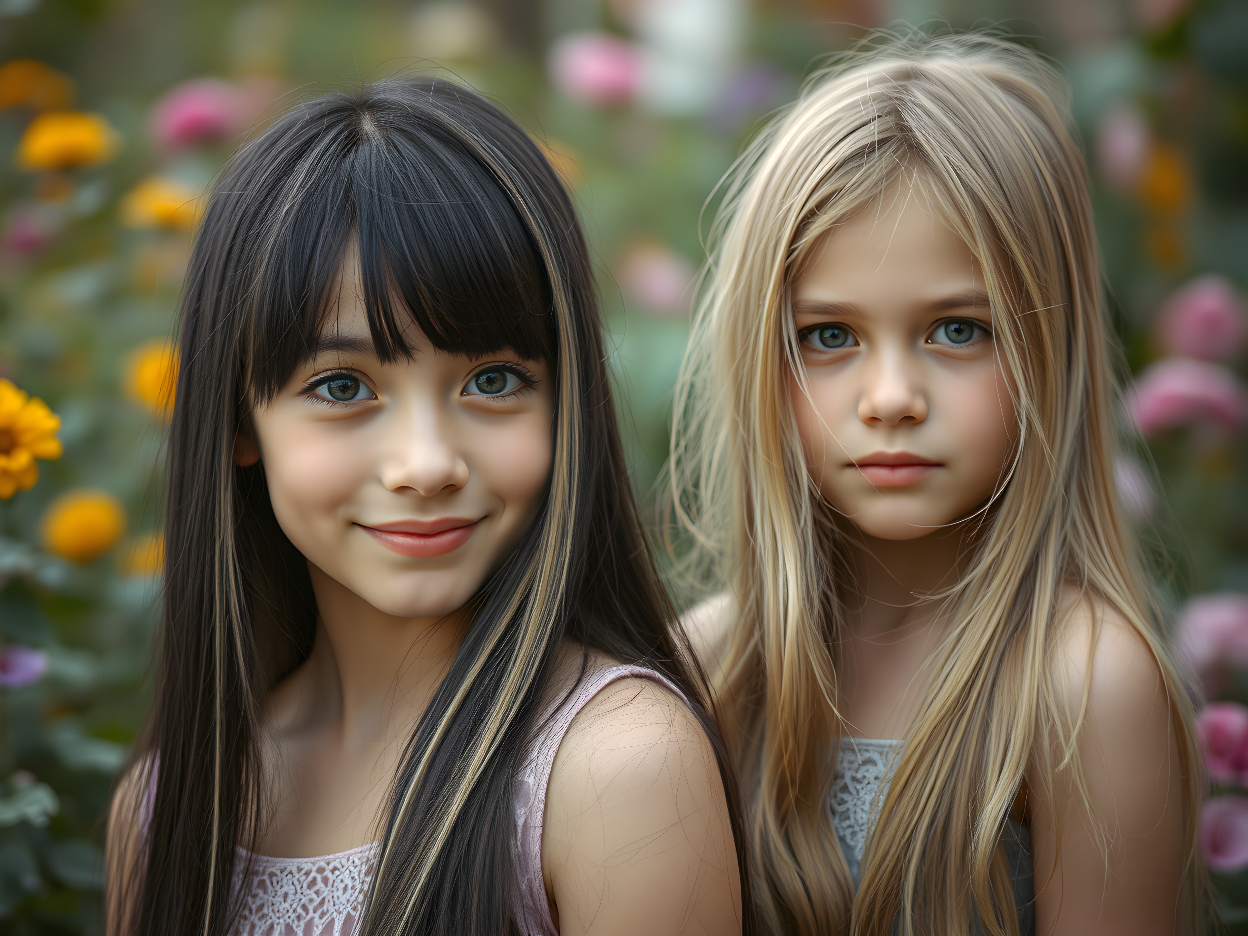 In a whimsical, dreamy garden setting, two adult girls with vibrant, imaginative flair gaze directly at the viewer. The first girl, with her long, straight black hair adorned with playful blonde streaks and bangs cascading gently over her face, has a pair of sparkling, heart-shaped eyes and a joyful smile. Her outfit is a delicate, pastel-colored dress with intricate lace detailing. Beside her stands her sister, her long, golden hair cascading like a waterfall, her eyes sparkling with curiosity.