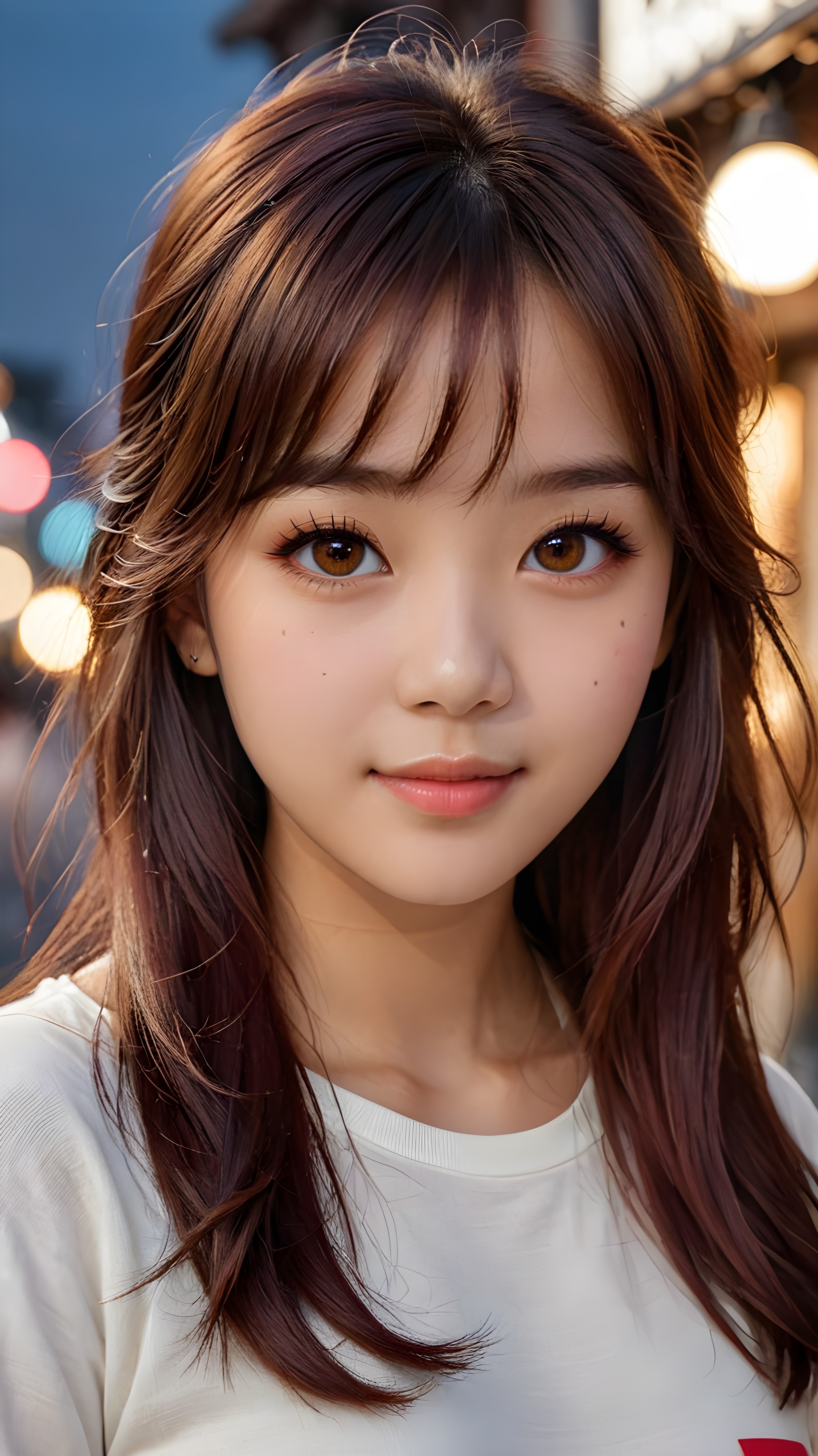 a 14 years old teen girl, detailed hair, Korea styled bangs, white short t-shirt, perfect curved body, ultra realistic face, realistic amber eyes, detailed maroon straight long hair, a stunning photo with beautiful saturation, ultra high resolution, deep shadow, (best quality, masterpiece), looking at viewer, warm smile, (upper body)