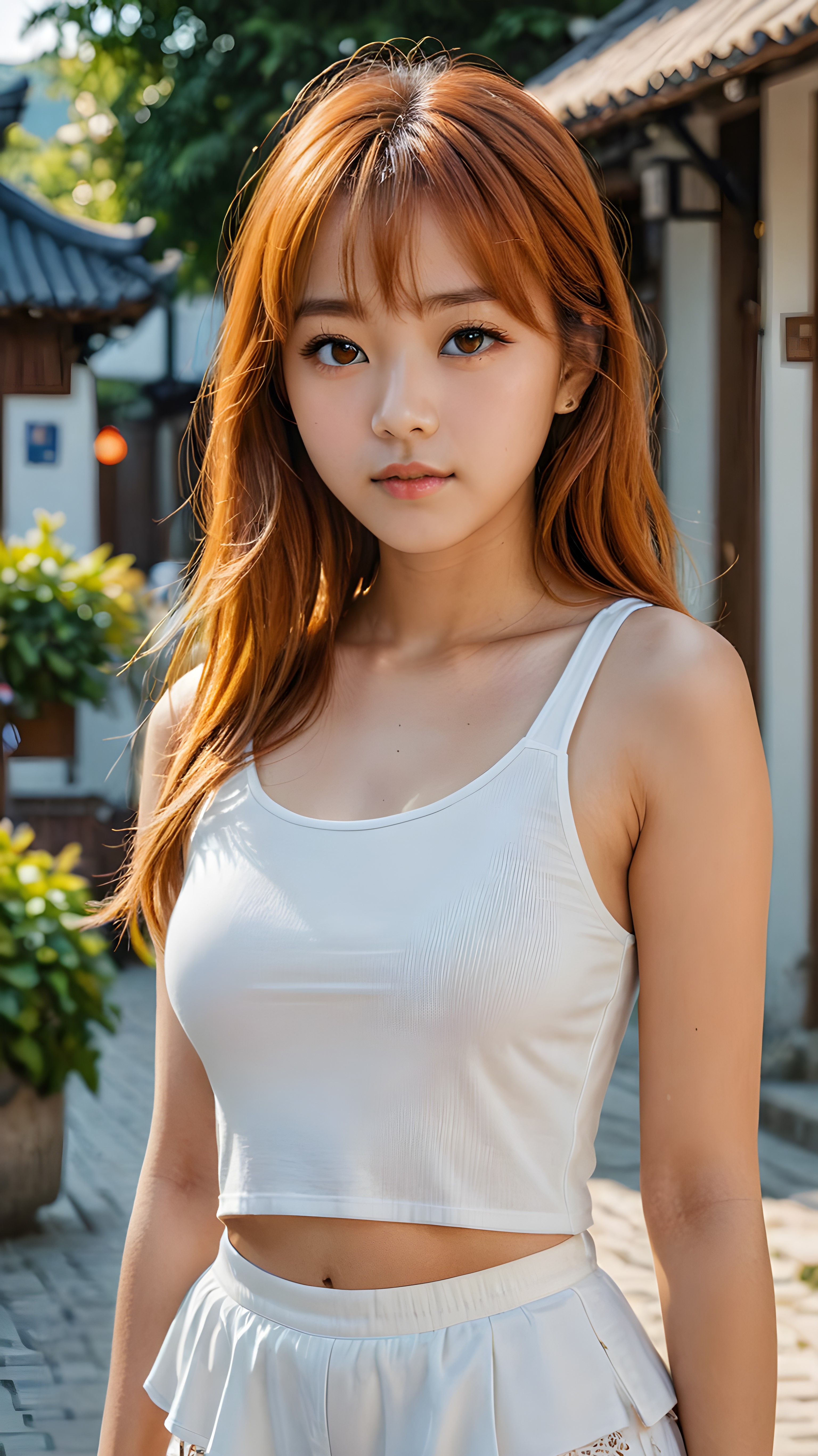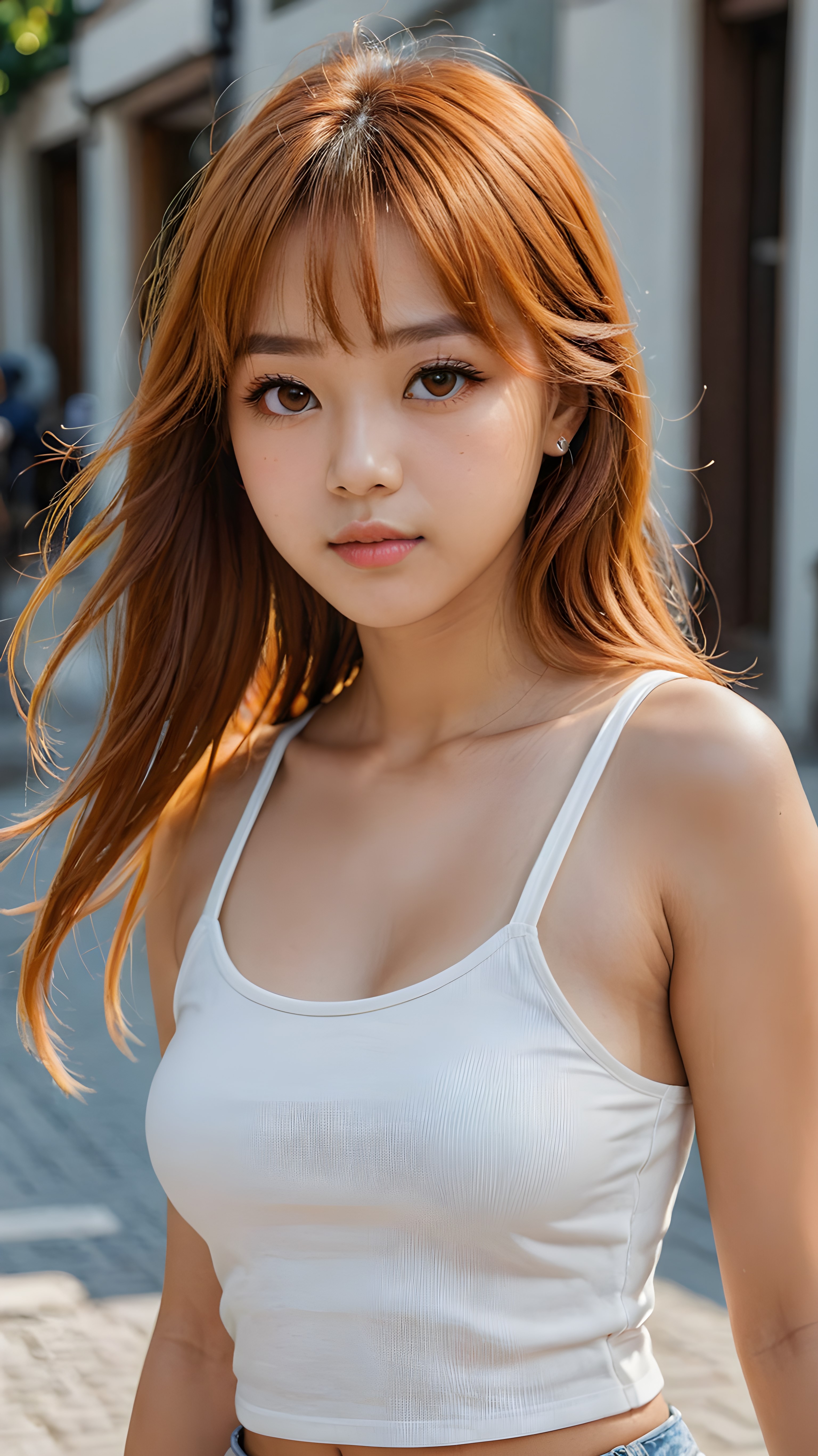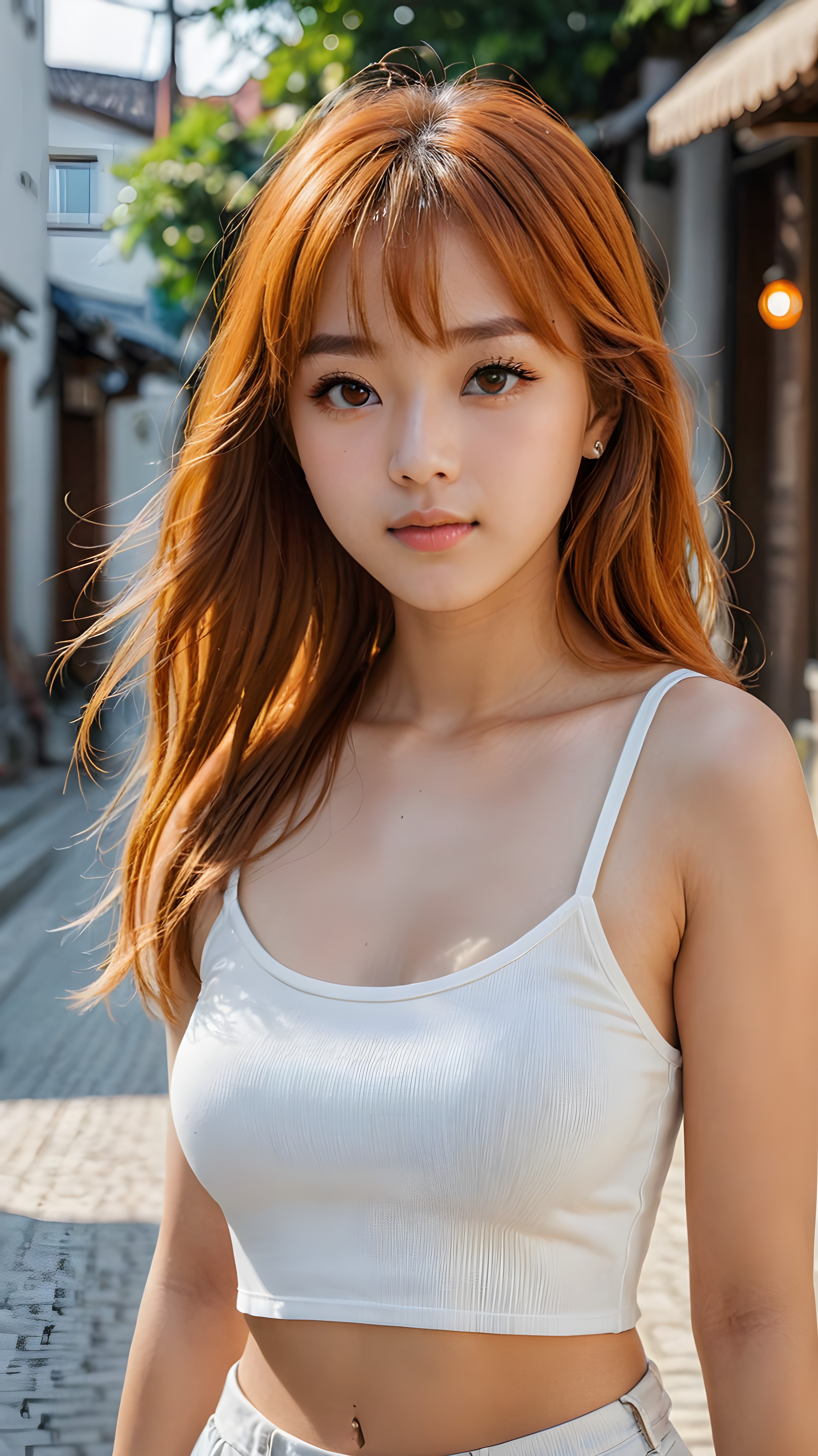 cute 14 years old teen girl, Korea styled bangs, perfect curved body, ultra realistic face, realistic amber eyes, ((detailed orange soft long straight hair)), ((white cropped short tank top)), a stunning photo with beautiful saturation, ultra high resolution, deep shadow, (best quality, masterpiece)