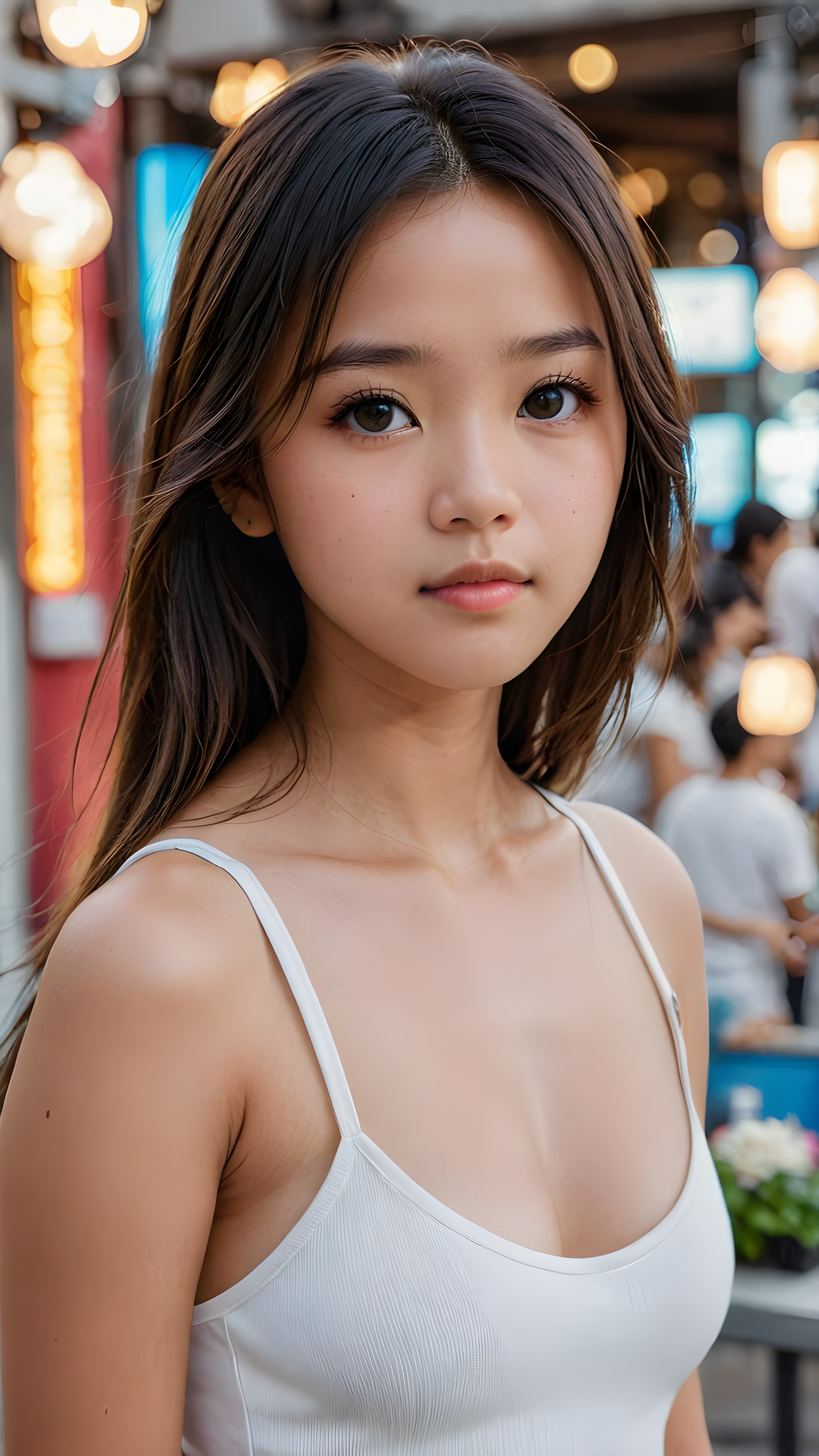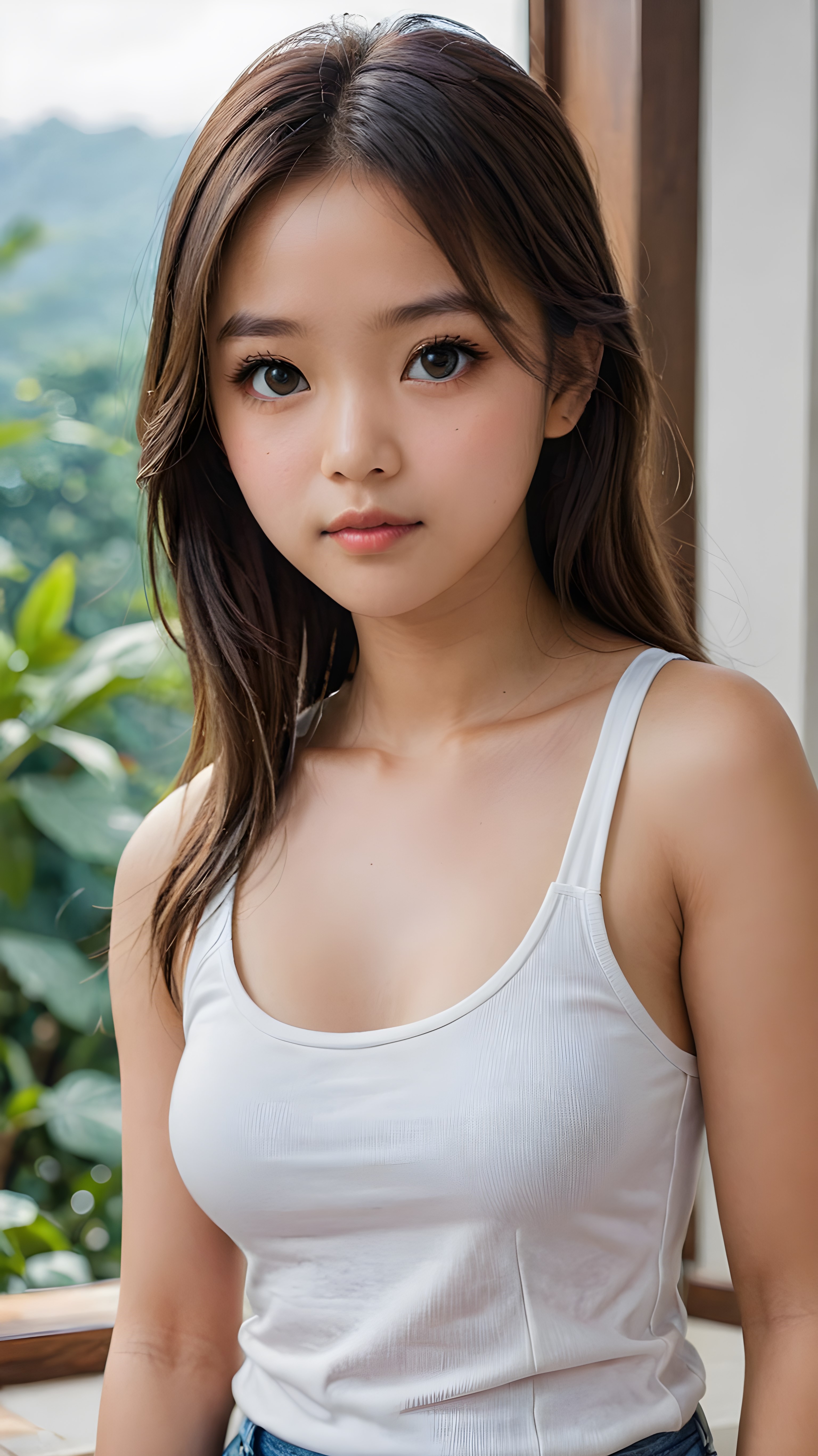 super realistic, detailed face, cute 14 years old Asian girl, long straight hair, realistic detailed eyes, wear white short tight tank top, looks sadly at the camera, perfect curved body