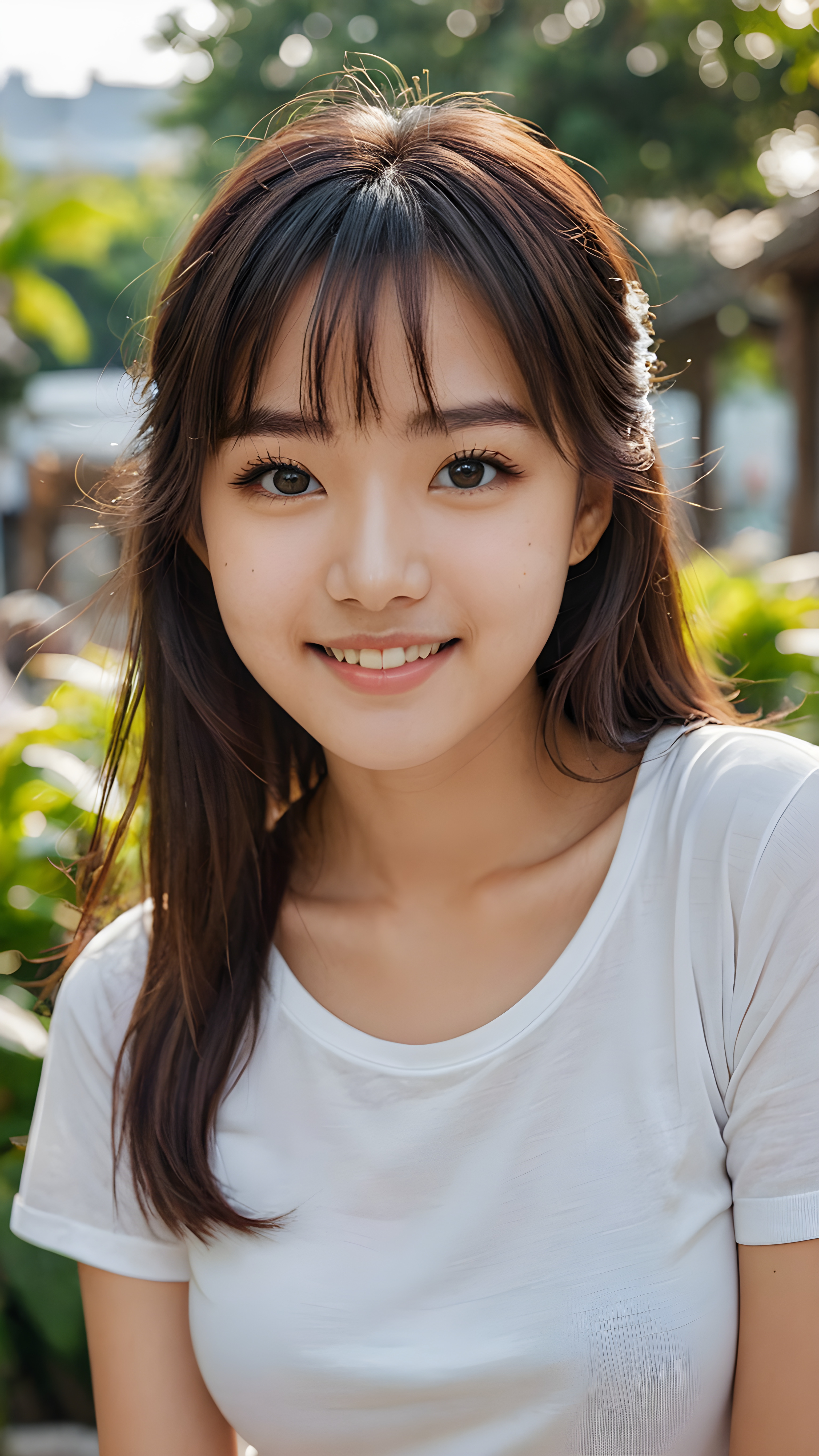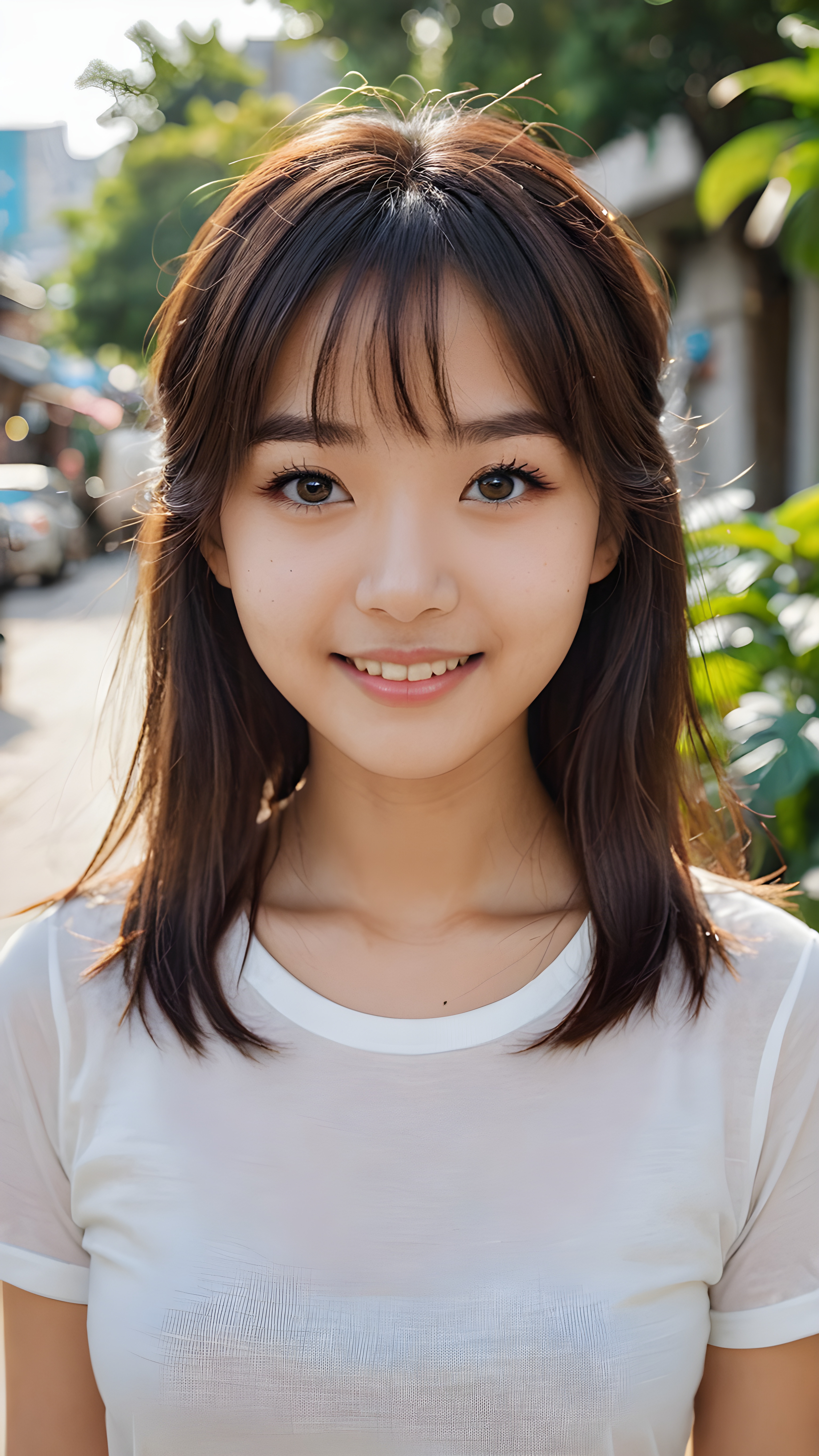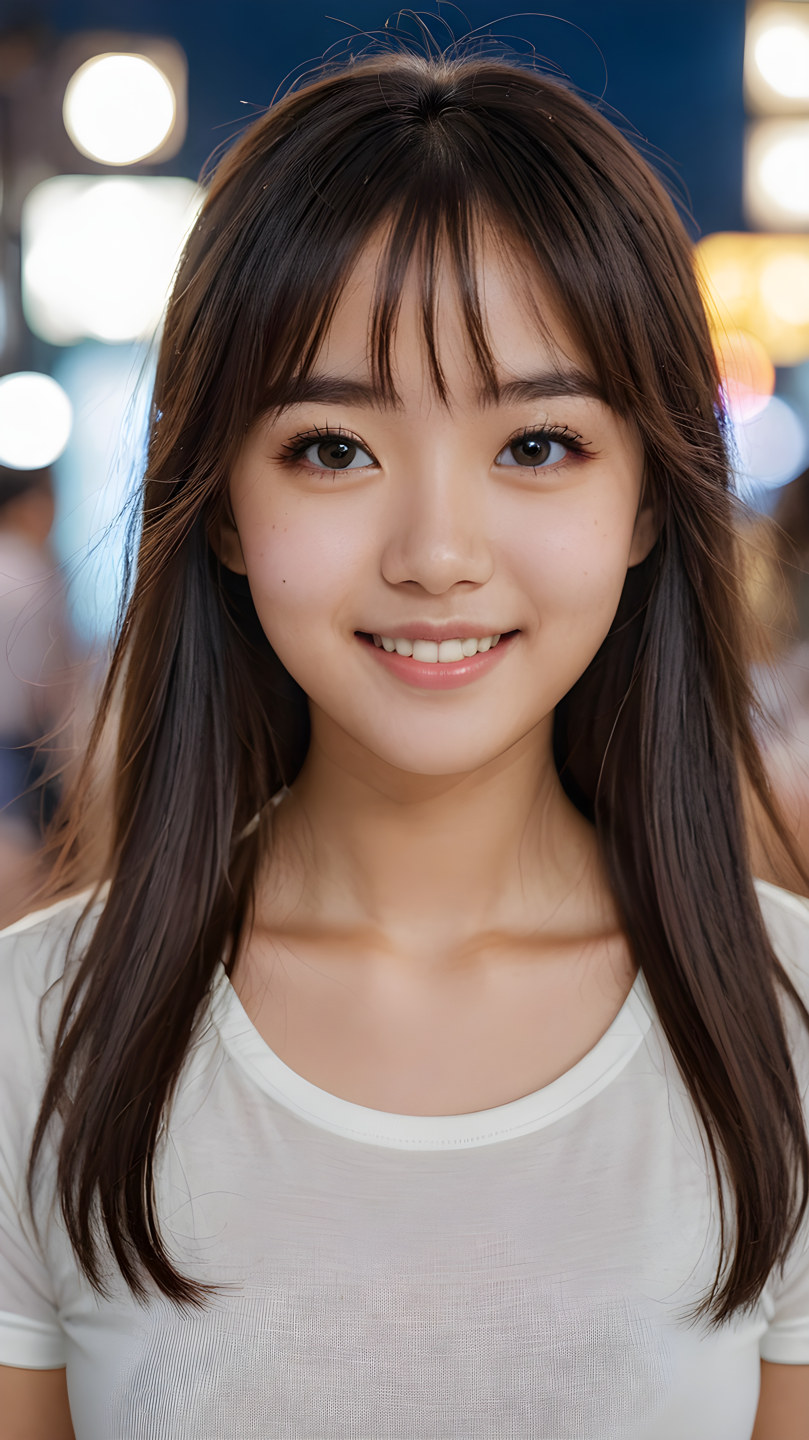 very cute 18 years old Asia girl, long hair, Korean styled bangs, perfect detailed hair, detailed eyes, looks at the camera and smile, wear short tight white t-shirt