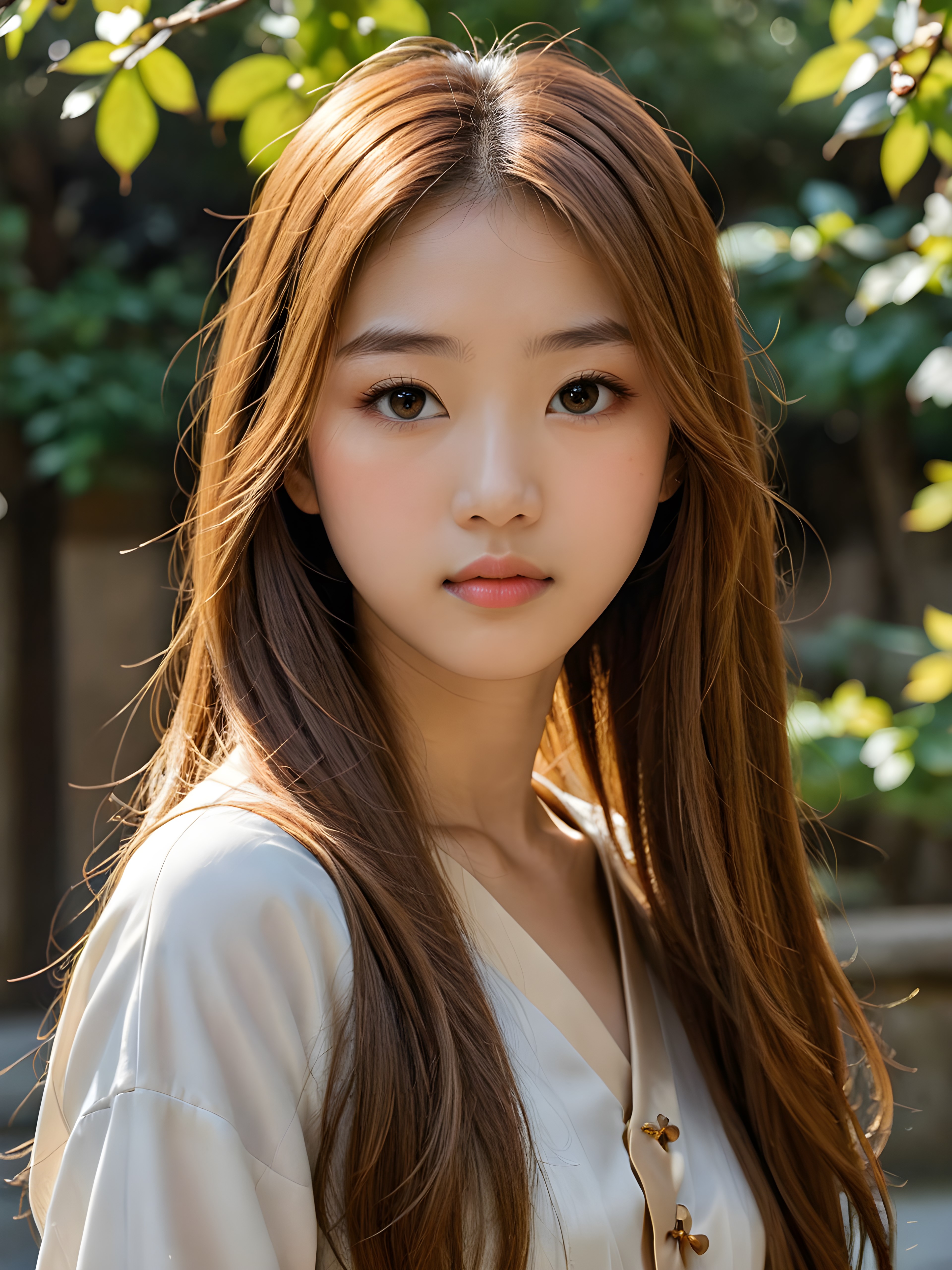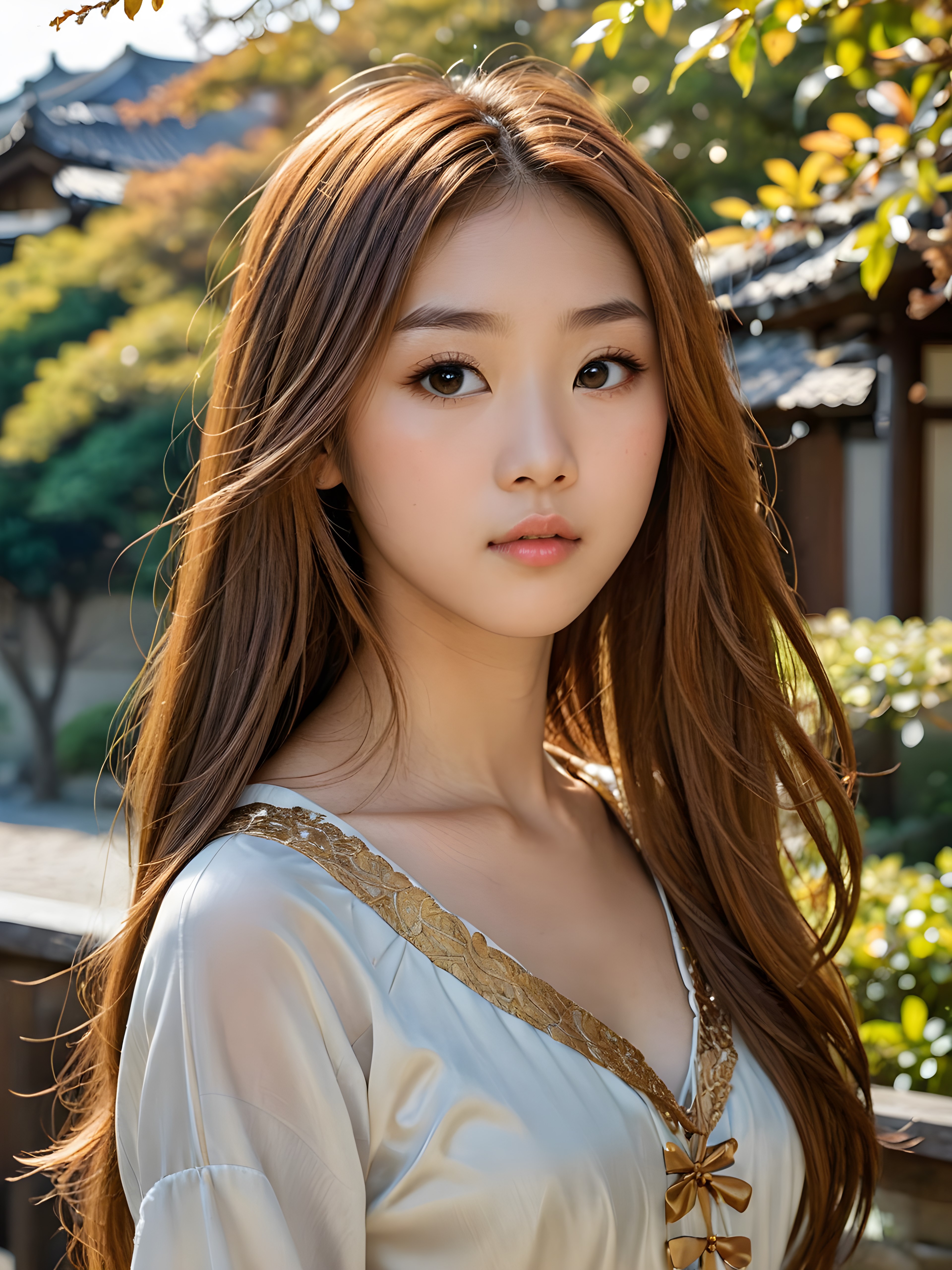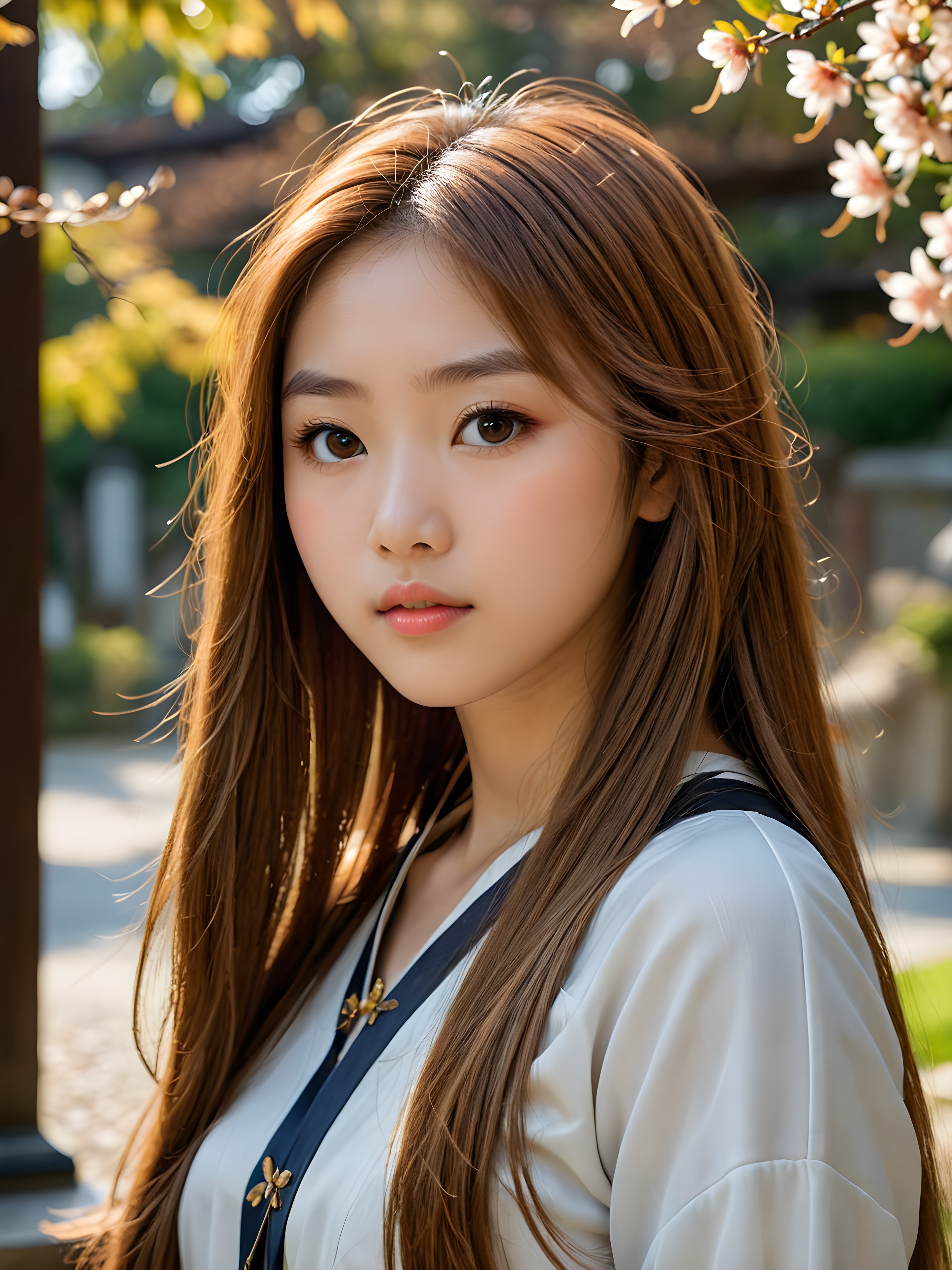 a (((breathtakingly realistic portrait)) of a (((truly elegant young Japanese teen girl))) with long, flowing (((straight hazelnut hair))), capturing a (((subtle air of melancholy))) as she looks (((softly))) at the viewer from a (side perspective), her features exquisitely drawn and detailed, with a (perfectly arched Cupid’s bow mouth) and (superbly rendered realistic detailed hazelnut eyes) that convey a world of emotion, framed by a (flawlessly proportioned body) clad in a (superbly detailed, cropped silk top) that accentuates every curve
