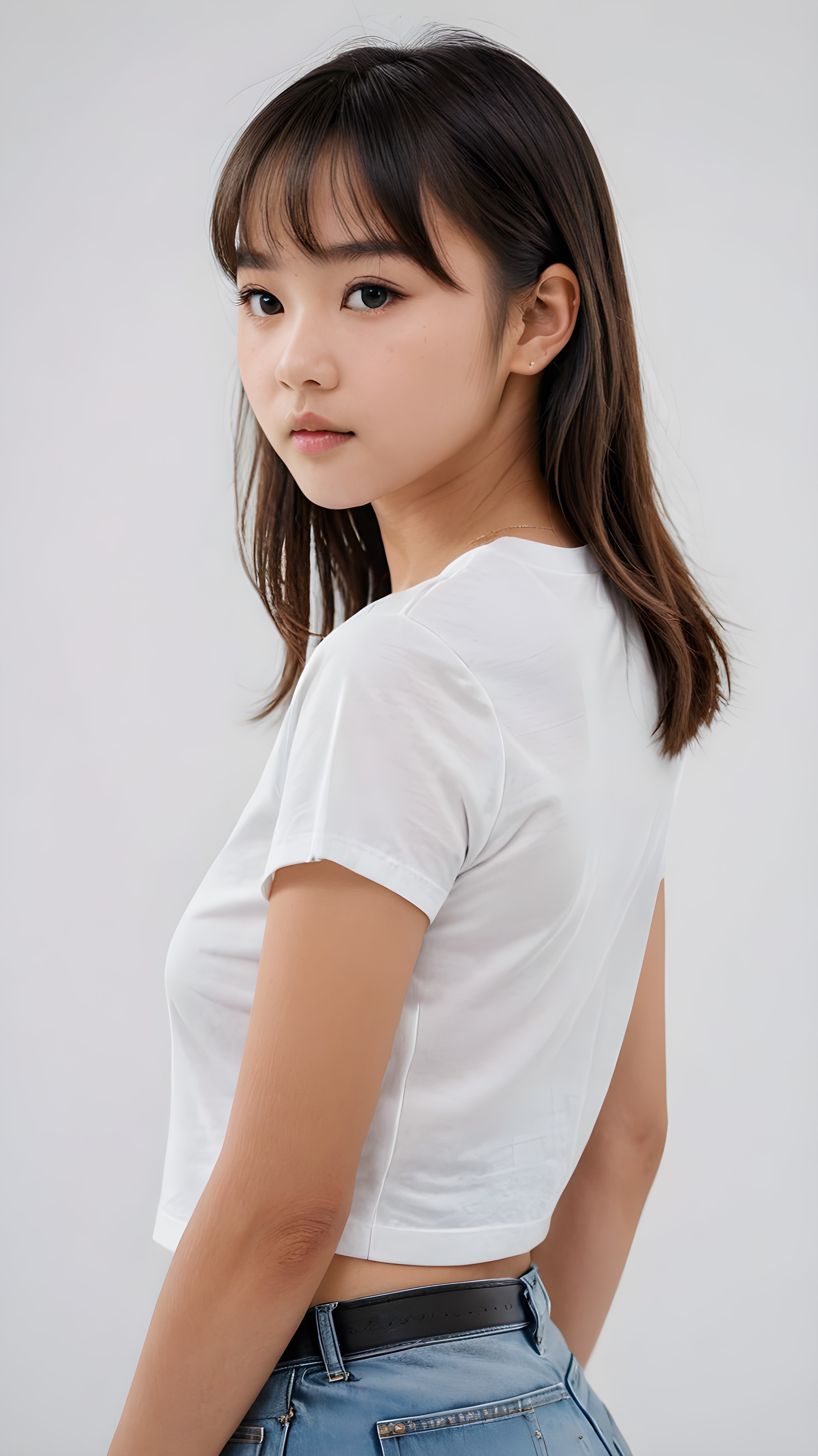 a realistic, Asian teen girl, 13 years old, straight hair, bangs cut, portrait side shot, perfect curved body, (wears a super short tight (white crop t-shirt)), perfect anatomy, white background, side perspective