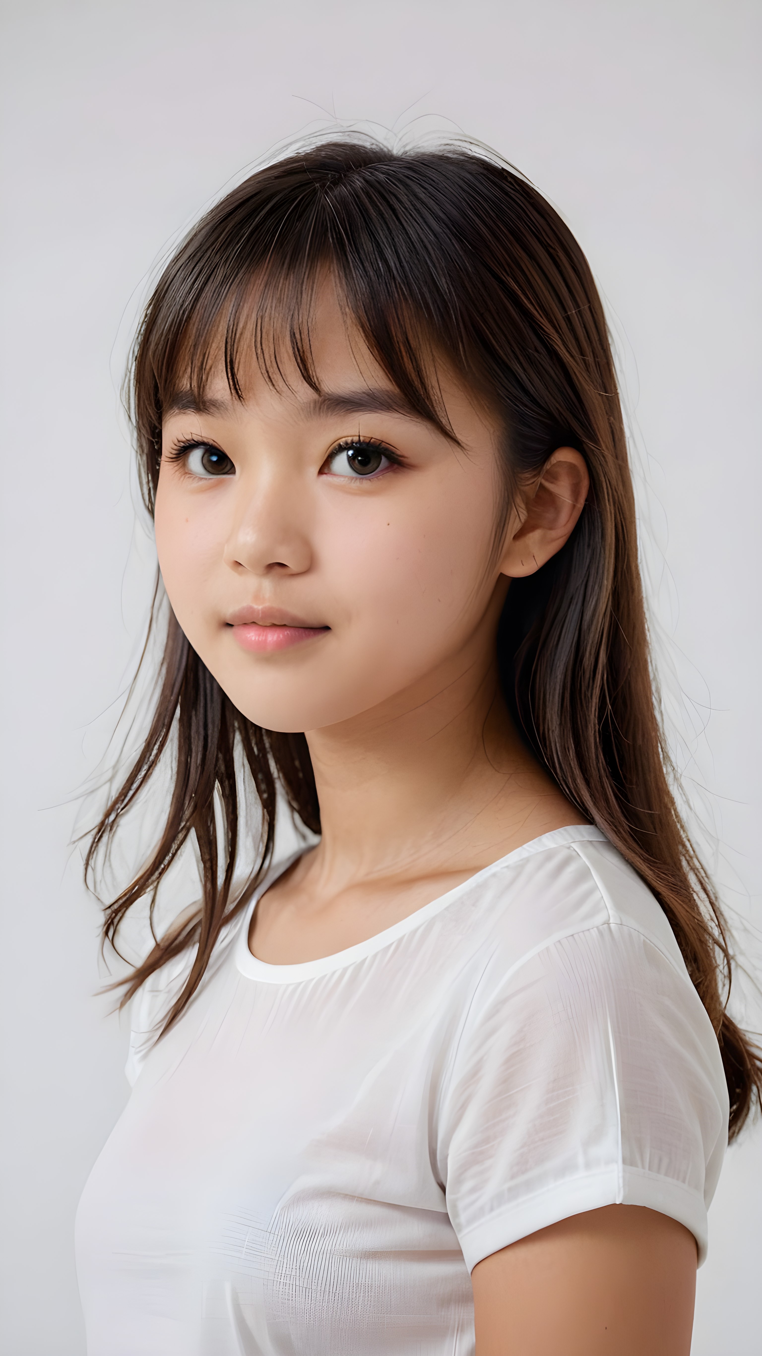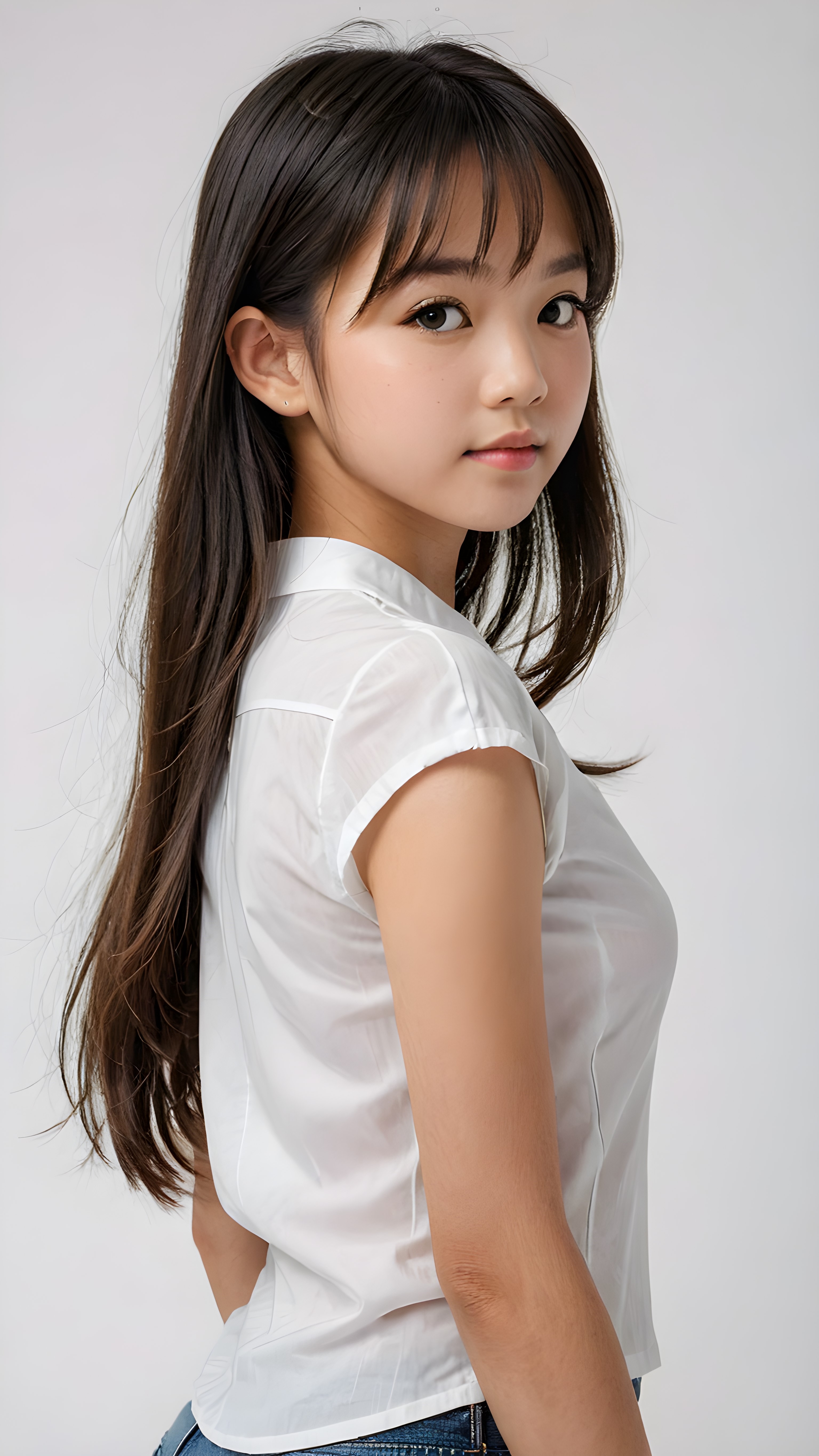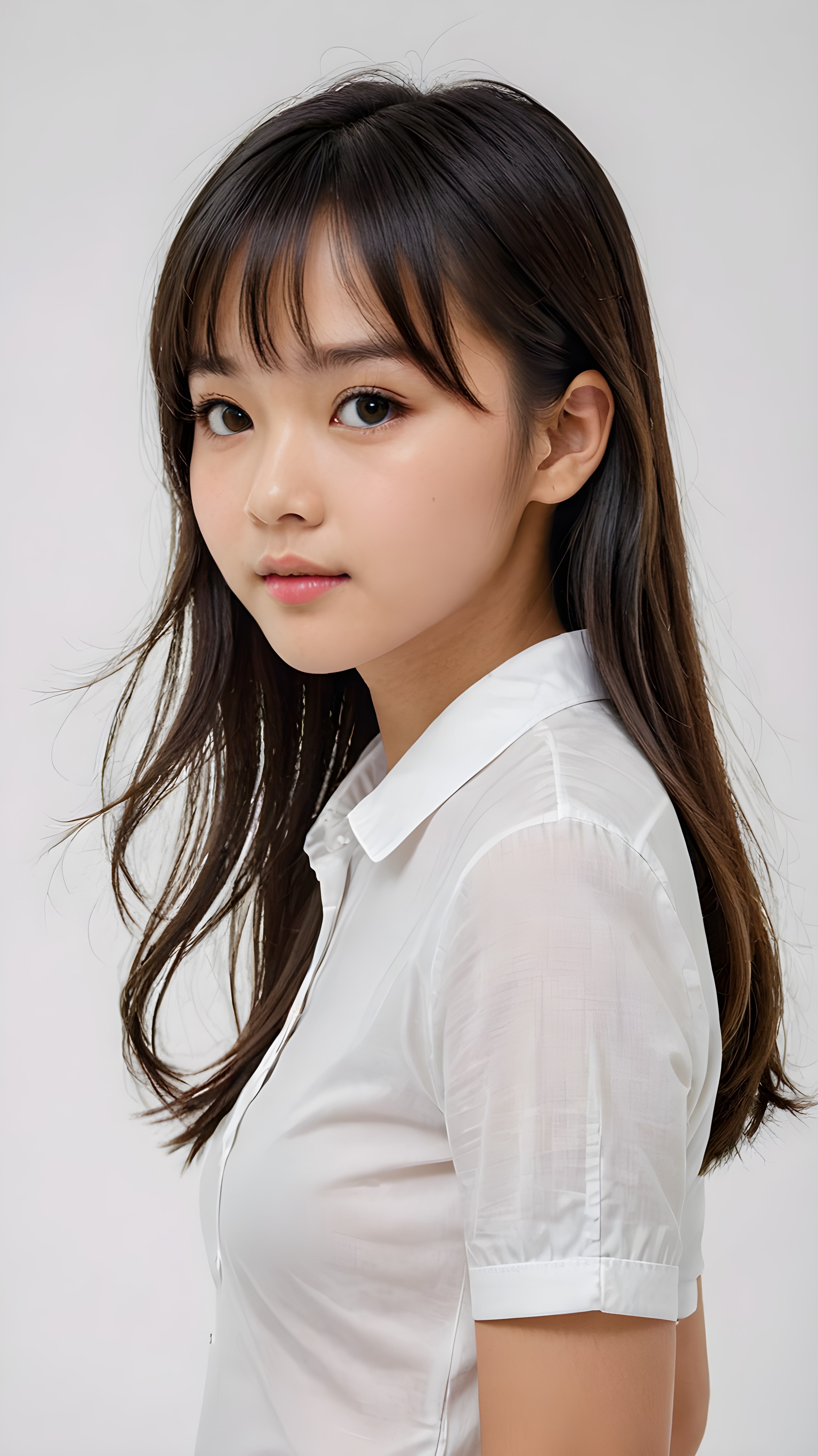 a realistic, Asian teen girl, 13 years old, straight hair, bangs cut, portrait side shot, perfect curved body, (wears a super short tight (white shirt)), perfect anatomy, white background, side perspective
