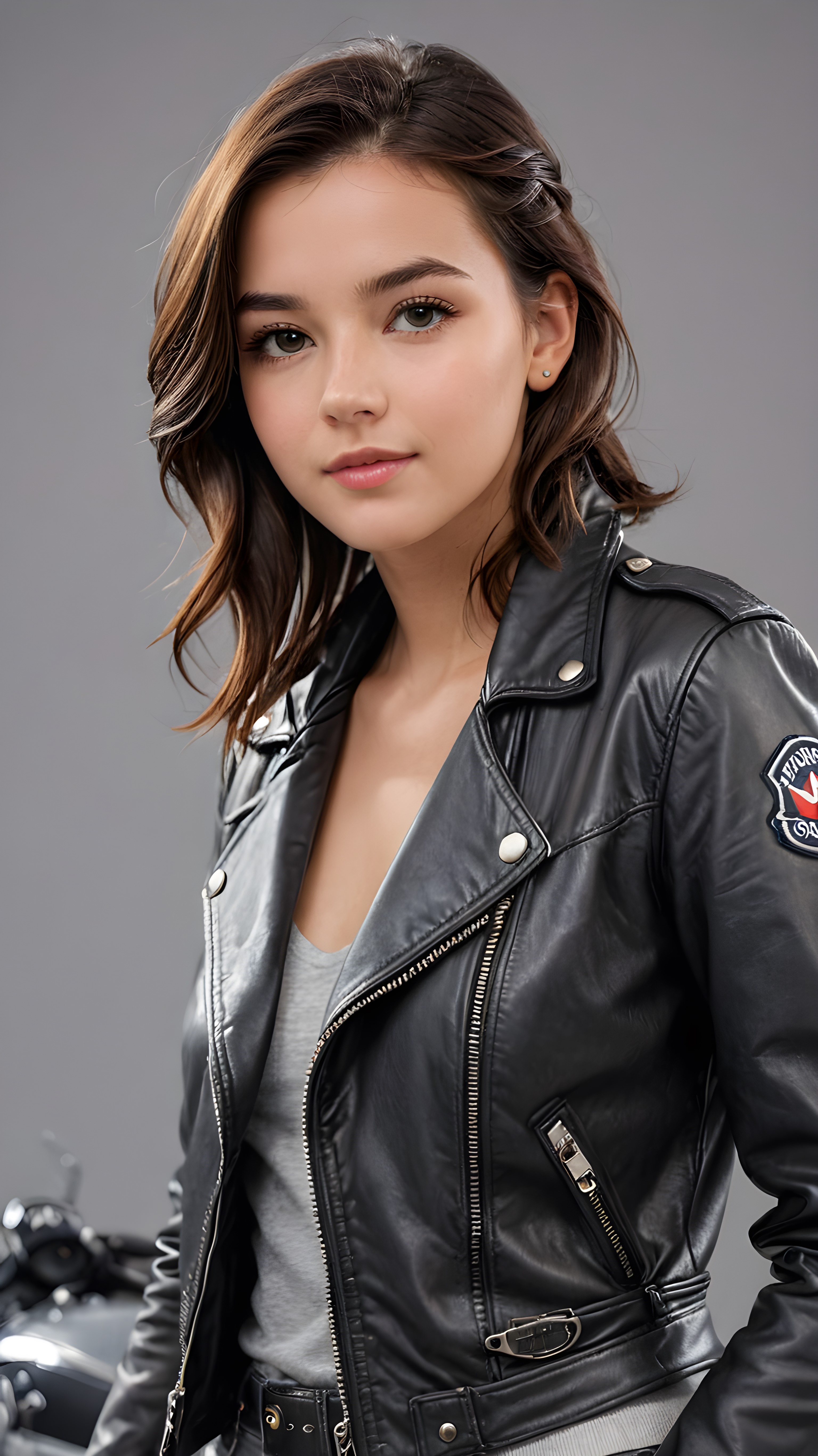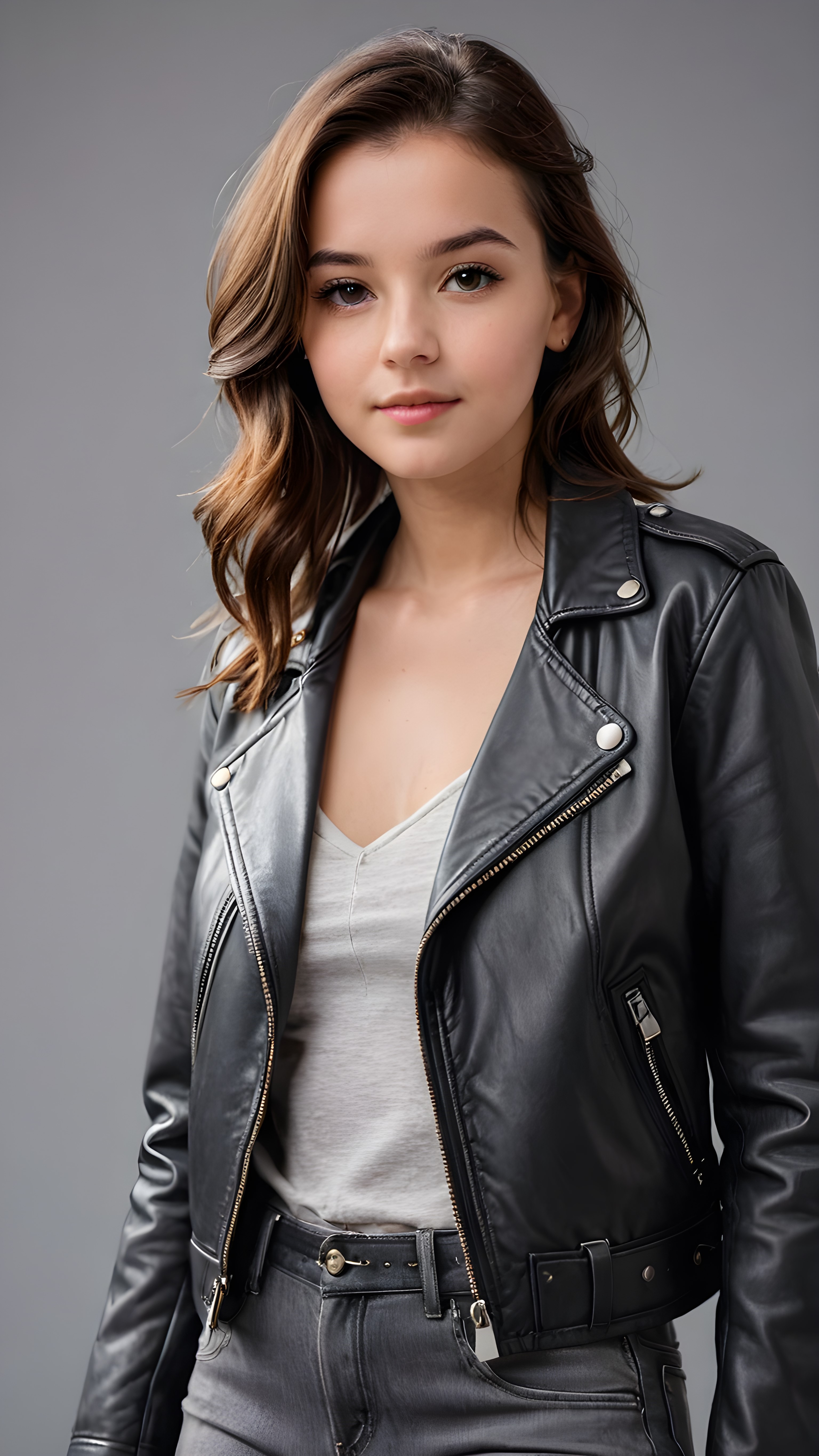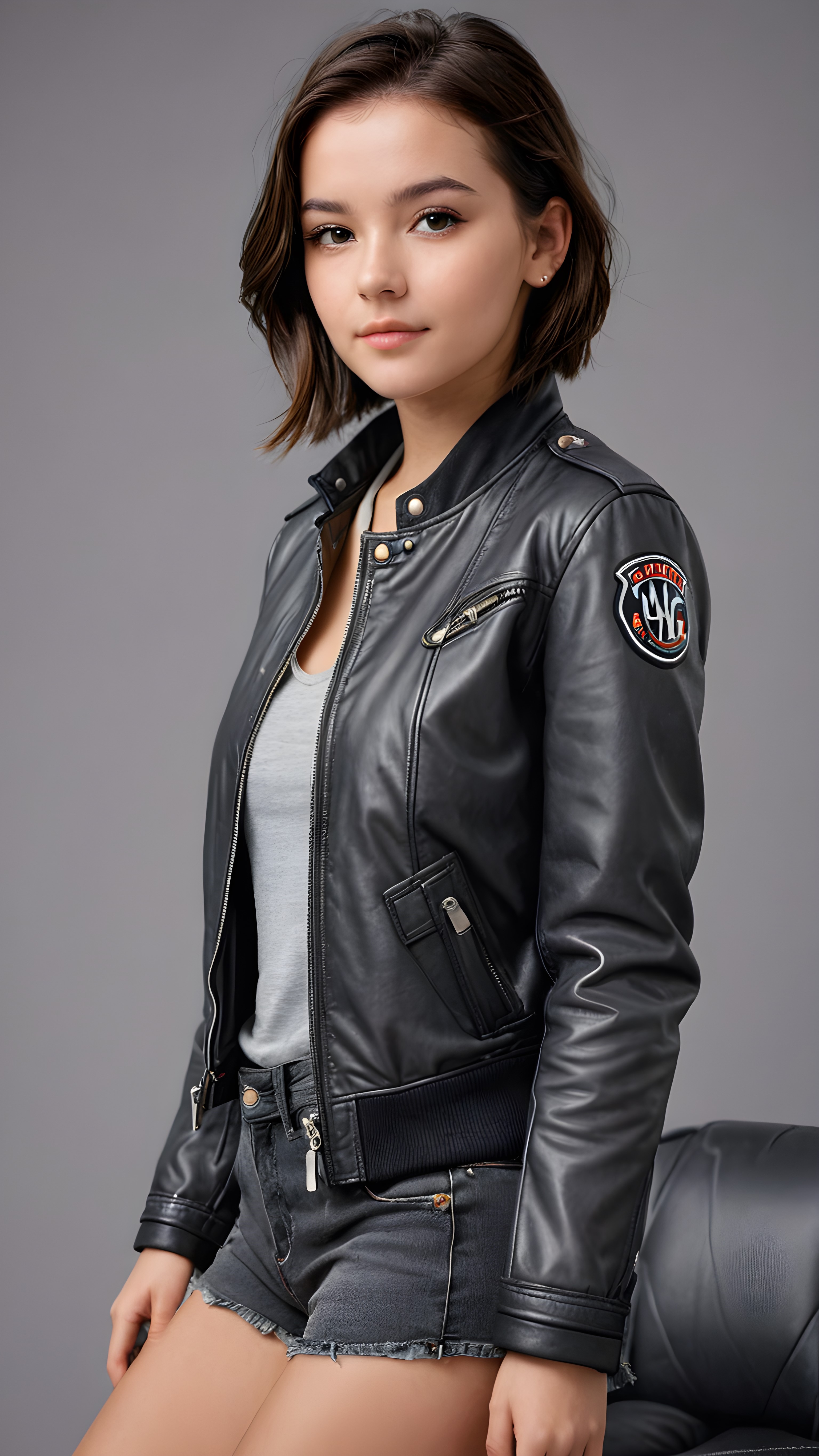 a teen girl, best quality, masterpiece, ultra high resolution, photo realistic, detailed skin, (black short aviator leather jacket), lounging, ((grey background))
