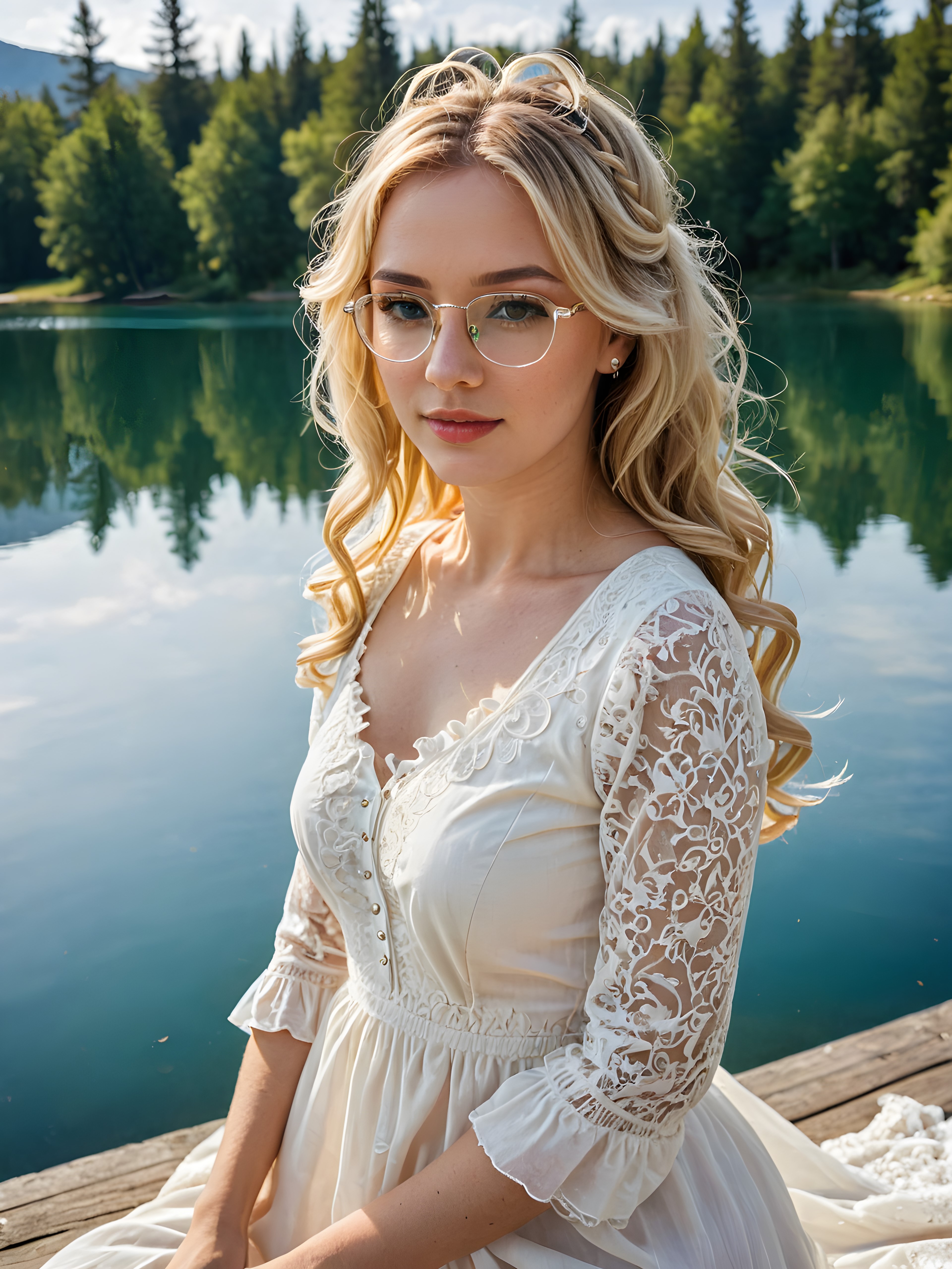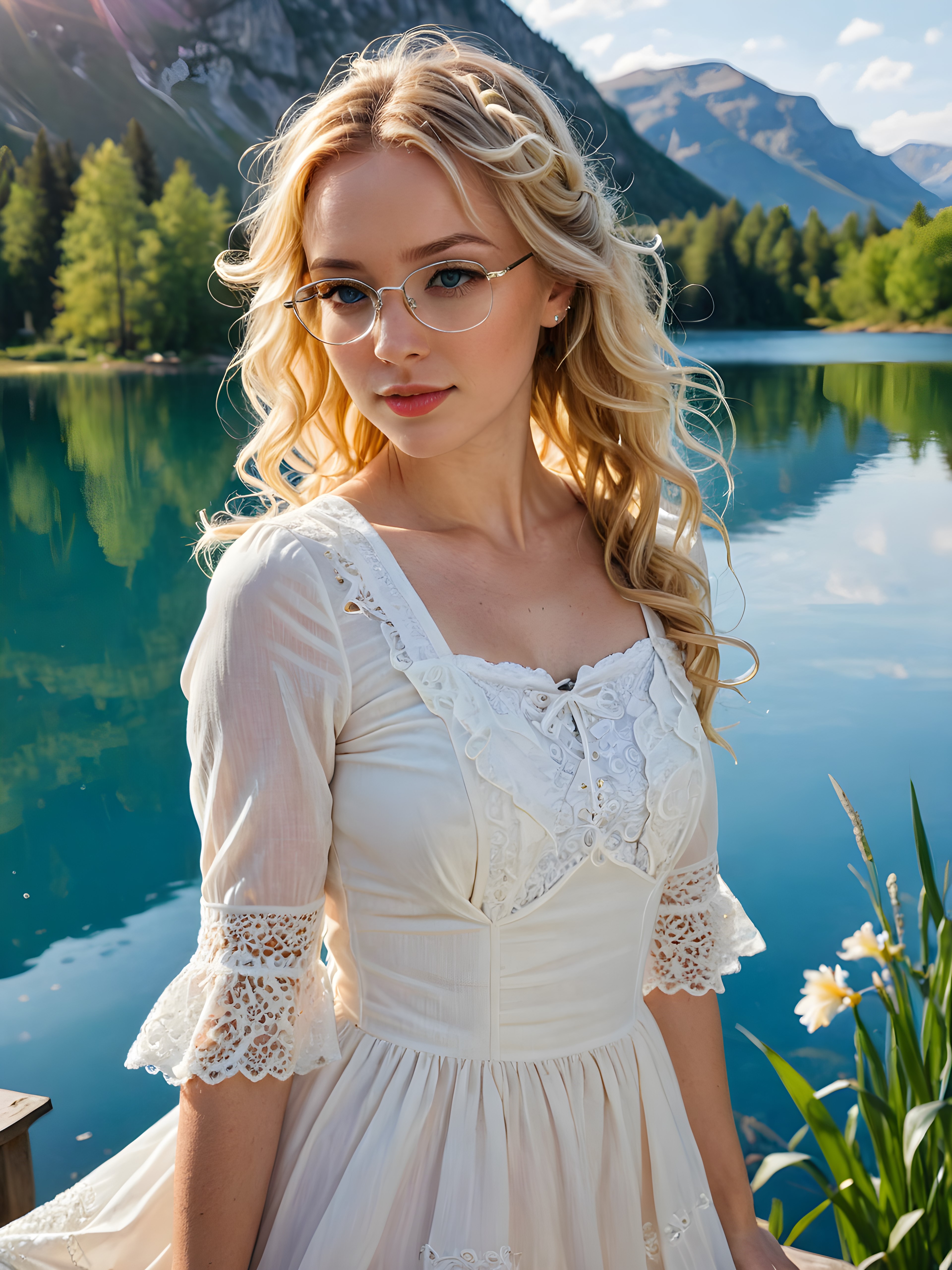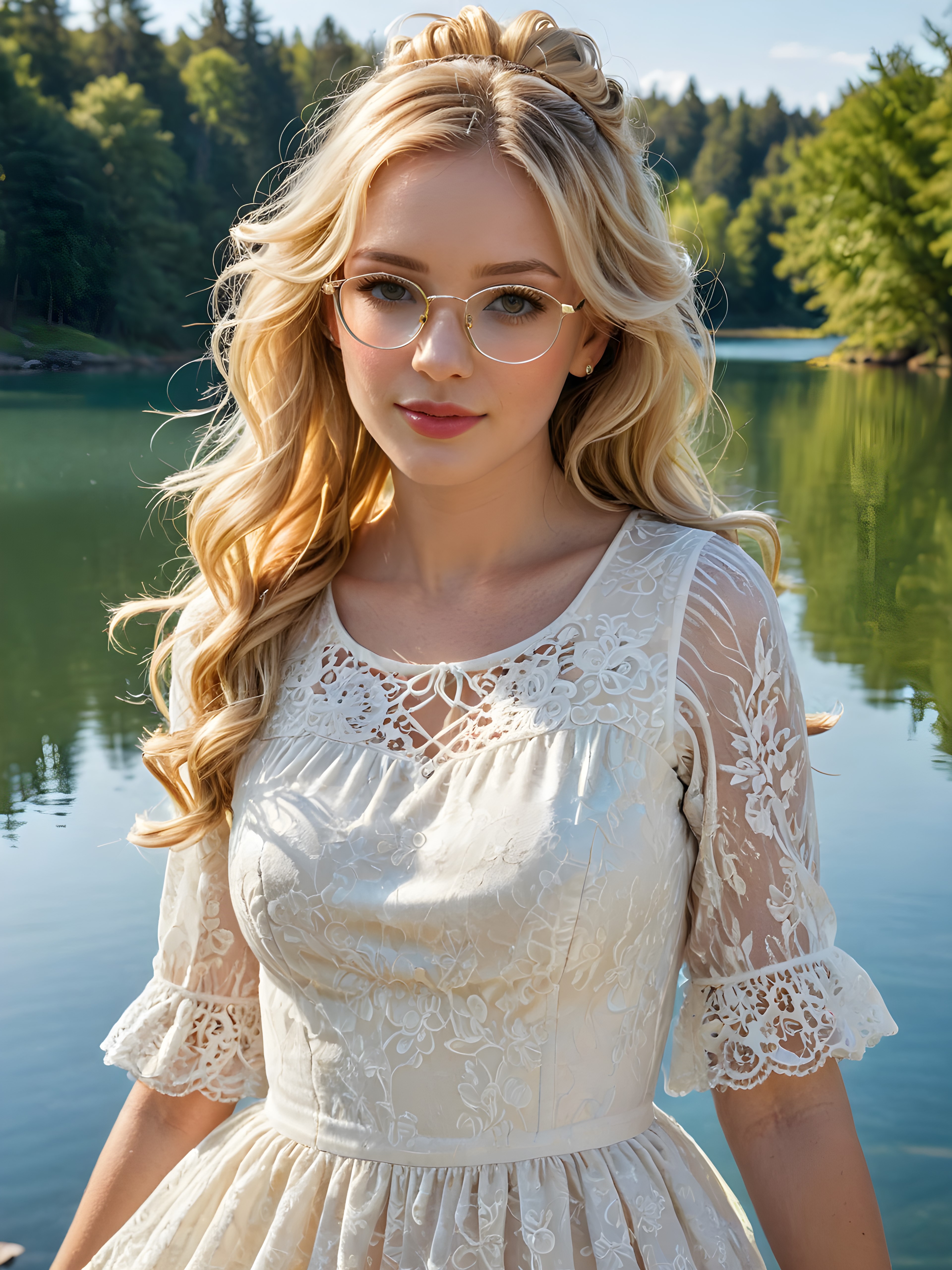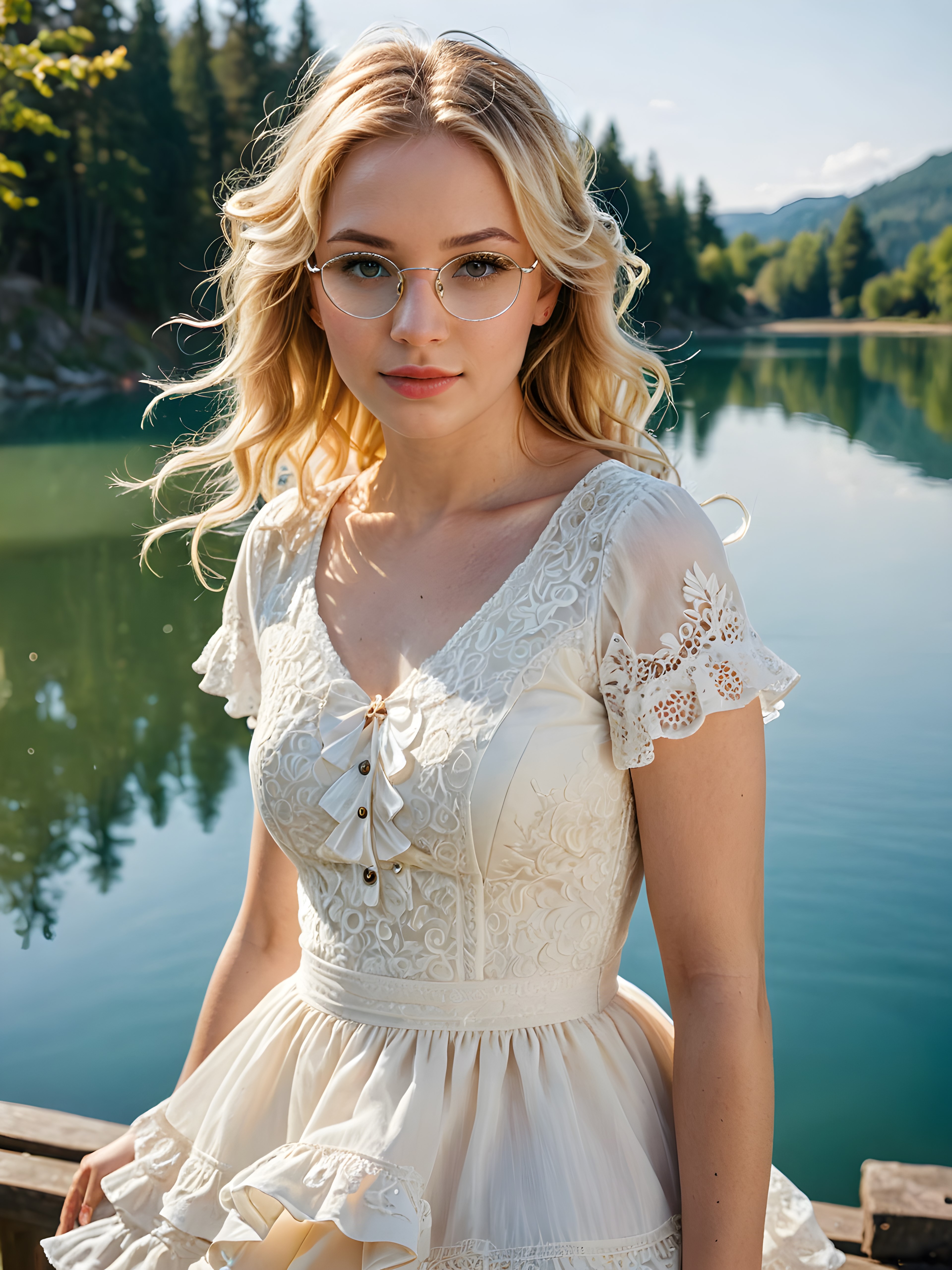 a vivid and intricate (((angelic face))) as a (((mature beautiful woman))), captured in a (((full-body portrait))), set against a sunny day backdrop where a (((young, creamy-white laced and frilly dress girl with long, flowing locks and blonde flippy hair styled into a playful messy bun))), with (((pale skin))), striking greenish-gray irises, and rosy lips, accessorized with (((square-framed glasses))), all contrasting against a (((serene lake))) and an adorable, yellow, fluffy duckling she’s affectionately embracing, details so realistic and advanced they will leave any viewer in awe