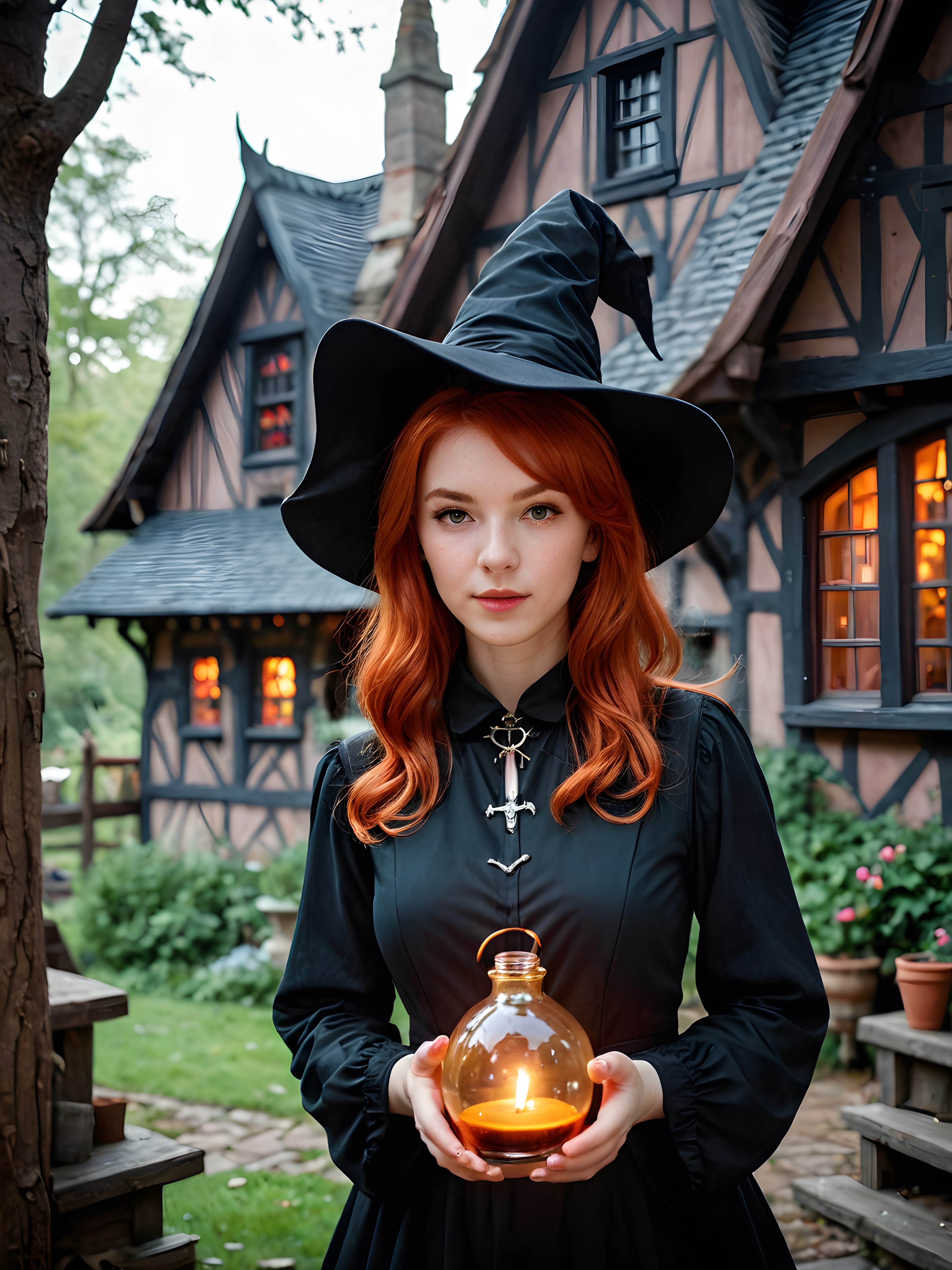 a (((young witch))) with red hair and captivating potion-making, set against a backdrop of a (((witch house))), its shapes and lines abstracted and softly illuminated in a (((gentle, inviting light))), as if emanating from a (close-up) shot, with highly detailed details that bring the scene to life