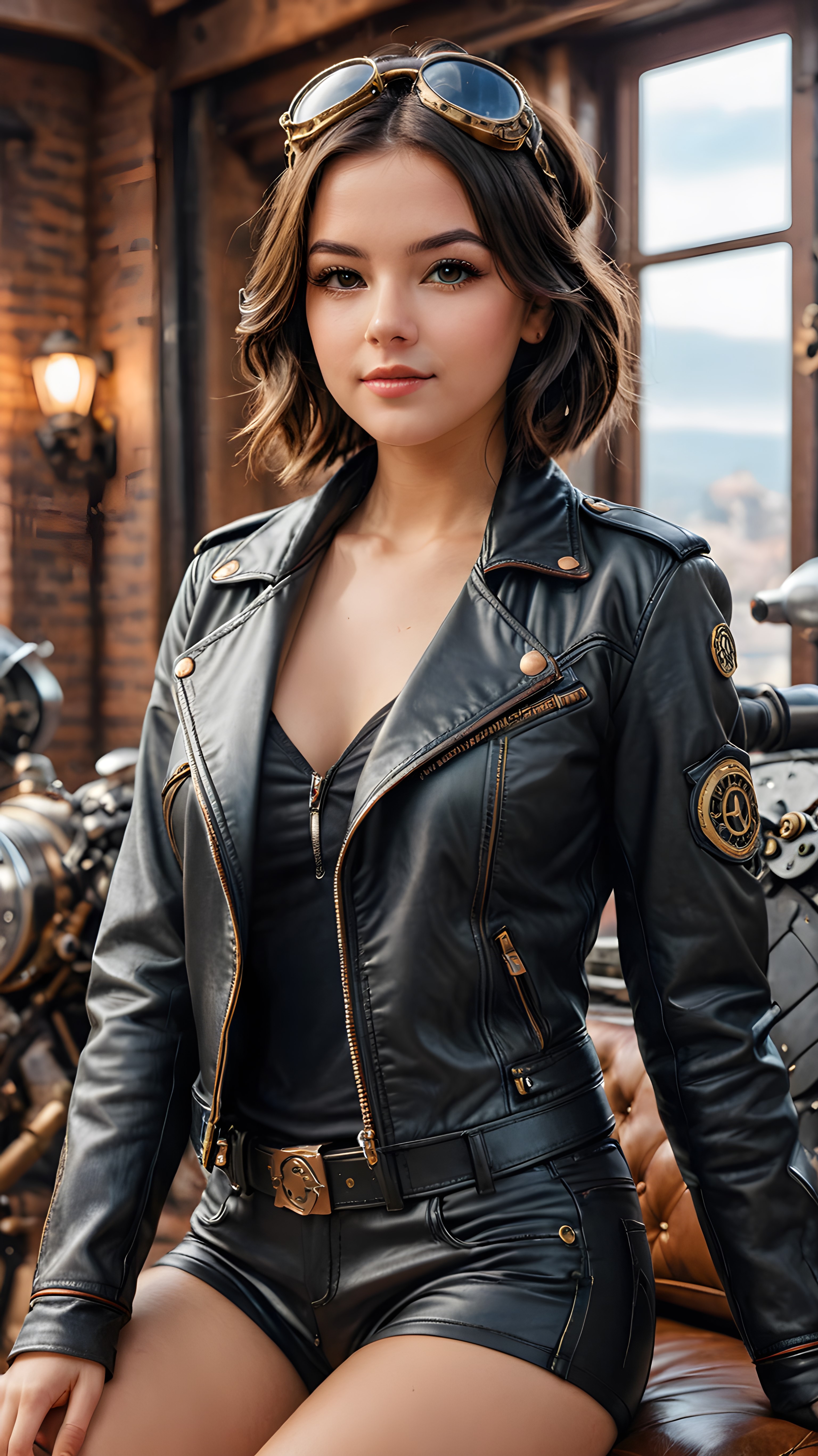 babe best quality, masterpiece, girl, ultra high resolution, photo realistic, detailed skin, (black short steampunk aviator leather jacket), lounging