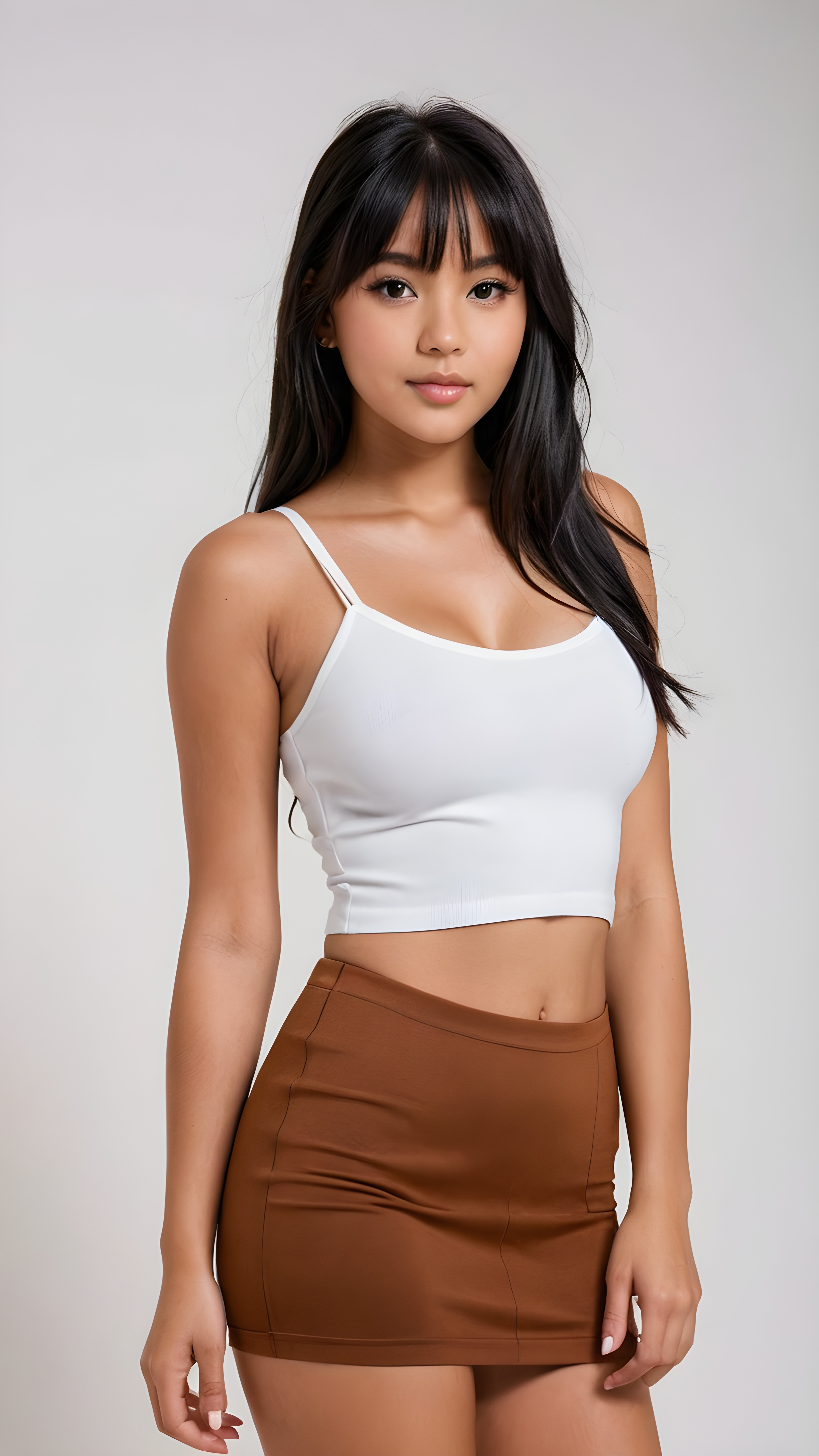 a (((cute young busty Exotic tanned teenage girl))), with long, straight, thick, wavy, jet, shiny black hair, bangs cut frame her face, wearing a (((high cut, tight, spaghetti tank top))), and ((short, round, high-cut, thigh-high mini skirt)), posing perfect, accentuating her ((navel)) and (soft, youthful thighs) ((full body view)) ((white backdrop))