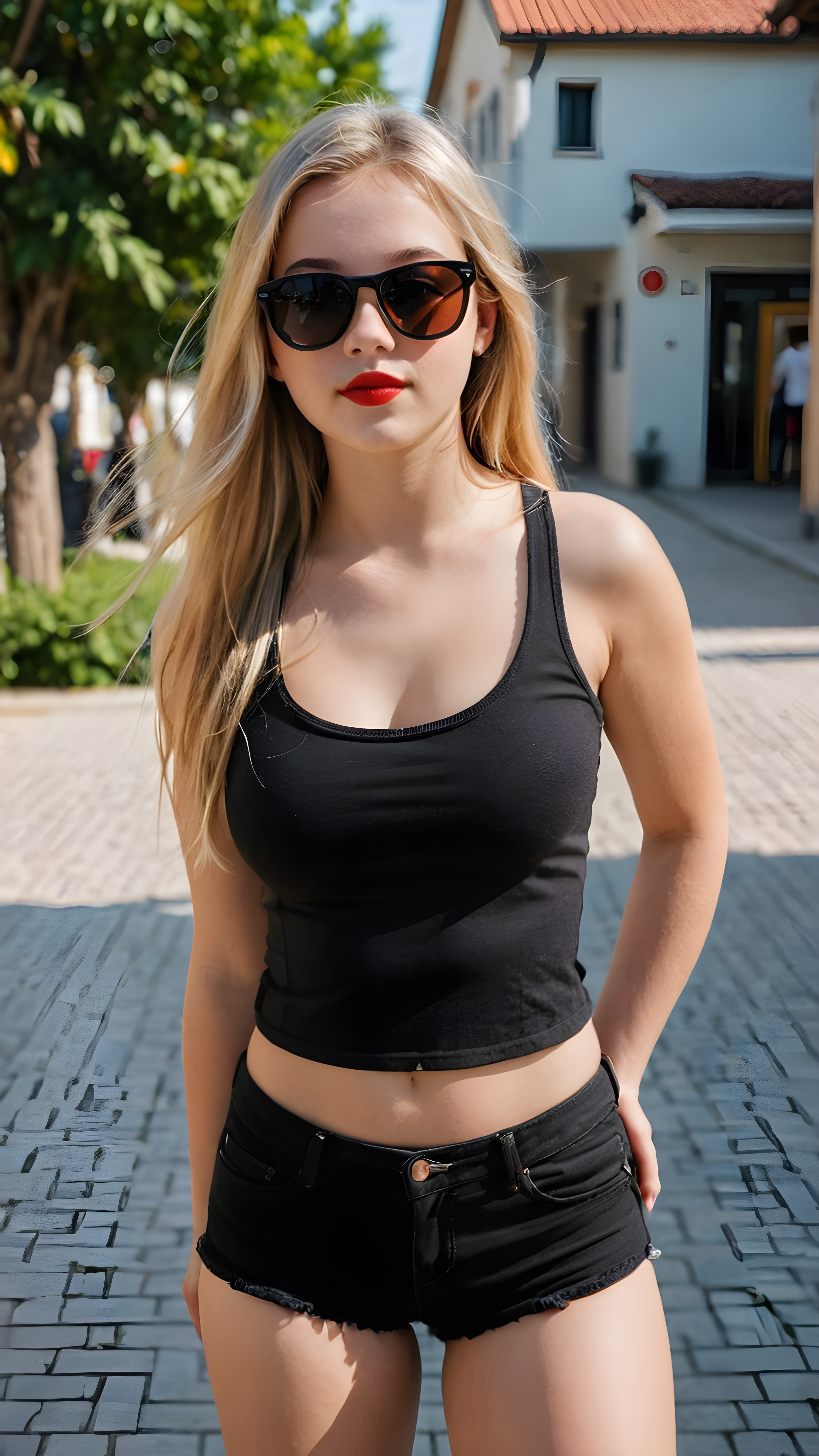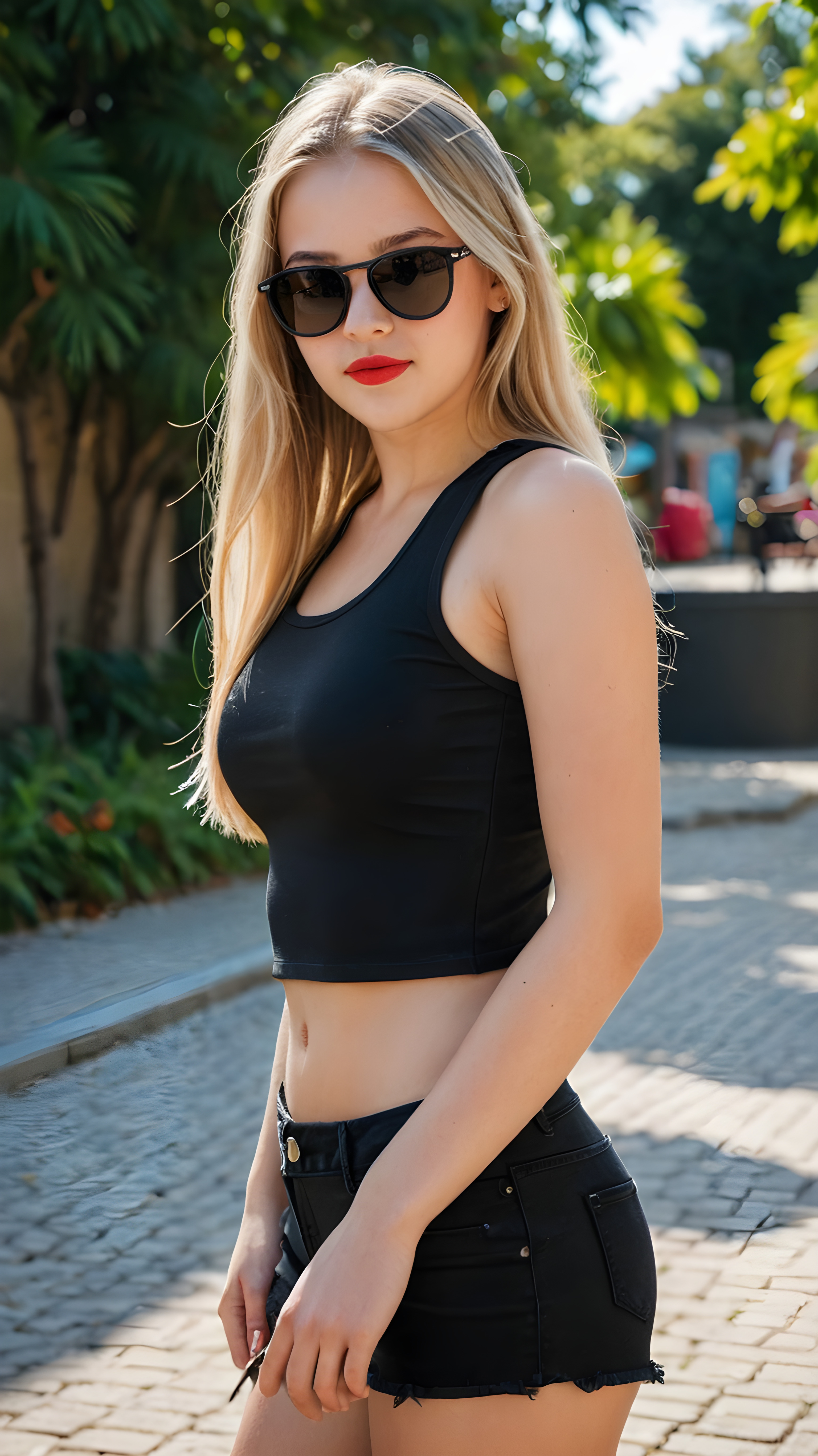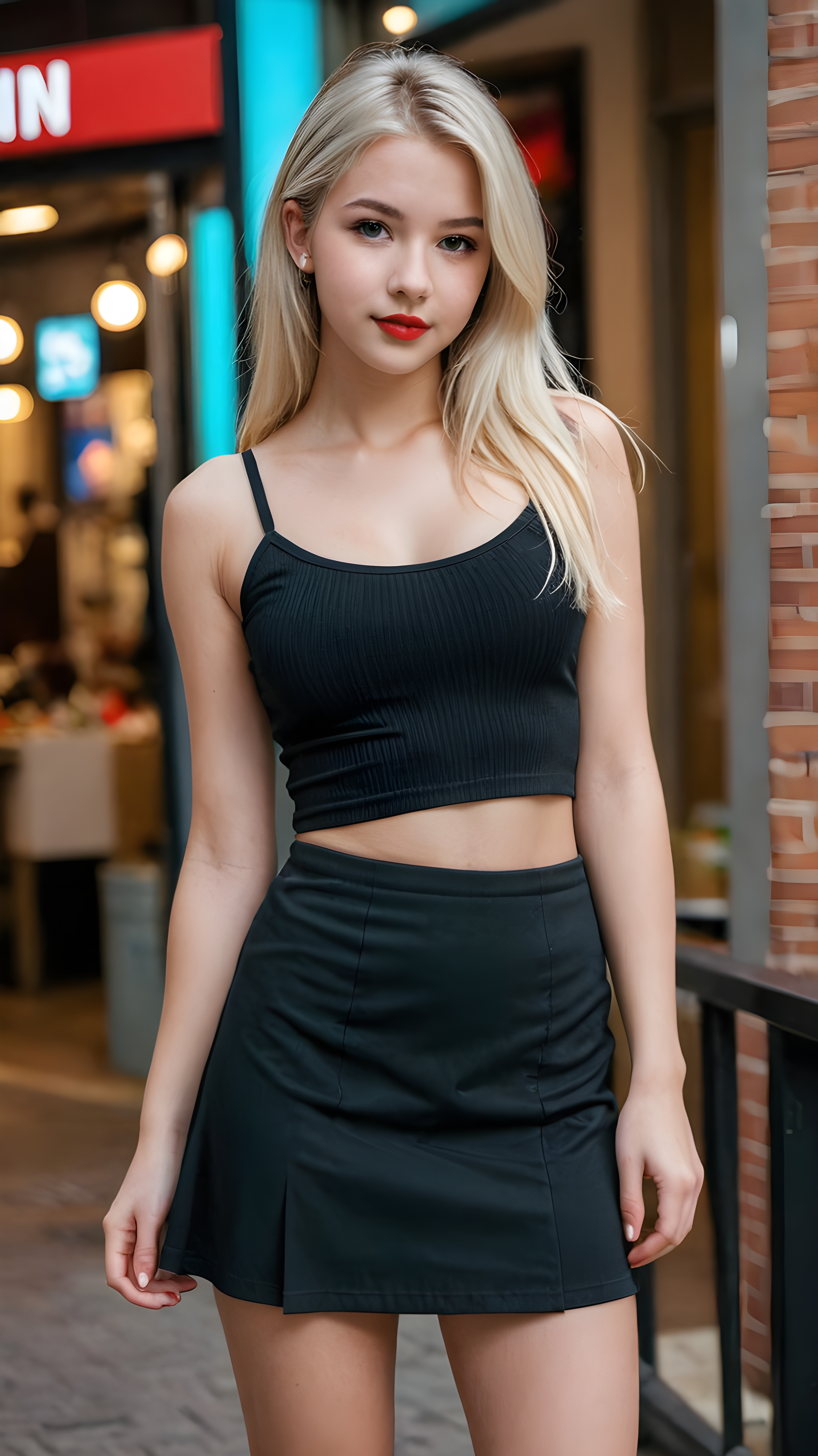 a (((cute young busty teenage girl))), with long, straight, thick, wavy, jet, shiny brown-blond hair and amber eyes, wearing a (((high cut, tight, spaghetti tank top))), and ((short, round, high-cut, thigh-high mini skirt)), posing perfect, accentuating her ((navel)) and (soft, youthful thighs) ((full body view))