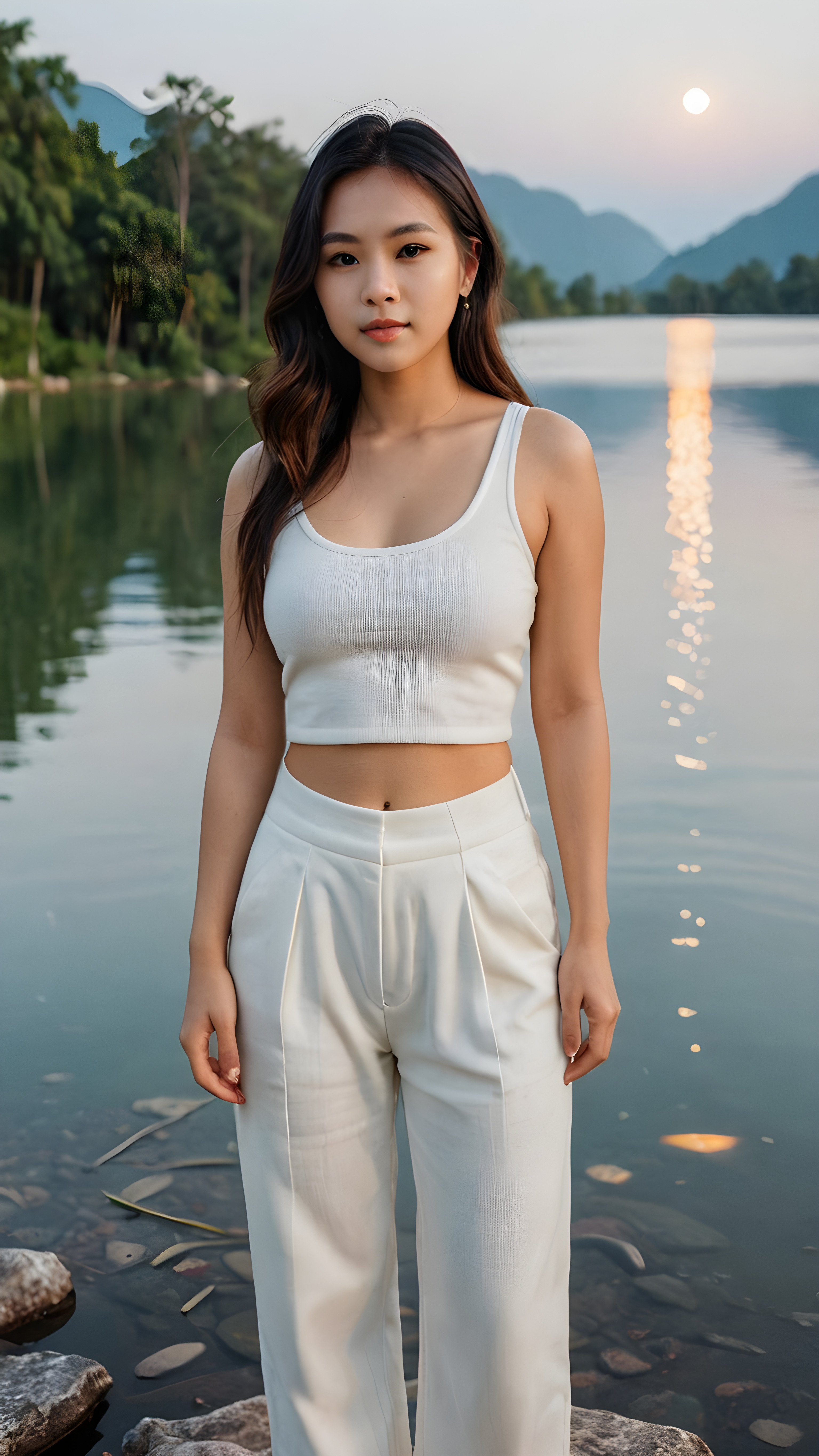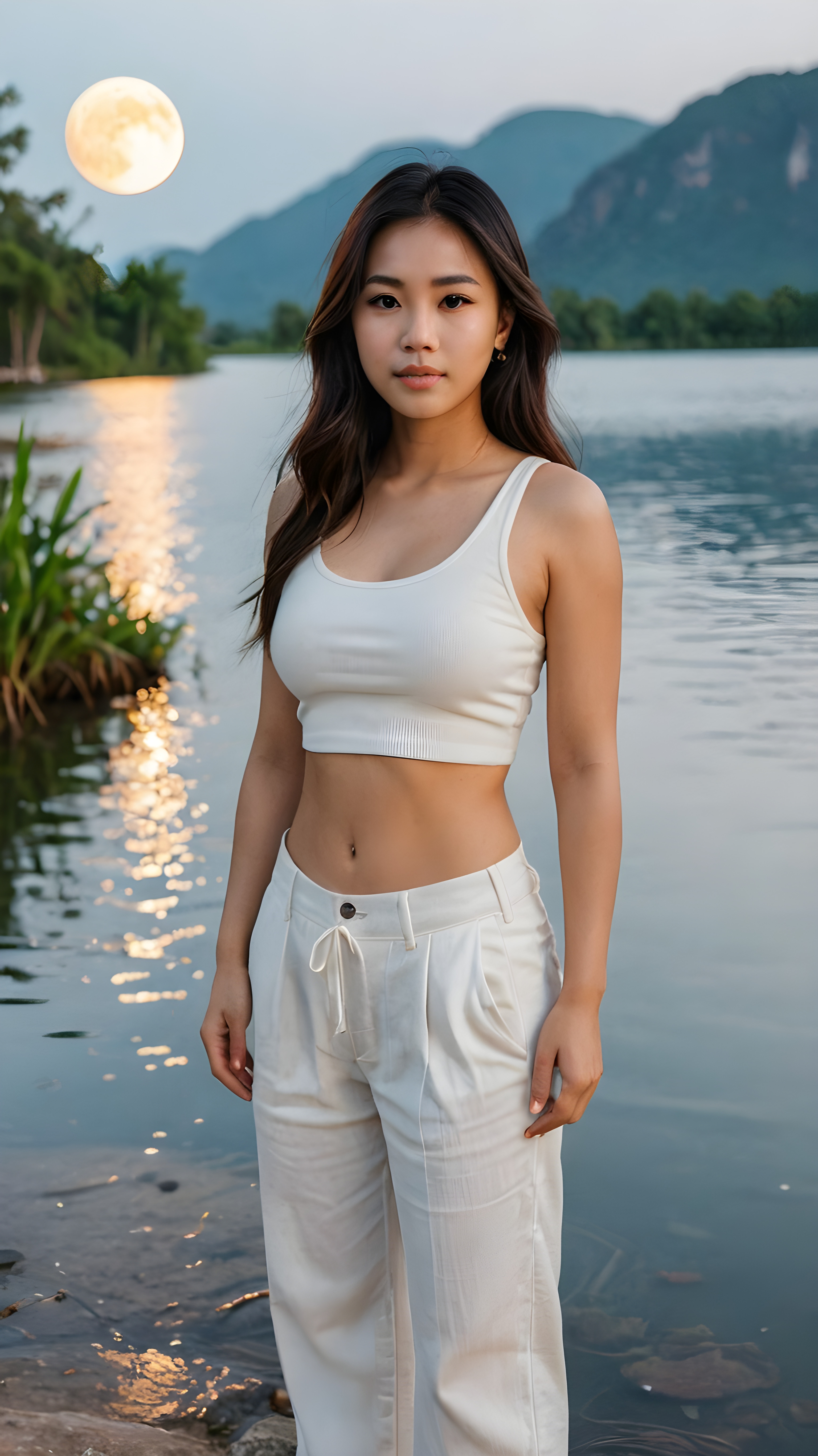 a cute young busty Thai girl with long jet hair, accentuating her (((navel))) with a (white cropped tank top) made of fine wool, wide, baggy white pants, cut to frame her shape, standing in a (beautiful lake) with a (dimmed, detailed, natural light) backdrop, framed by the (melting moon)