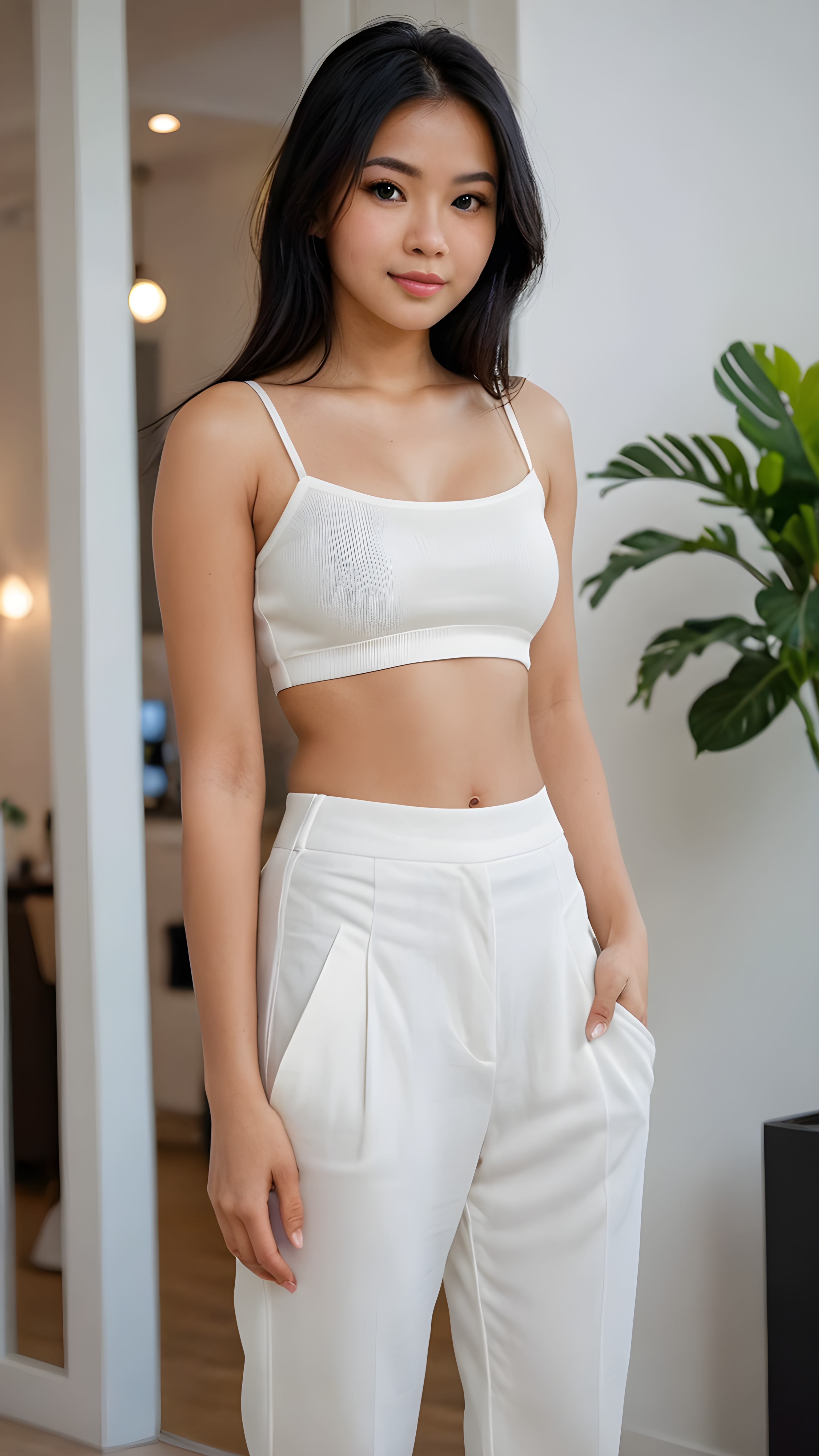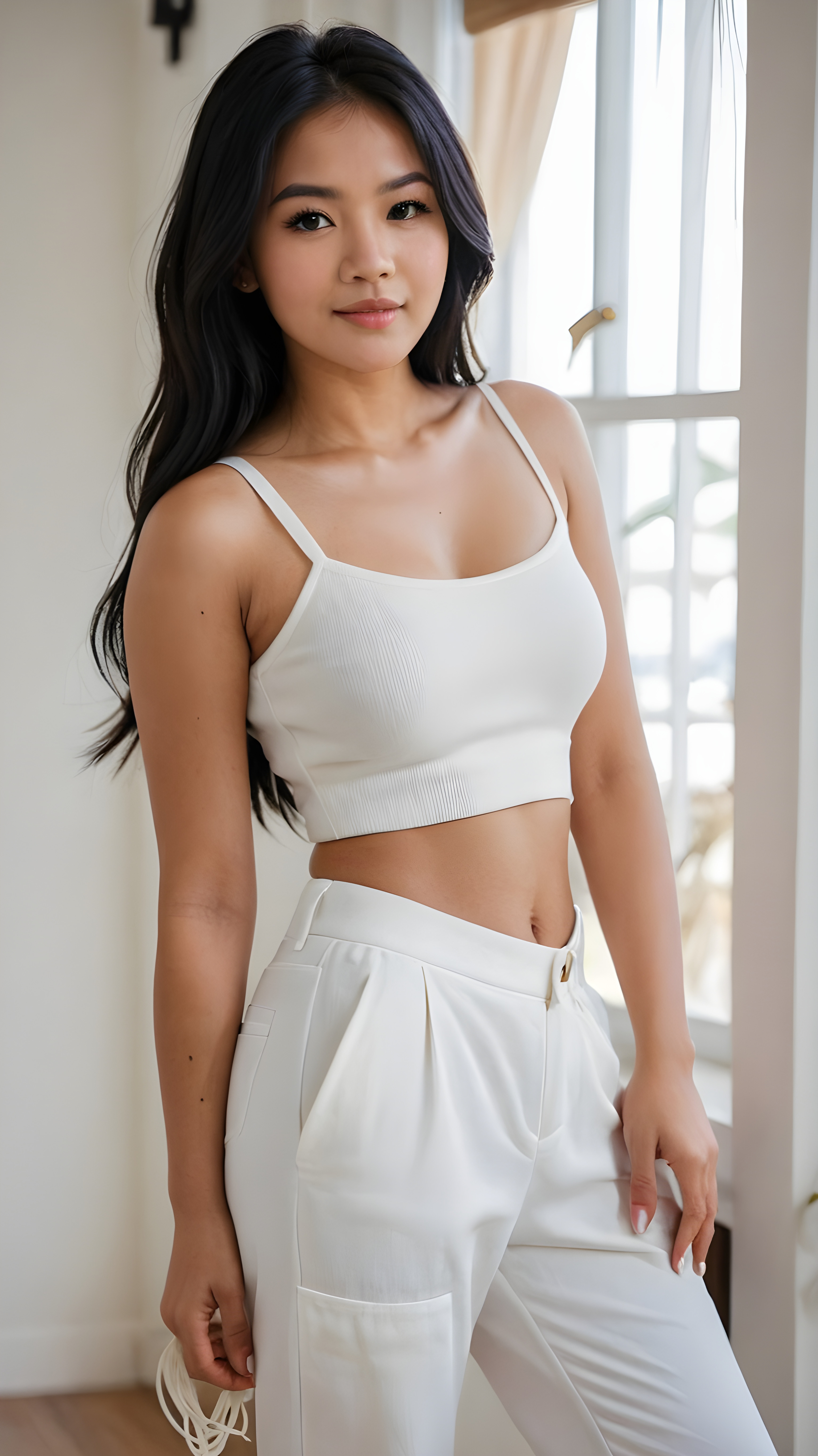 detailed and realistic photo from a cute young busty Filipino girl with long jet black hair, accentuating her (((navel))) with a (white cropped spaghetti tank top) made of fine wool, ((wide, baggy white pants, cut to frame her shape))