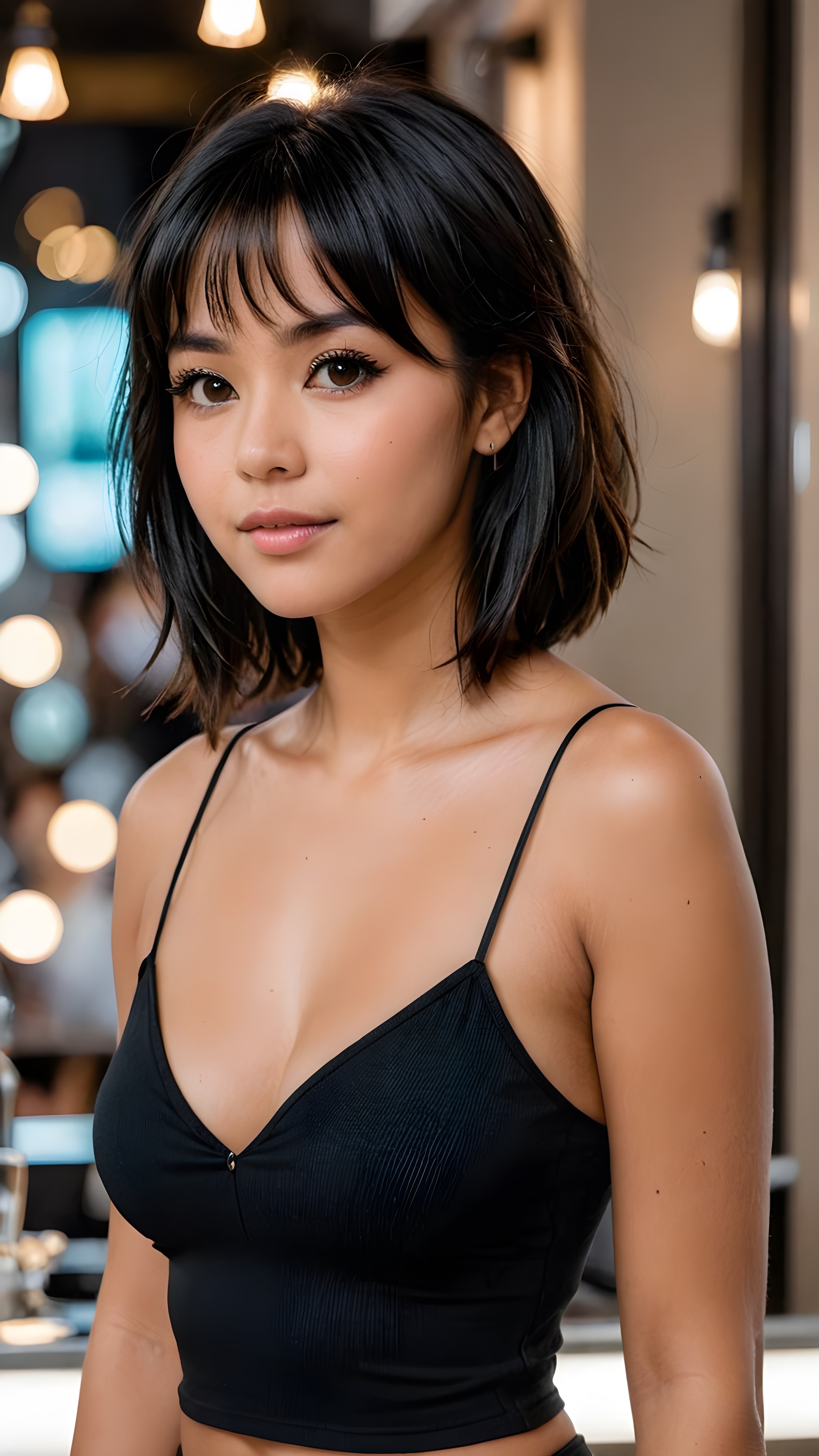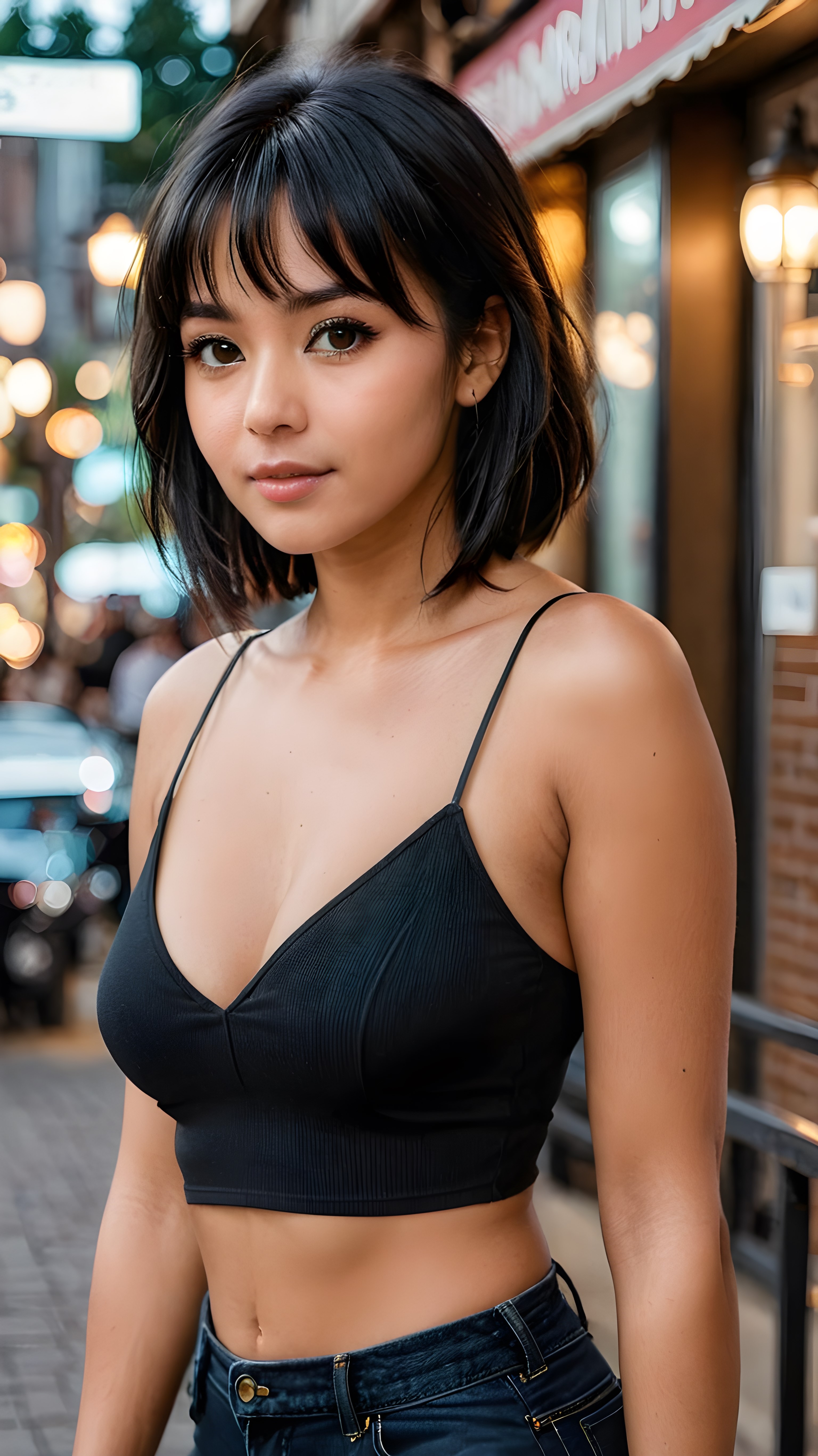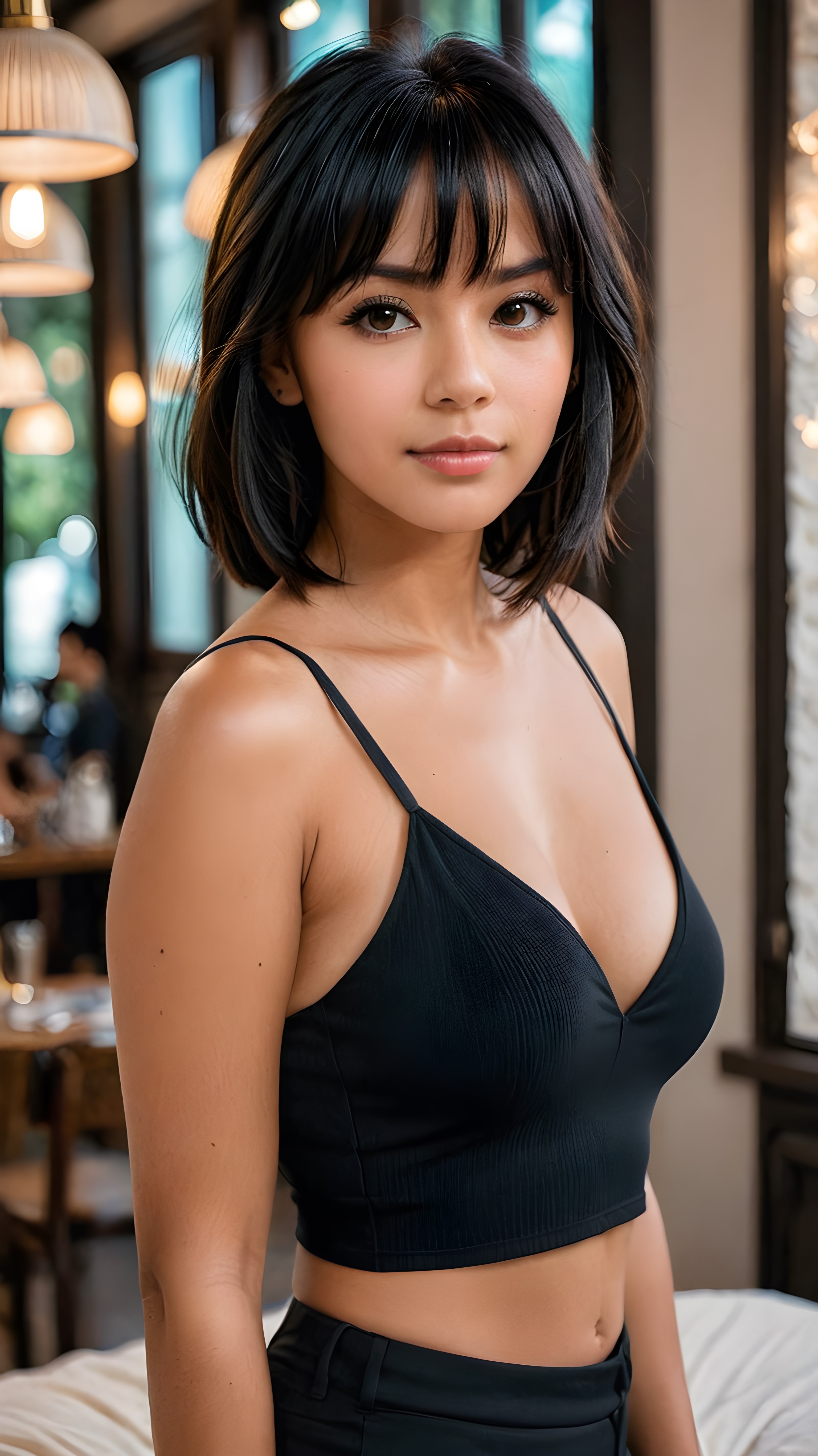 show me a beautiful young busty tanned girl with jet black hair, shoulder length hair, bangs cut, wearing a tight and thin, black spaghetti cropped tank top that support her perfect fit body, deep v-neck