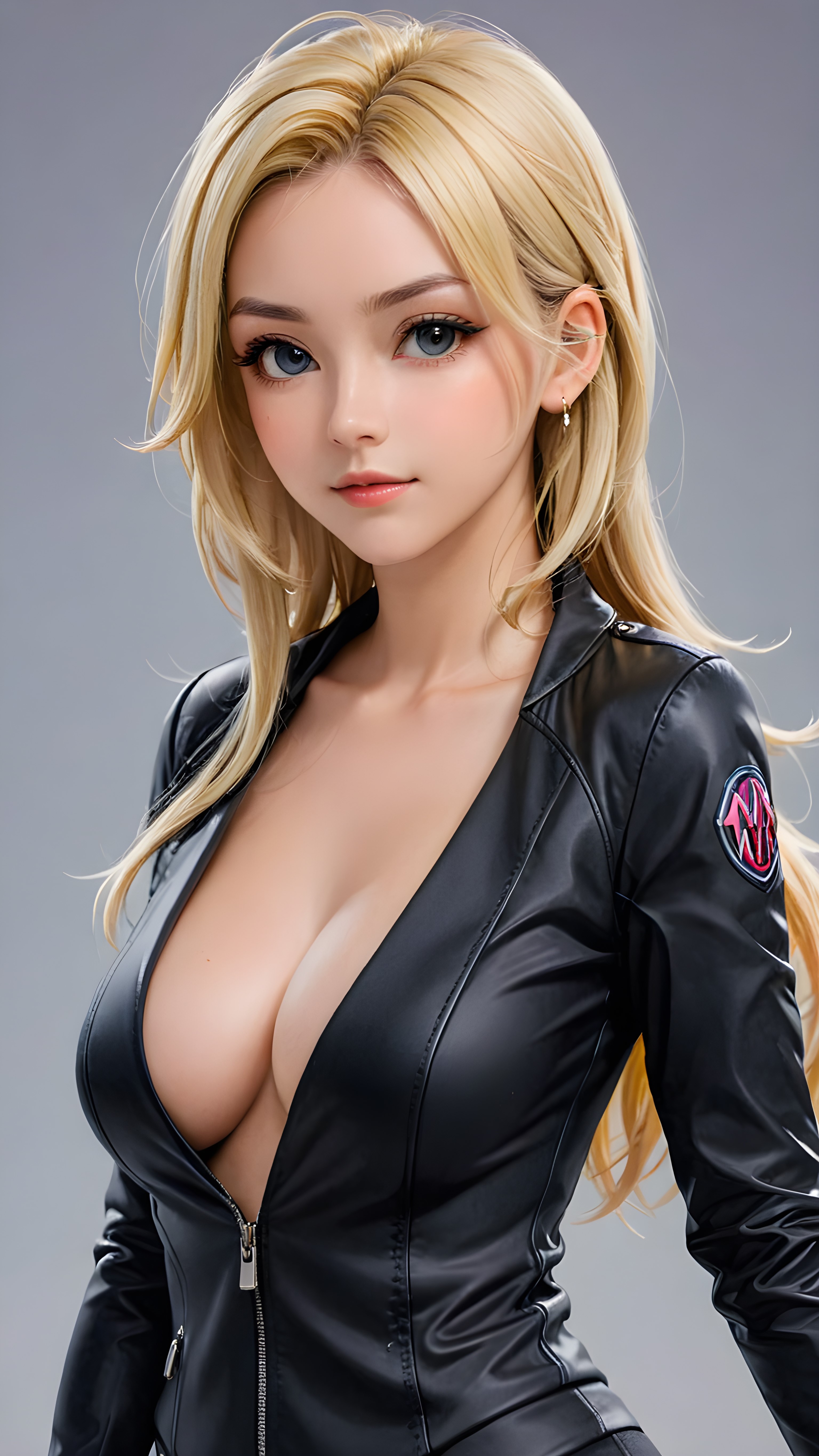 show me a beautiful young busty girl with jet blonde hair, shoulder length hair, wearing a tight and thin, black jacket that support her perfect fit body, deep v-neck totally 100% open front