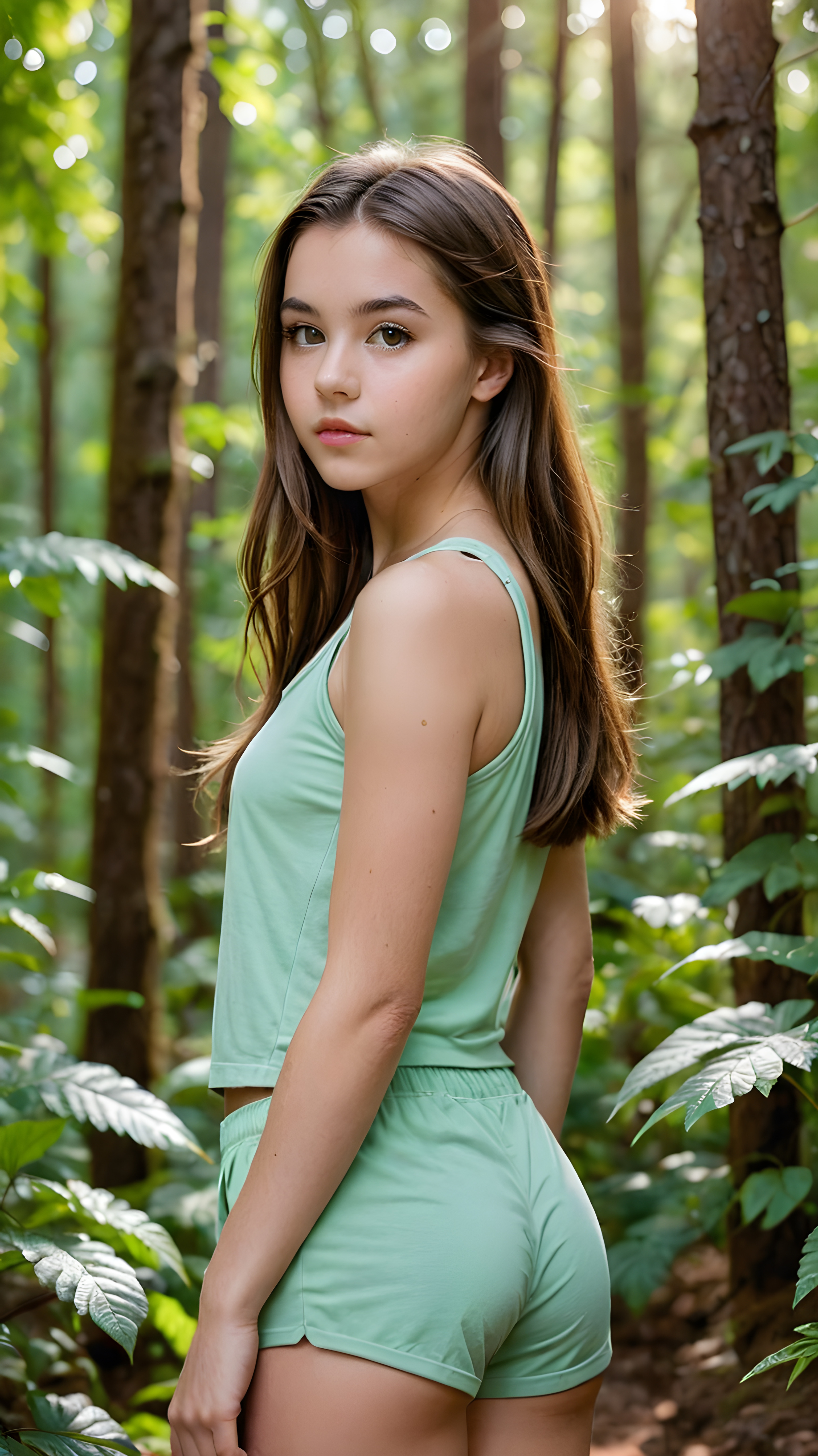 a (((sophisticatedly posed young teen girl))) with luxuriously long, straight brown hair, exquisite big hazel eyes, a perfect pout, and a sculpted, yet fully extended figure, against a softly (((forest backdrop))), wearing a sleek, cropped tank top and shorts that complement her form ((back view))