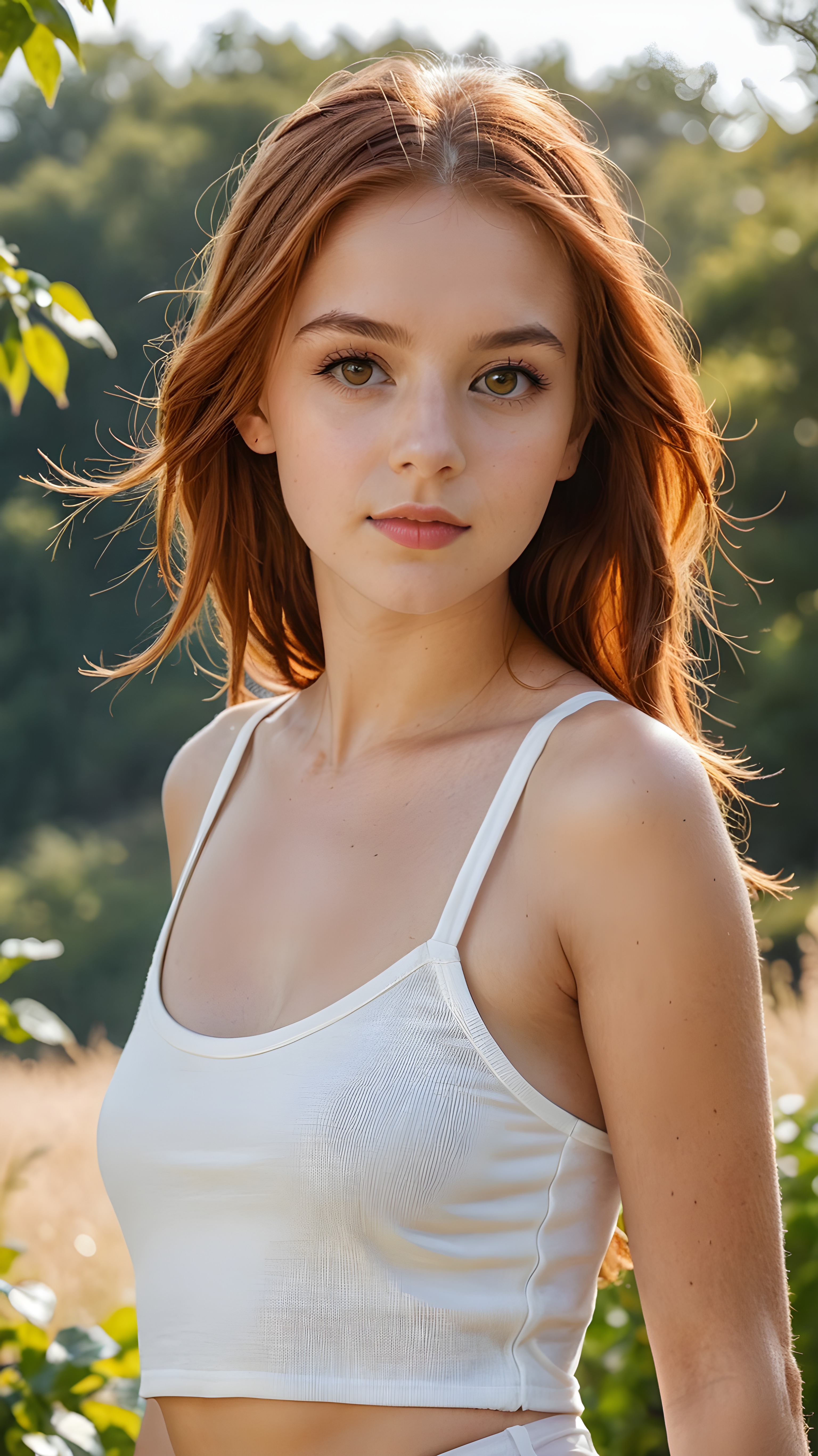 a sophisticated (((intimately posing young teen girl with perfect fit body))) with flowing, soft long straight red hair, beautiful big (amber eyes), super short white crop sport tank top, ((natural sunny backdrop))