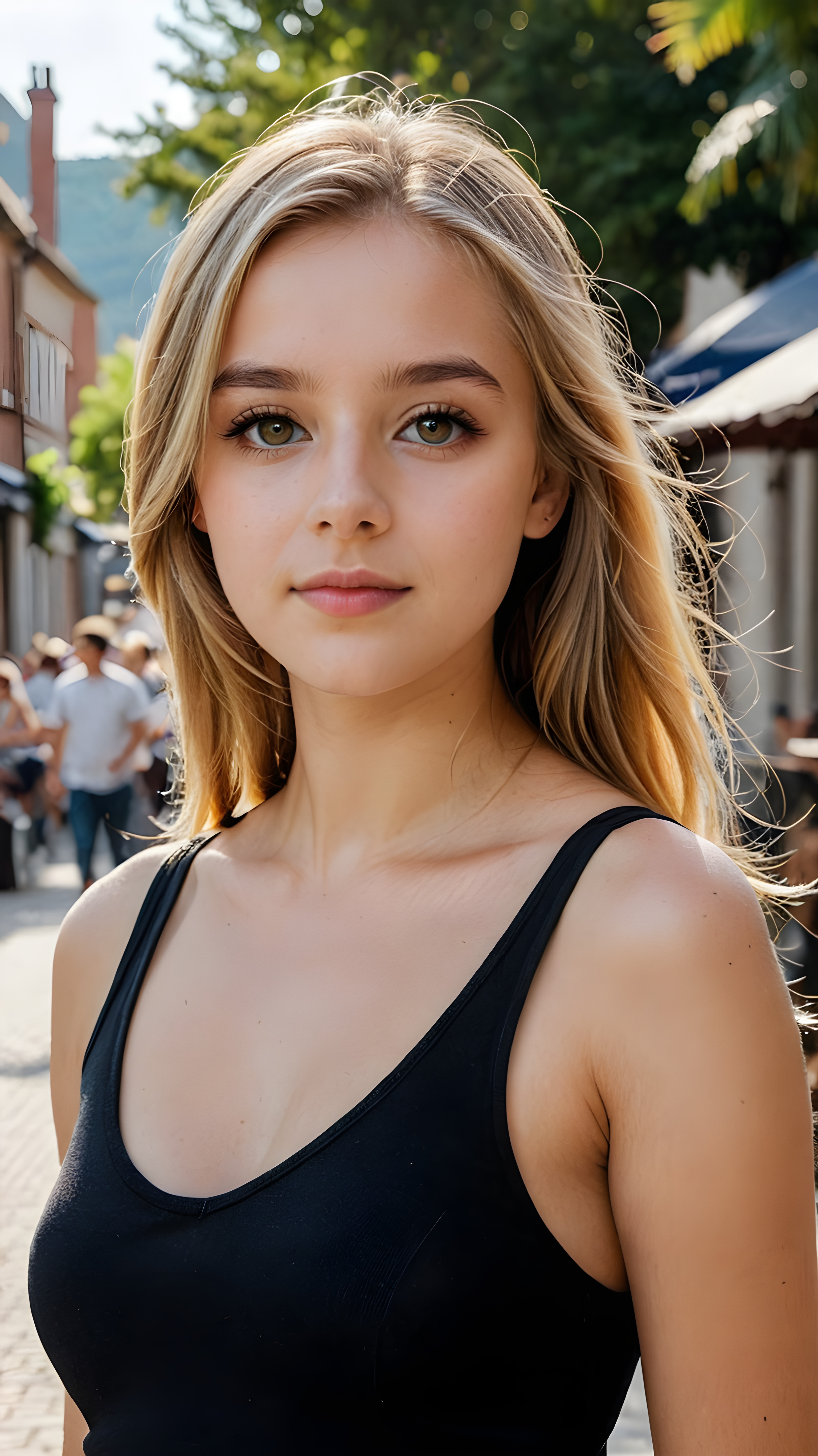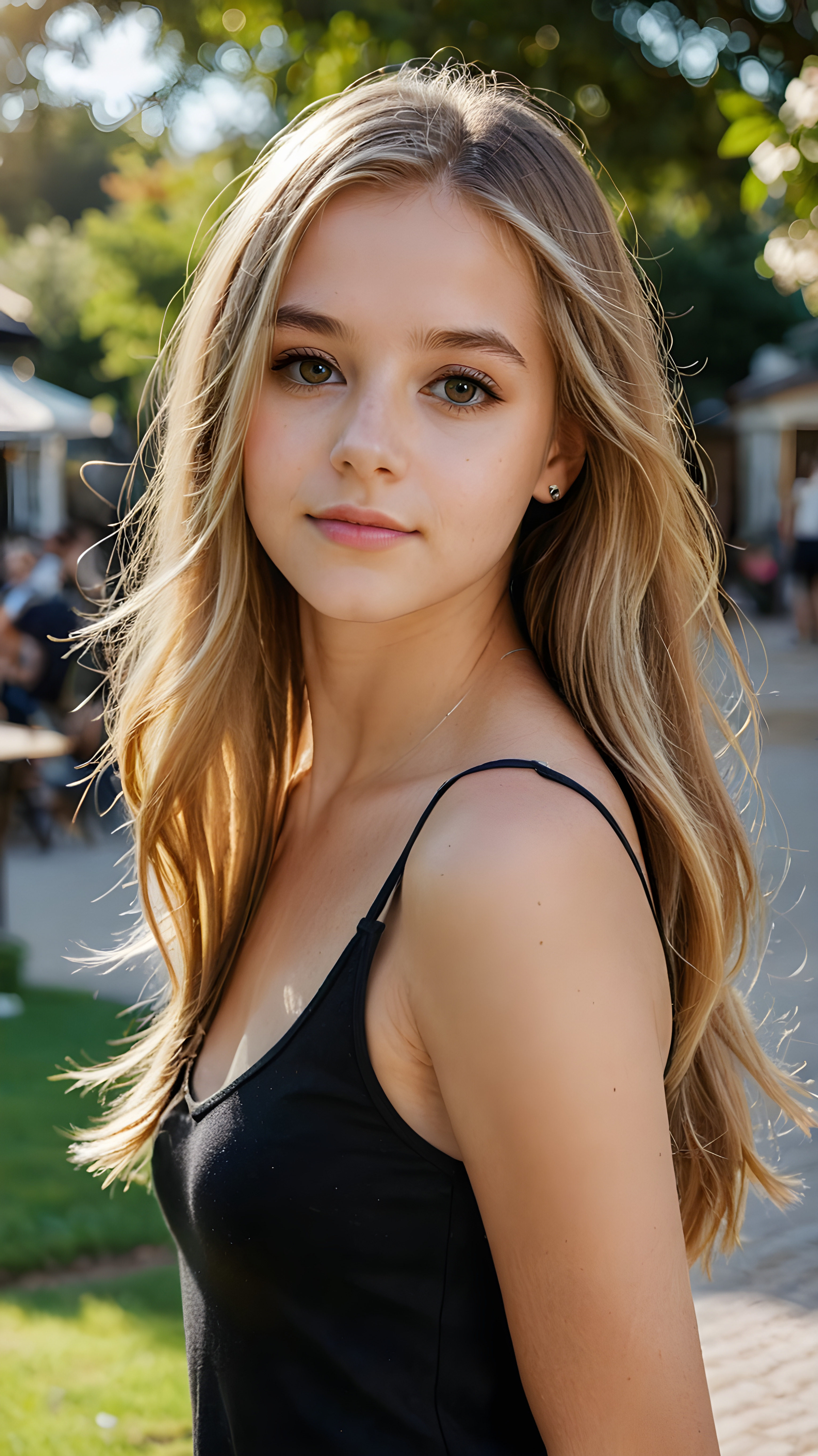 a sophisticated (((intimately posing young teen girl))) with flowing, extremely long straight blond hair, beautiful big (hazelnut eyes), dangerously short elegant black tank top