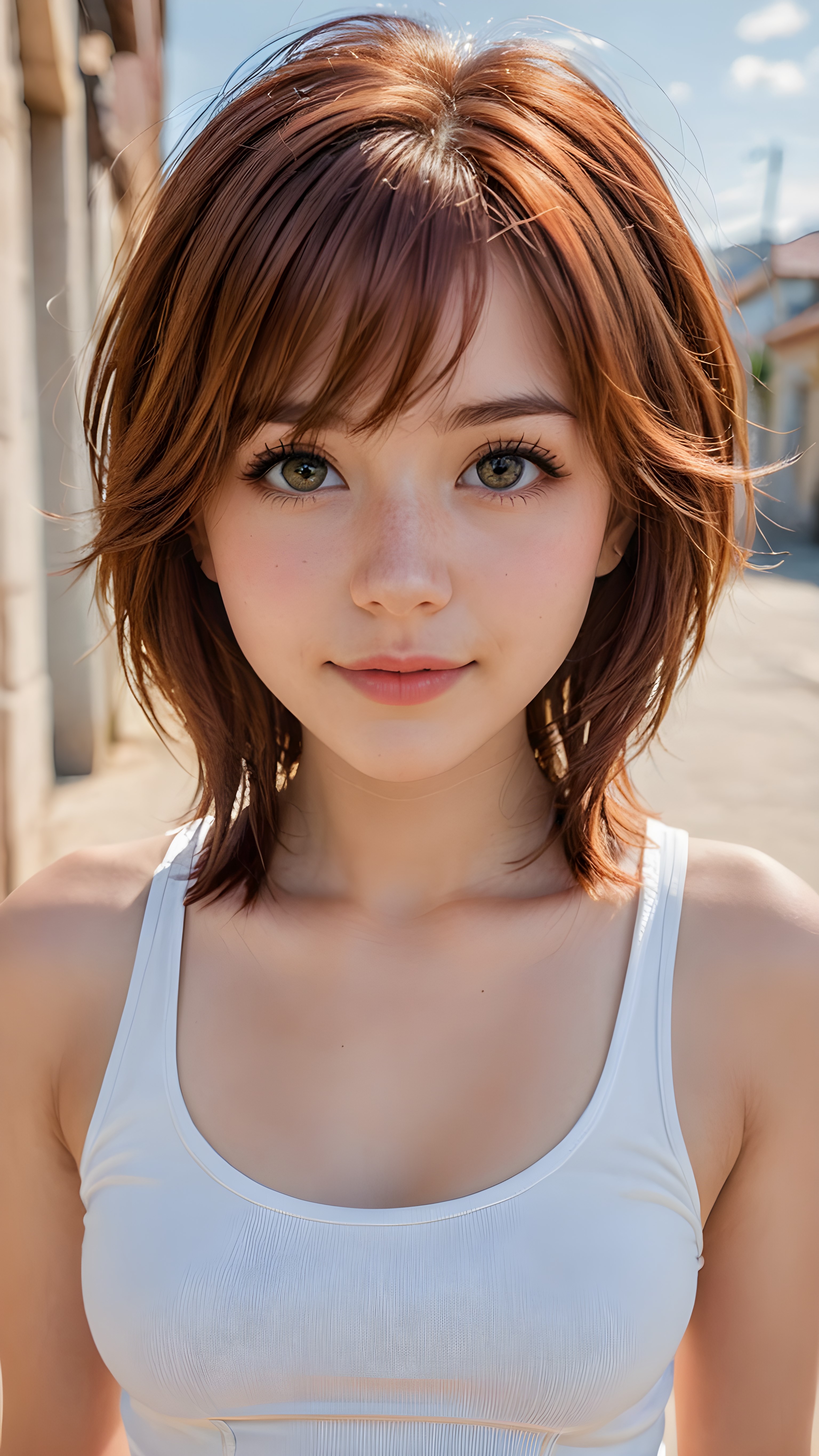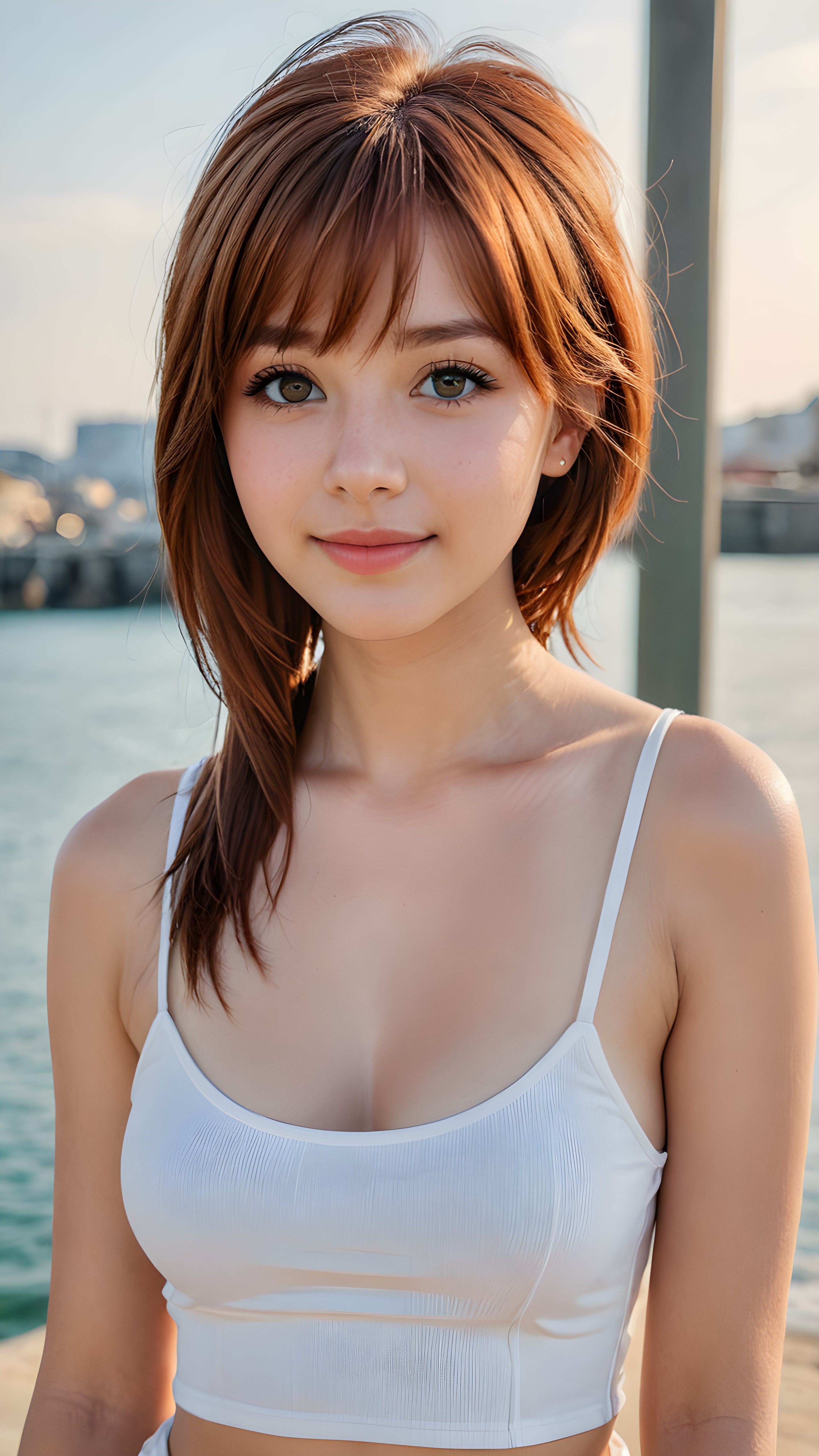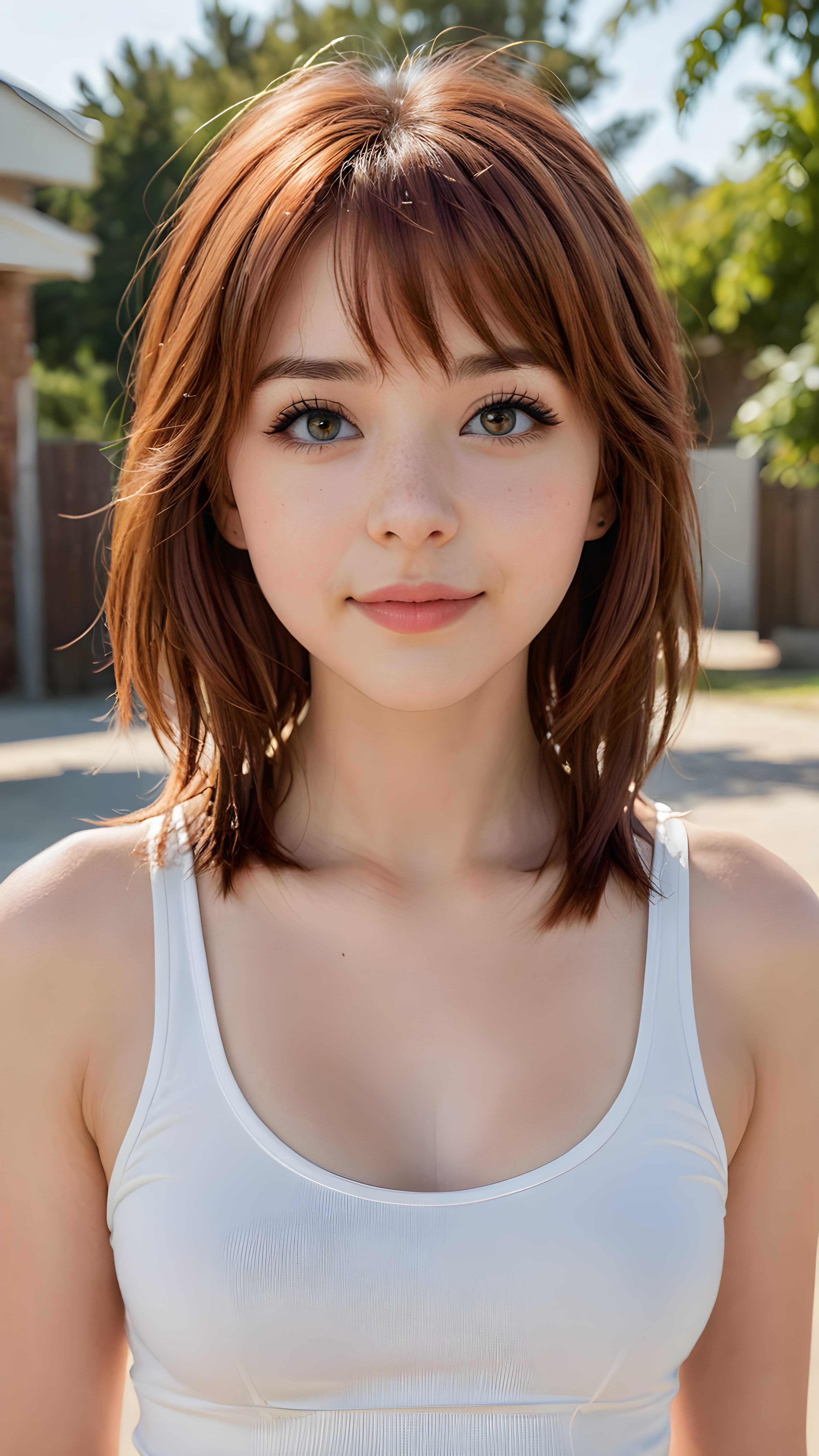 a stunningly (((cute and elegant)) Emo teenage girl) with intricate long (straight soft auburn hair, bangs) that extends down her back, dressed in a (((short white cropped tank top))), featuring perfect curves and an ultra realistic face with (detailed, realistic eyes). Her hair framing her face in a masterful composition that draws the eye. The scene is captured with a (highly detailed, ultra realistic image) that exudes a warm glow, emphasizing depth through softly blurred focus and a touch of (film grain), while the girl looks directly at the viewer with a (serene smile) that draws attention to her upper body, which stands out in striking detail against a (masterfully crafted, ultra realistic backdrop) that borders on (best-quality art)
