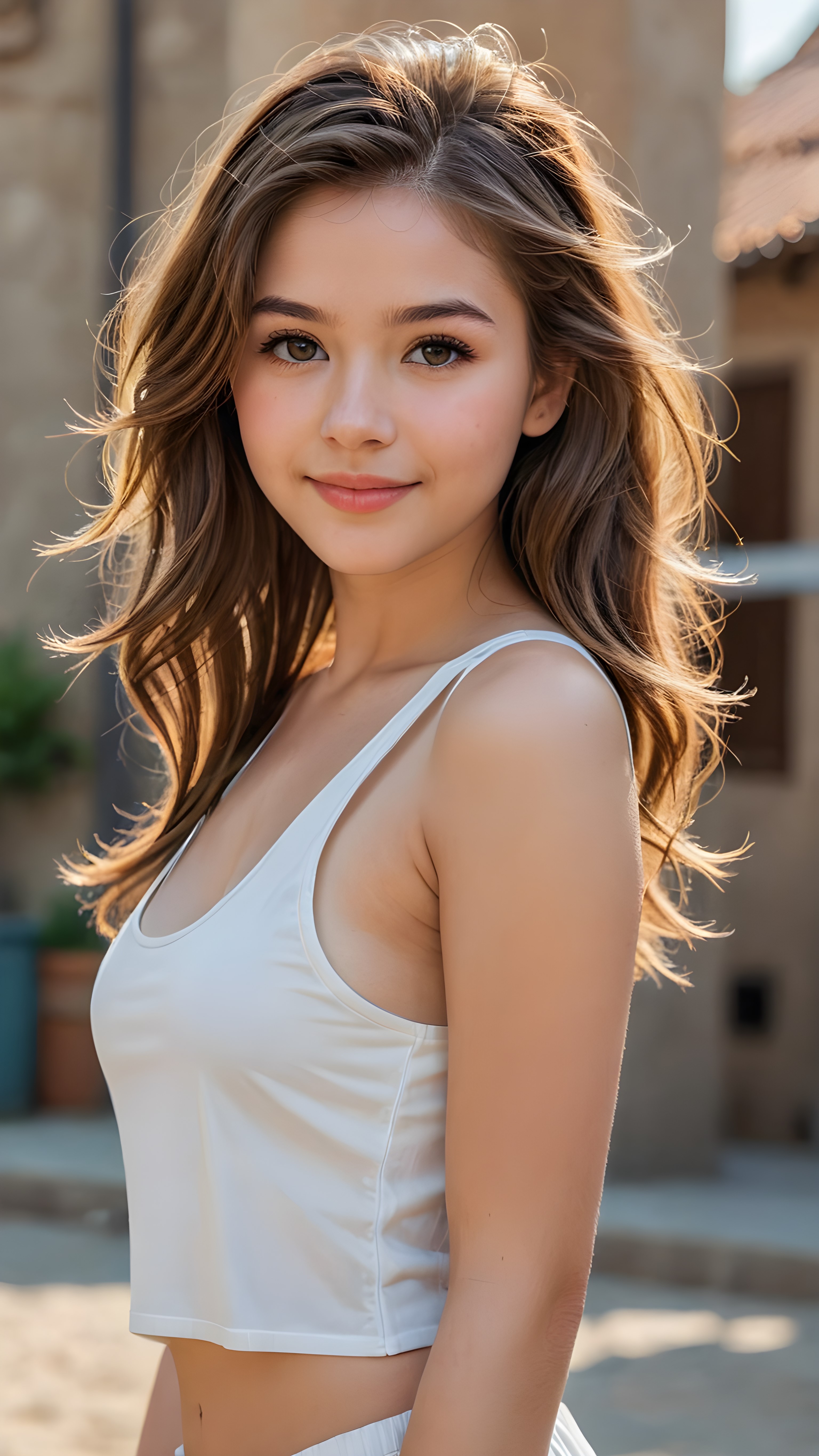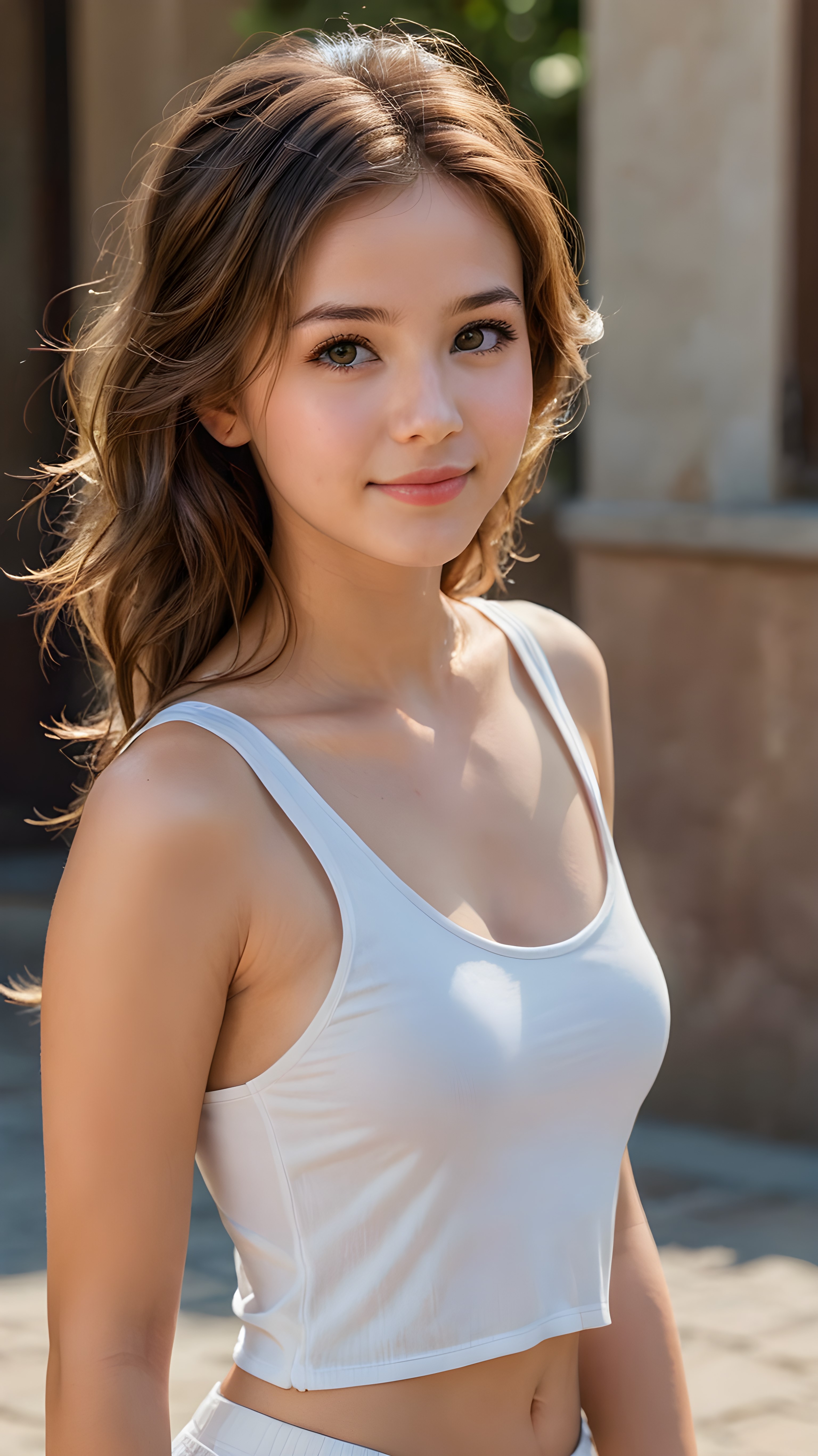 a stunningly (((cute and elegant)) young teen girl) with intricate long weavy (straight soft brown hair) that extends down her back, dressed in a (((short white cropped tank top))), featuring perfect curves and an ultra realistic face with (detailed, realistic eyes). Her hair framing her face in a masterful composition that draws the eye. The scene is captured with a (highly detailed, ultra realistic image) that exudes a warm glow, emphasizing depth through softly blurred focus and a touch of (film grain), while the girl looks directly at the viewer with a (serene smile) that draws attention to her upper body, which stands out in striking detail against a (masterfully crafted, ultra realistic backdrop) that borders on (best-quality art)