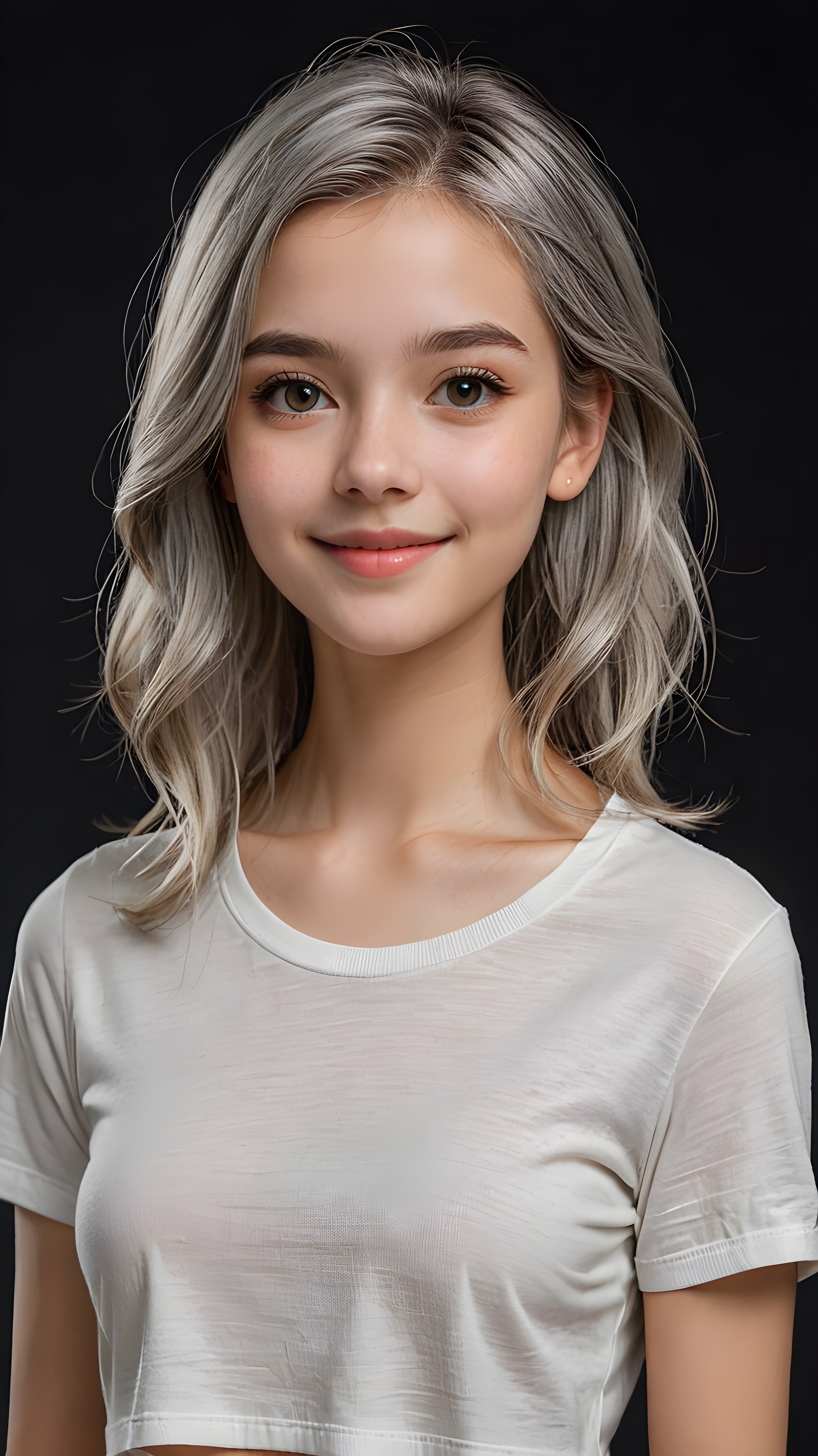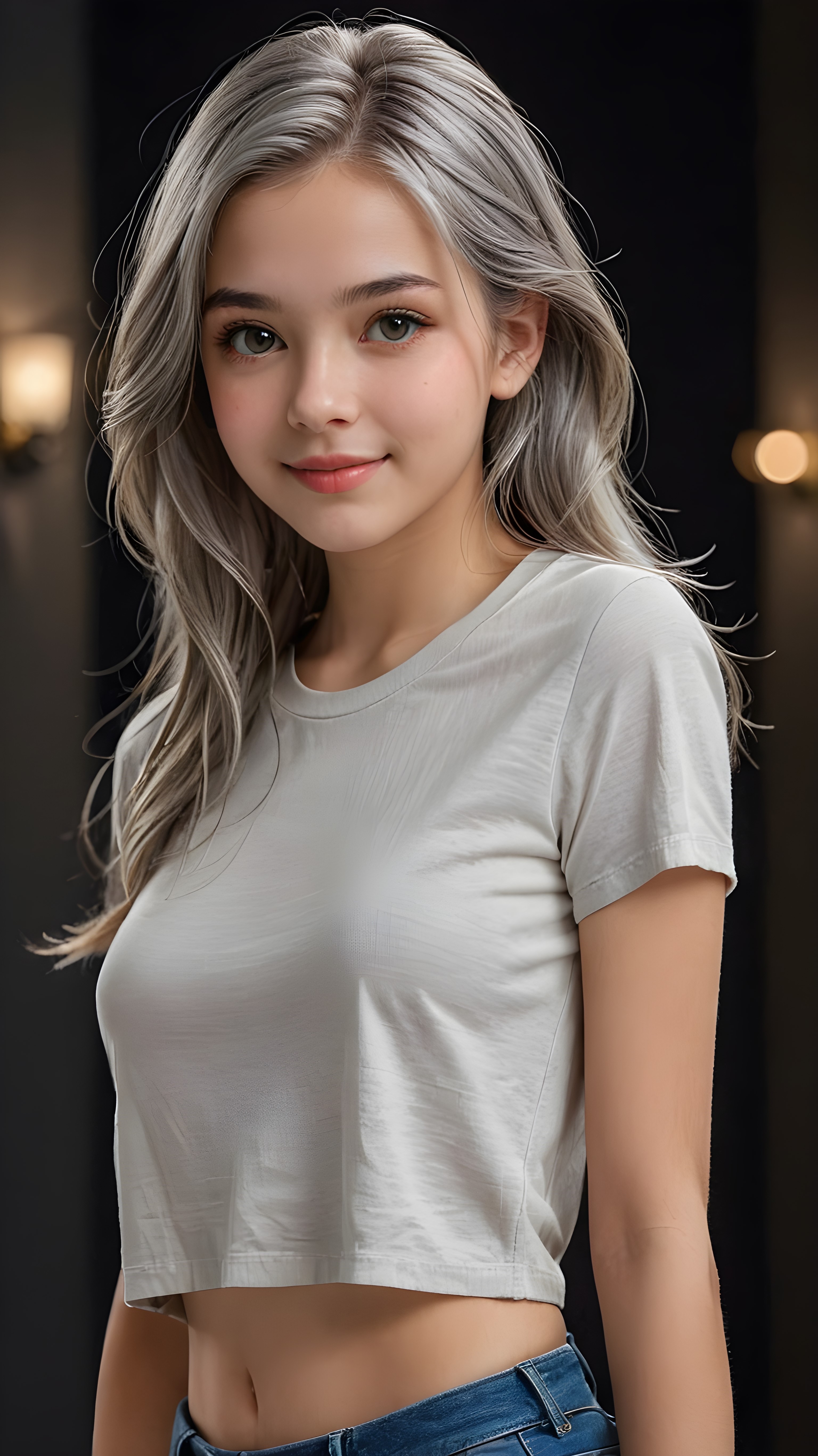 a stunningly (((cute and elegant)) young teen girl) with intricate long (straight soft grey hair) that extends down her back, dressed in a (((short cropped t-shirt))), featuring perfect curves and an ultra realistic face with (detailed, realistic eyes). Her hair framing her face in a masterful composition that draws the eye. The scene is captured with a (highly detailed, ultra realistic image) that exudes a warm glow, emphasizing depth through softly blurred focus and a touch of (film grain), while the girl looks directly at the viewer with a (serene smile) that draws attention to her upper body, which stands out in striking detail against a (masterfully crafted, ultra realistic backdrop) that borders on (best-quality art), ((dark background))