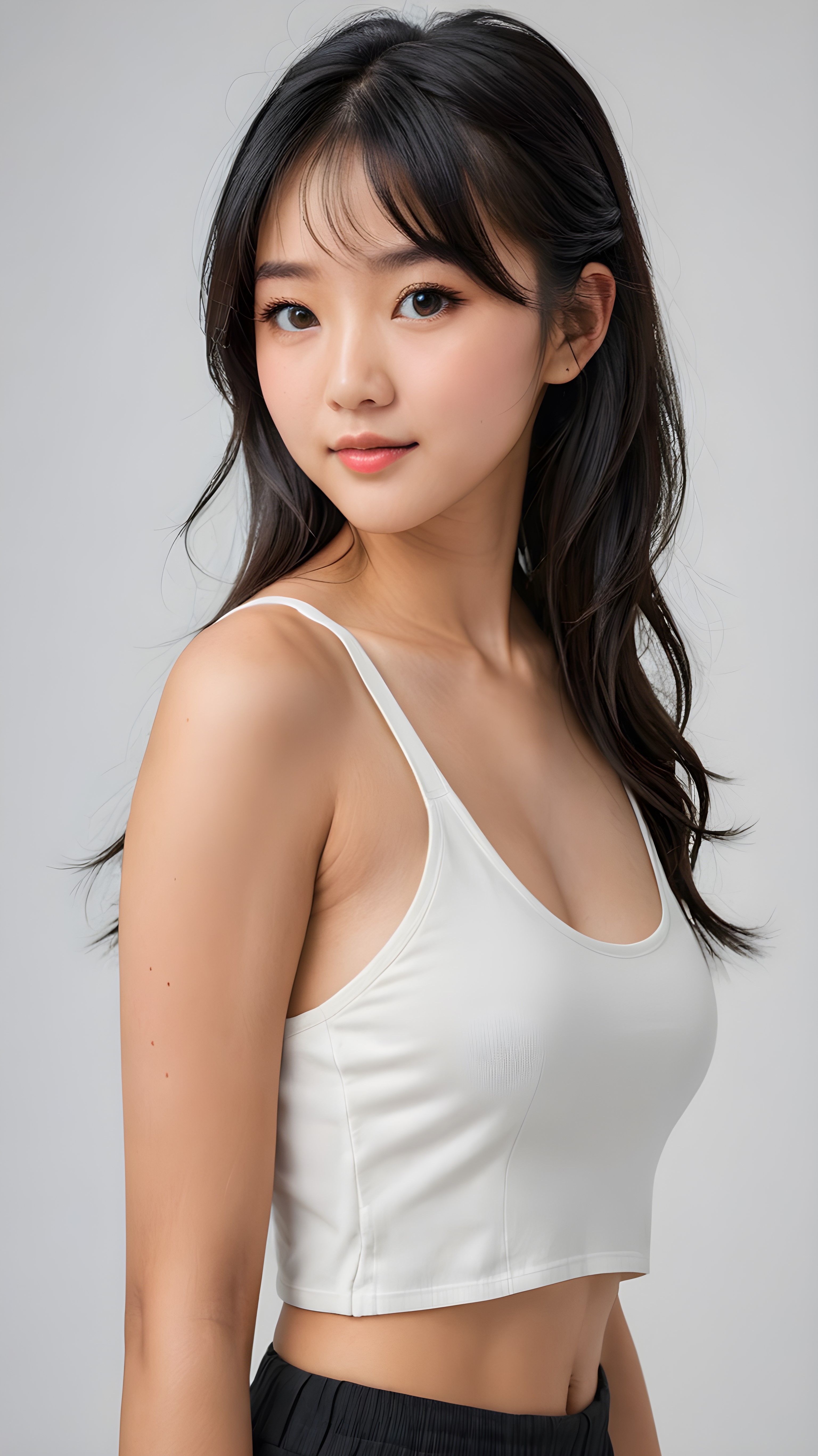 a stunningly (((cute and elegant)) Asian teenage girl) with intricate long (straight soft obsidian black hair, bangs) that extends down her back, dressed in a (((short white cropped tank top))), featuring perfect curves and an ultra realistic face with (detailed, realistic eyes). Her hair framing her face in a masterful composition that draws the eye. The scene is captured with a (highly detailed, ultra realistic image) that exudes a warm glow, emphasizing depth through softly blurred focus and a touch of (film grain), while the girl looks directly at the viewer with a (serene smile) that draws attention to her upper body, which stands out in striking detail against a (masterfully crafted, ultra realistic backdrop) that borders on (best-quality art) ((white background))