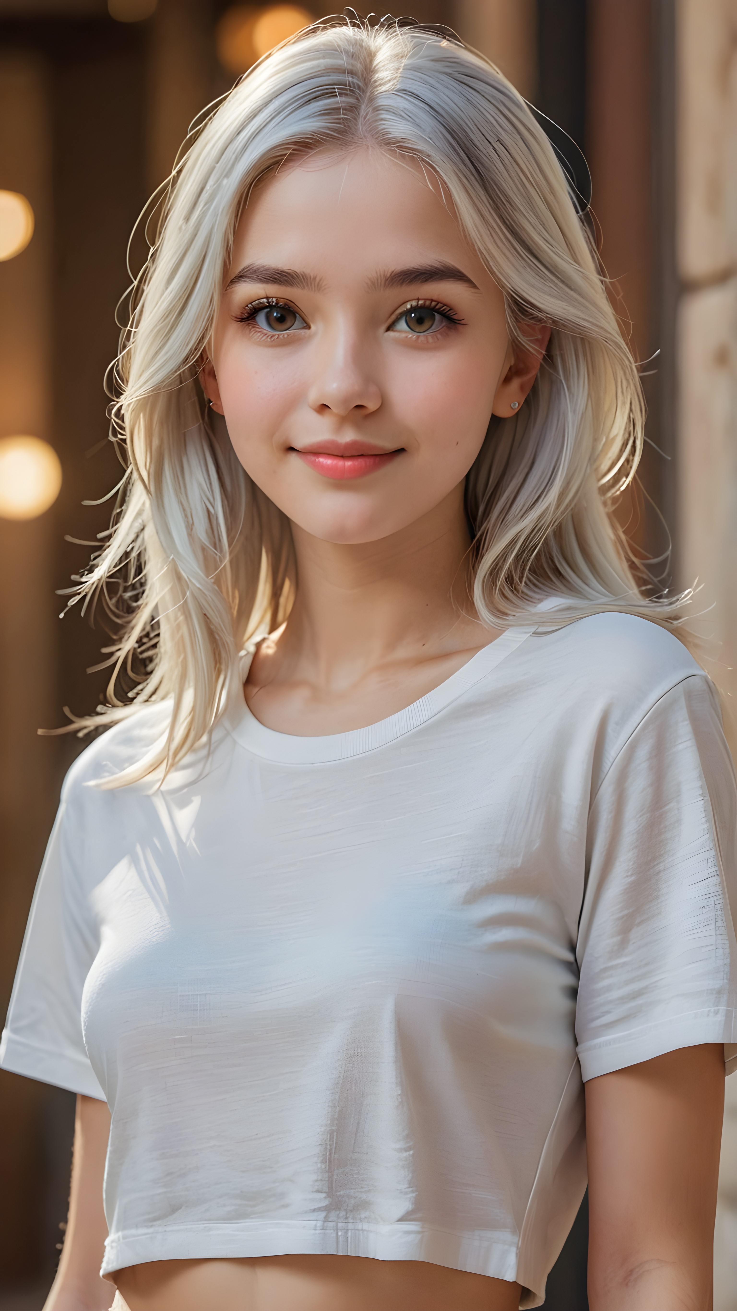 a stunningly (((cute and elegant)) young teen girl) with intricate long (straight soft white hair) that extends down her back, dressed in a (((short cropped t-shirt))), featuring perfect curves and an ultra realistic face with (detailed, realistic eyes). Her hair framing her face in a masterful composition that draws the eye. The scene is captured with a (highly detailed, ultra realistic image) that exudes a warm glow, emphasizing depth through softly blurred focus and a touch of (film grain), while the girl looks directly at the viewer with a (serene smile) that draws attention to her upper body, which stands out in striking detail against a (masterfully crafted, ultra realistic backdrop) that borders on (best-quality art)