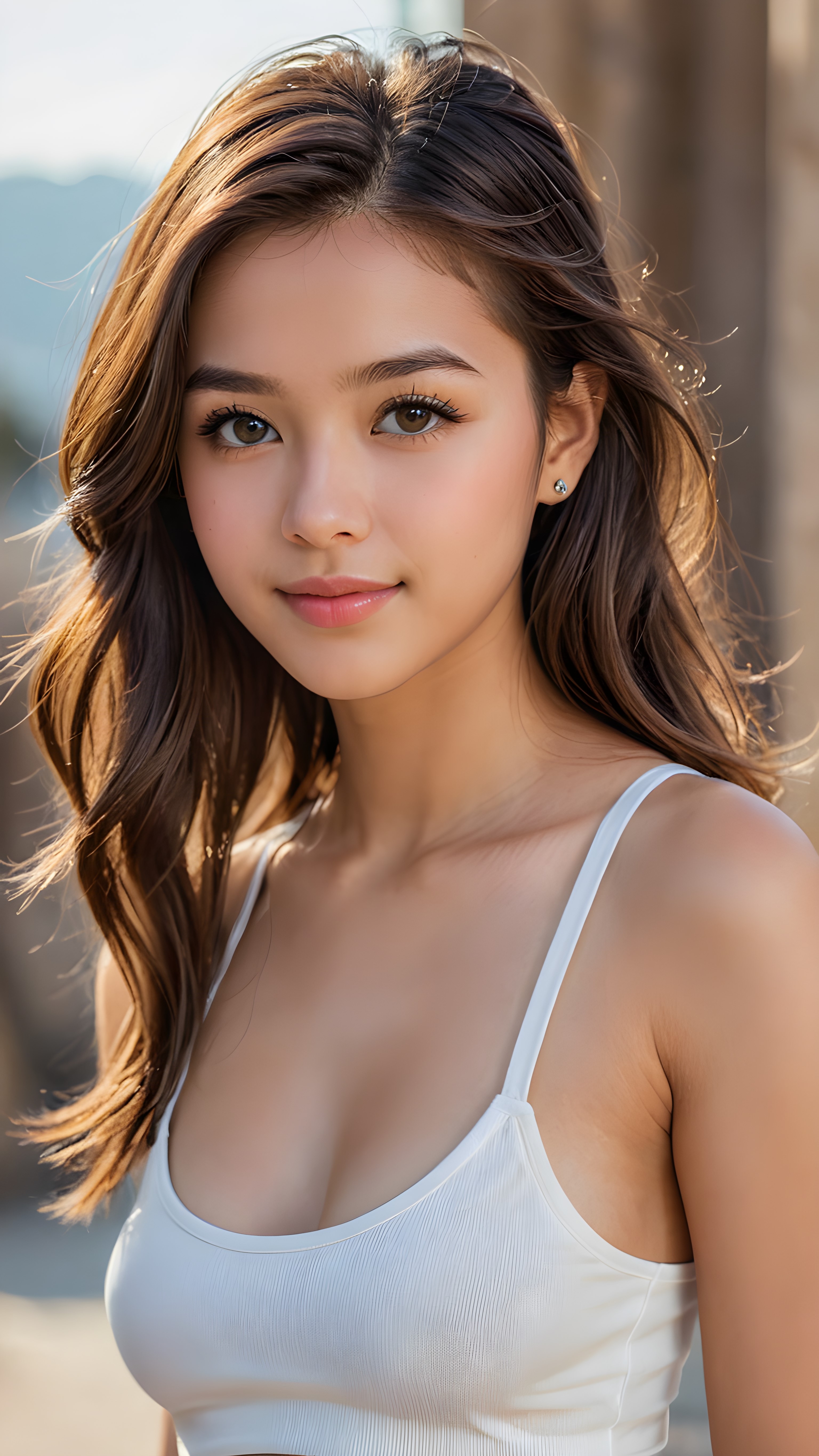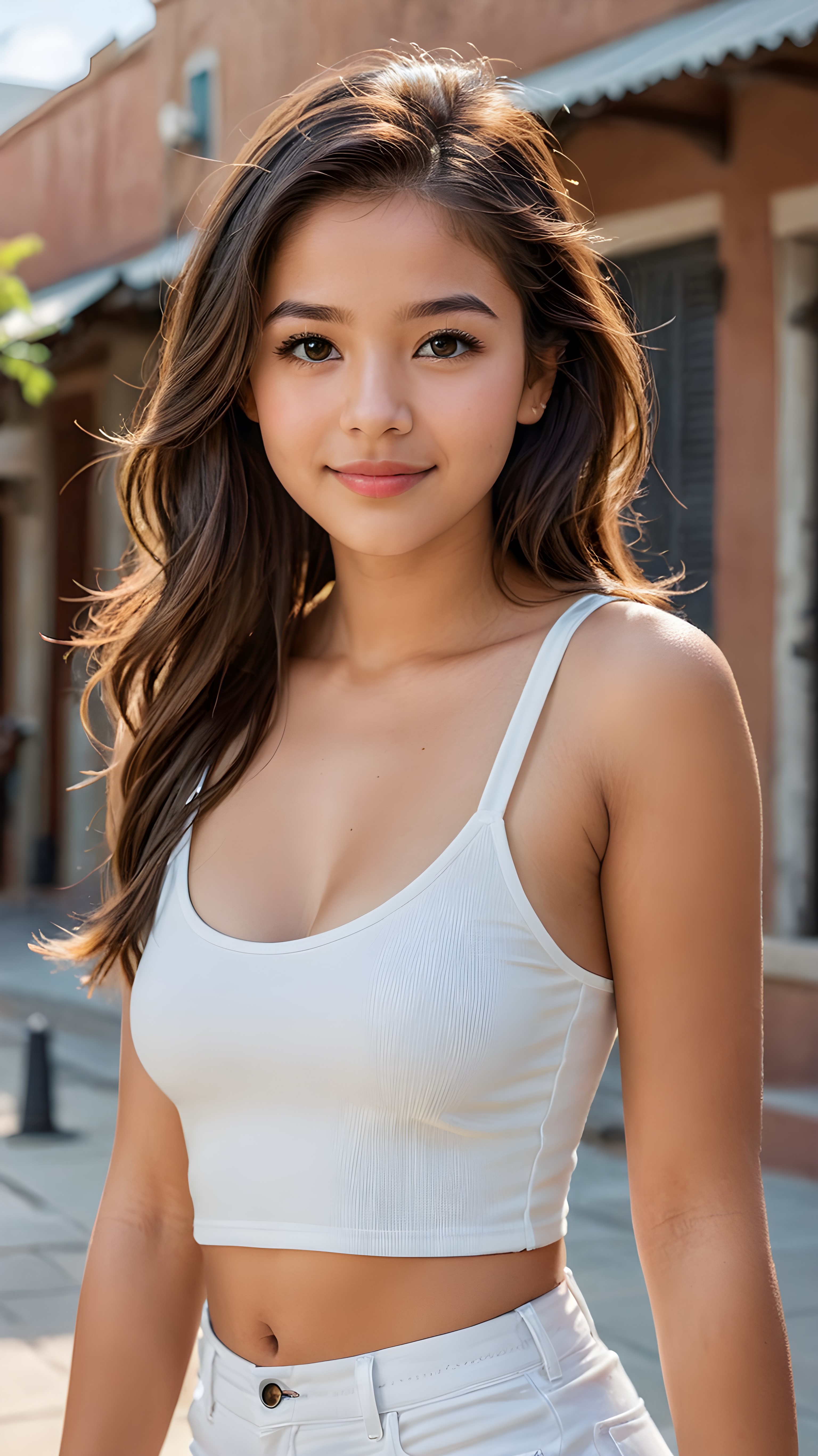 a stunningly (((cute and elegant)) Exotic teenage girl) with intricate long (straight soft hair) that extends down her back, dressed in a (((short white cropped tank top))), featuring perfect curves and an ultra realistic face with (detailed, realistic eyes). Her hair framing her face in a masterful composition that draws the eye. The scene is captured with a (highly detailed, ultra realistic image) that exudes a warm glow, emphasizing depth through softly blurred focus and a touch of (film grain), while the girl looks directly at the viewer with a (serene smile) that draws attention to her upper body, which stands out in striking detail against a (masterfully crafted, ultra realistic backdrop) that borders on (best-quality art)