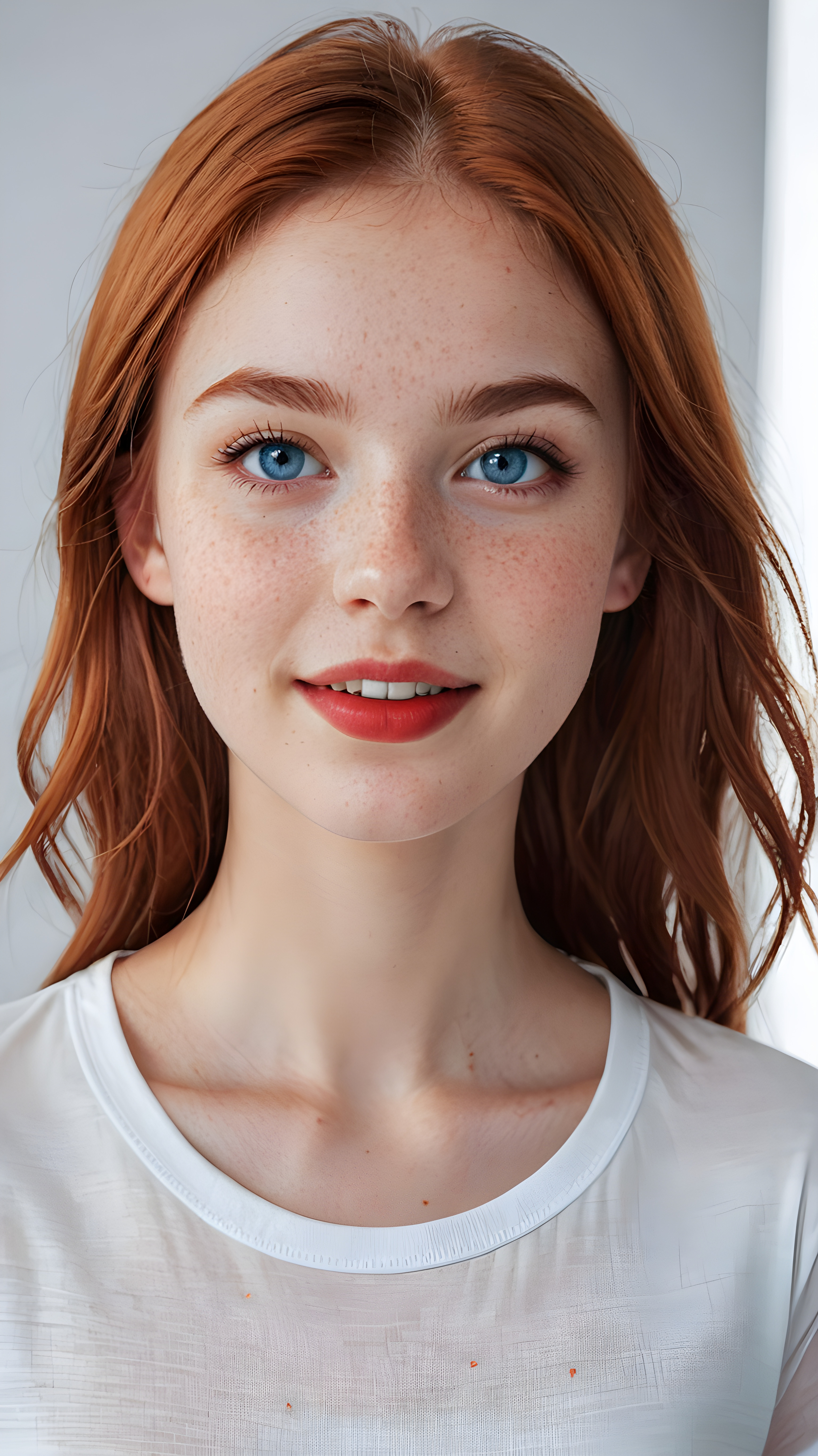 a beautiful (((teen girl))) ((fifteen years old)) ((realistic detailed round face)) ((beautiful eyes)) ((slender cheeks)) ((perfect teeth)) ((wears a super short tight (white t-shirt) made on thin silk)) ((perfect anatomy)) ((white background, side perspective)) ((cinematic lights)) ((long, soft copper-red hair)) ((red lips)) ((red nails)) ((bright blue eyes)) ((realistic detailed eyes)) ((slight smile)) ((freckles)) ((beautiful)) ((attractive)) ((stunning))