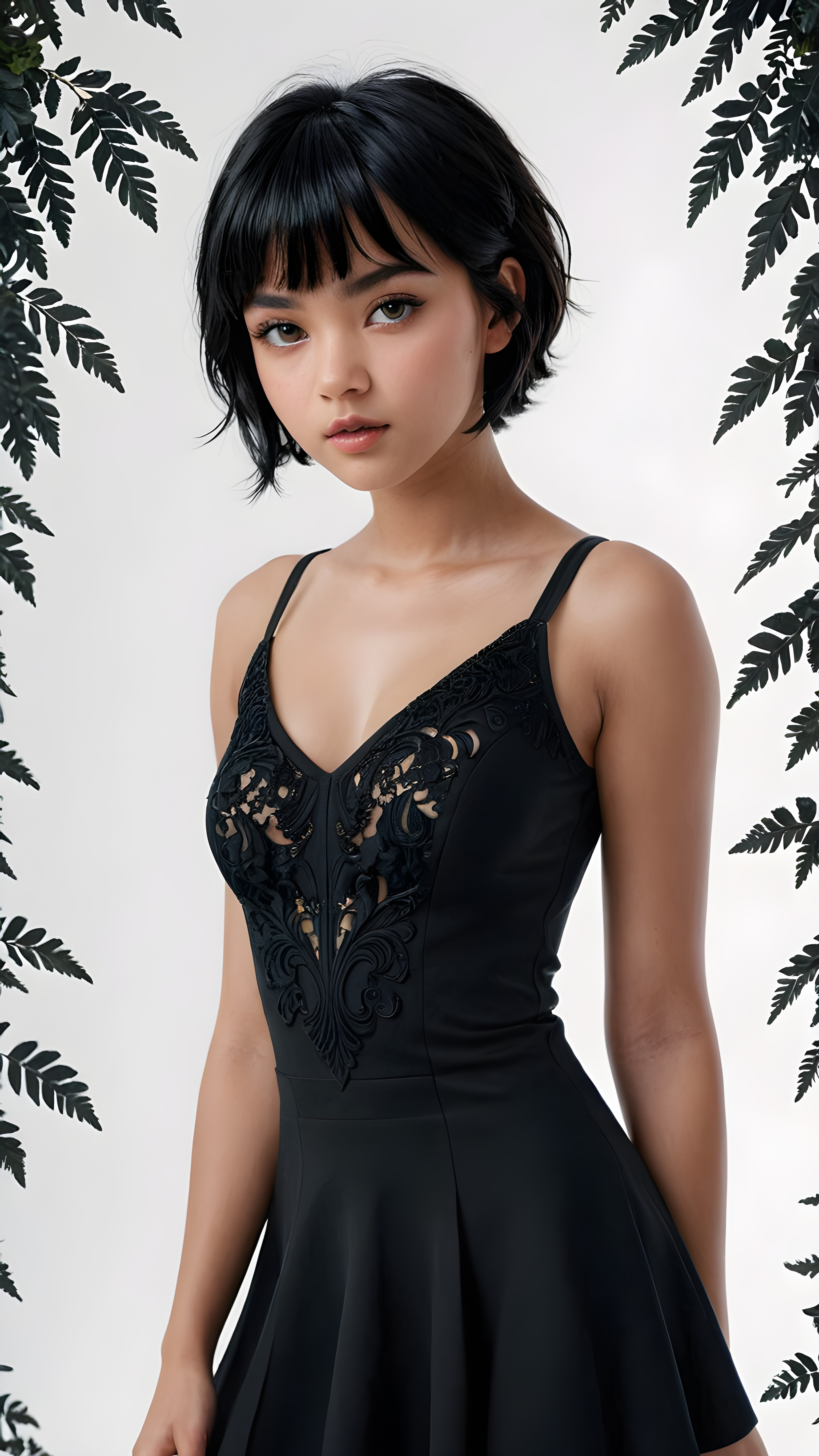 a (((super realistic, highly detailed, intricate photography))), capturing a (((beautiful young teen girl))) with an extremely defined and detailed face, including (((perfect, detailed obsidian black short hair, bangs))), intense eye shadow, and a (short, v-neck black tank top) with (sharply contrasting, luxurious black and white details), paired with (distinctively shaped, vividly hued glass heels) and a (modern, minimalist white backdrop) for a (full body photo) that exudes an (ominous, seductive aura), accented by (subtle yet intricate gothic details) like (dark, twisted foliage) and (ethereal, shimmering glowing particles) that imbue a sense of mystery and magic