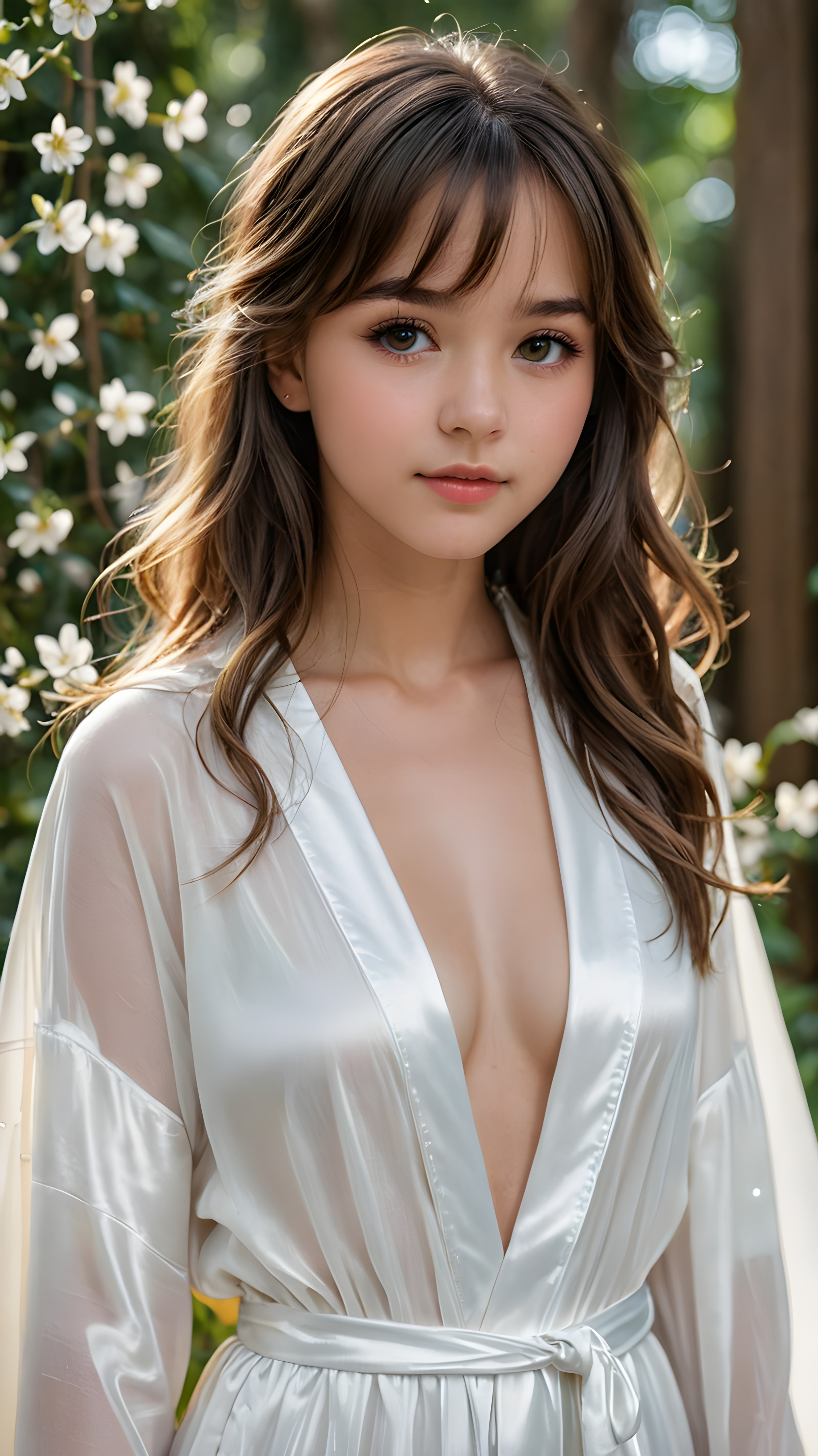 (((a very detailed and super realistic photo))), (((the sexiest photo ever))), ((teen girl)), 14 years old, bangs cut, realistic detailed round face, ((realistic detailed)), (wearing a super realistic undetailed translucent white robe) (((majestic))) (((magical))) (((masterpiece))) (((best quality)))