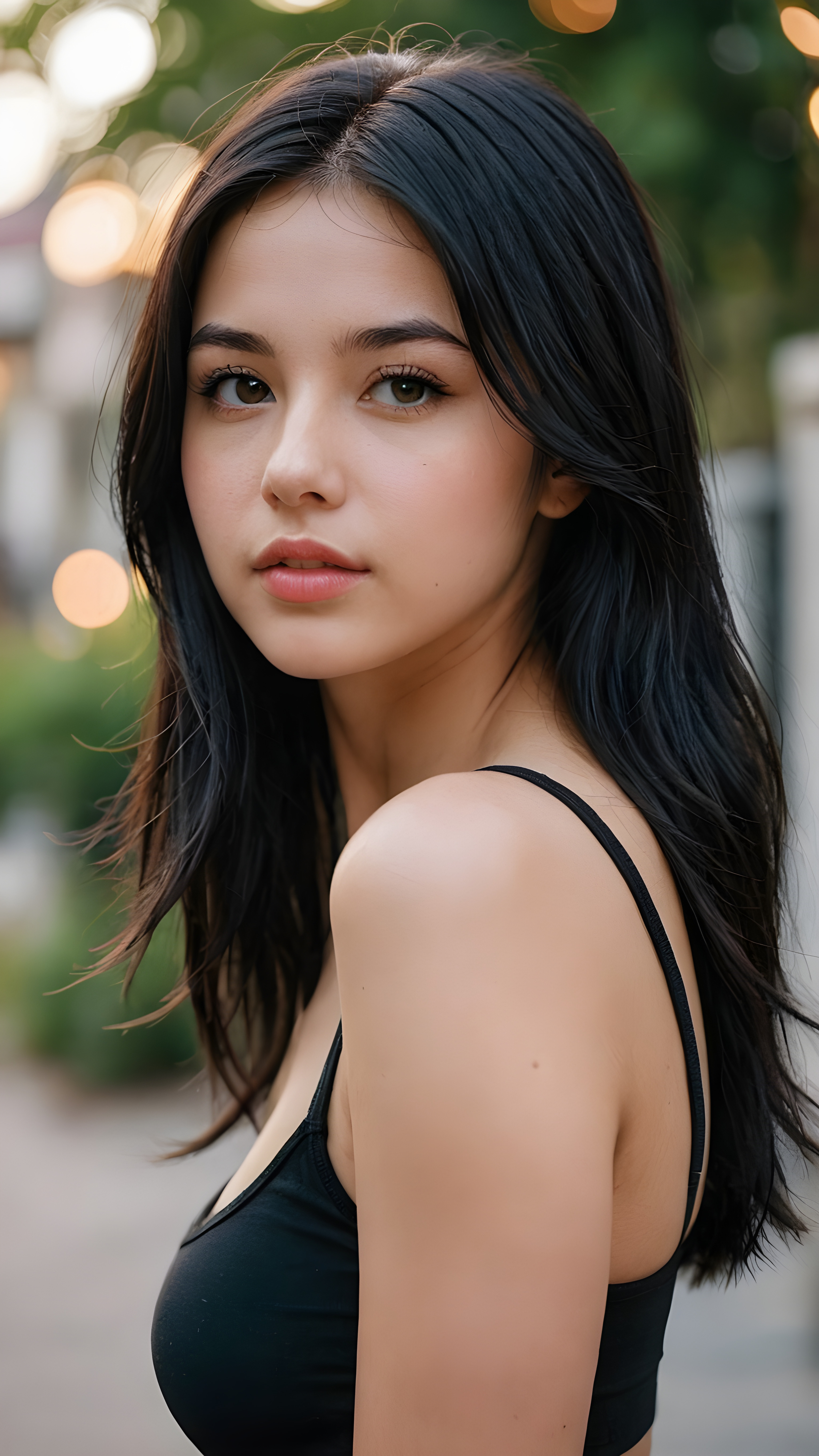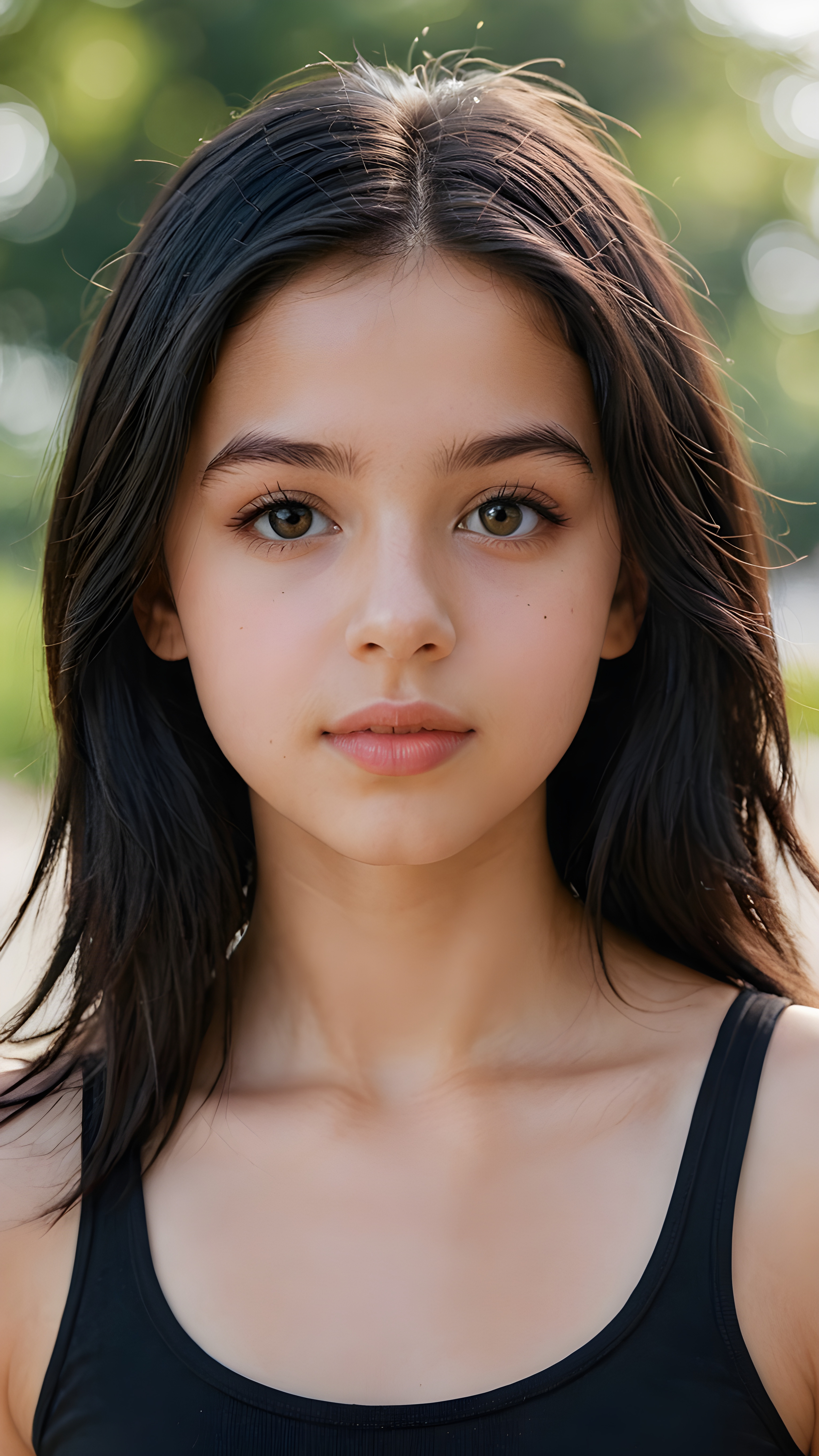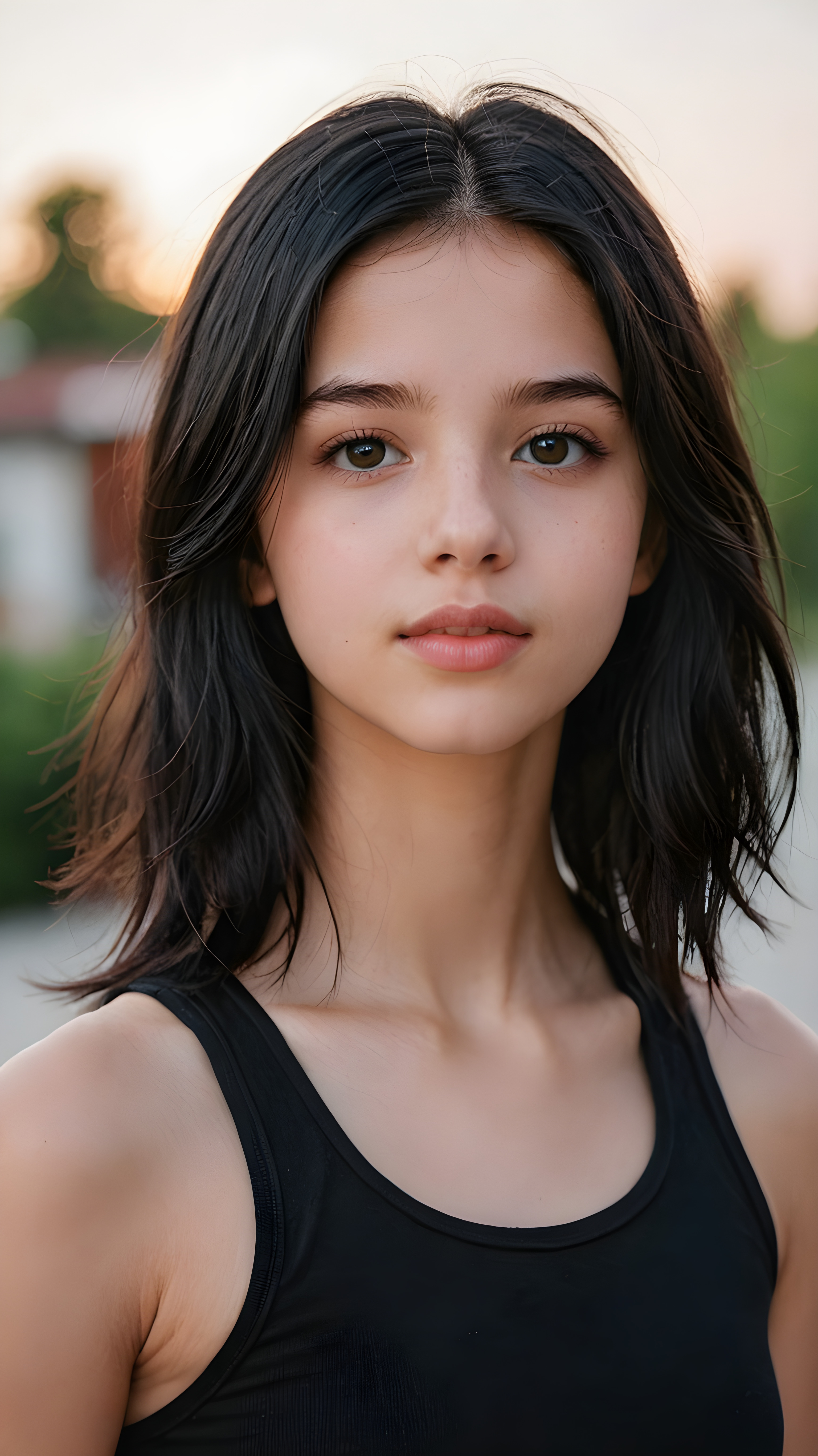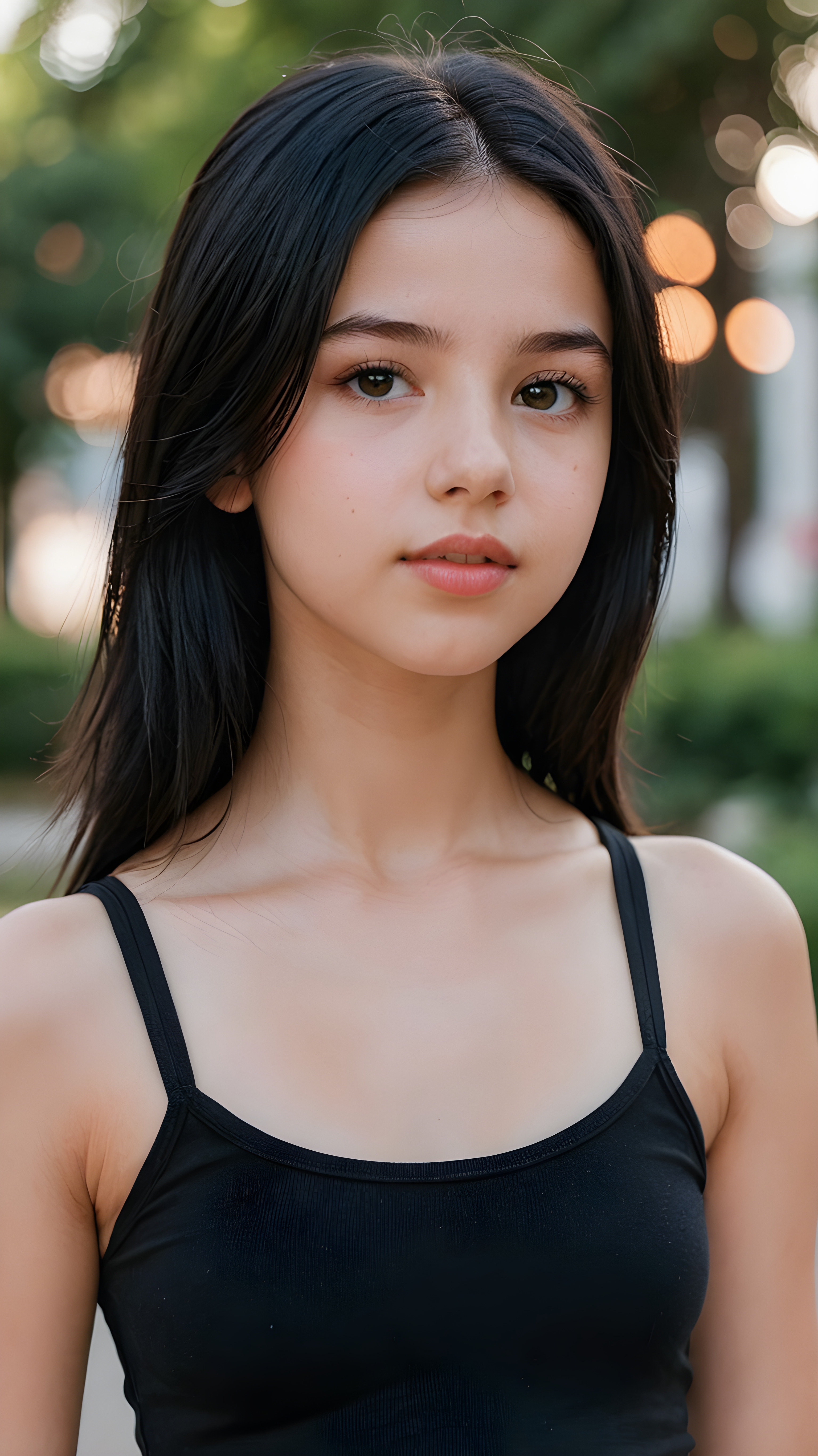a (((young girlie, 14 years old))), wears a (short cropped black tank top), straight soft long black hair, ((round face)), full kissable lips, round eyes, perfect skin