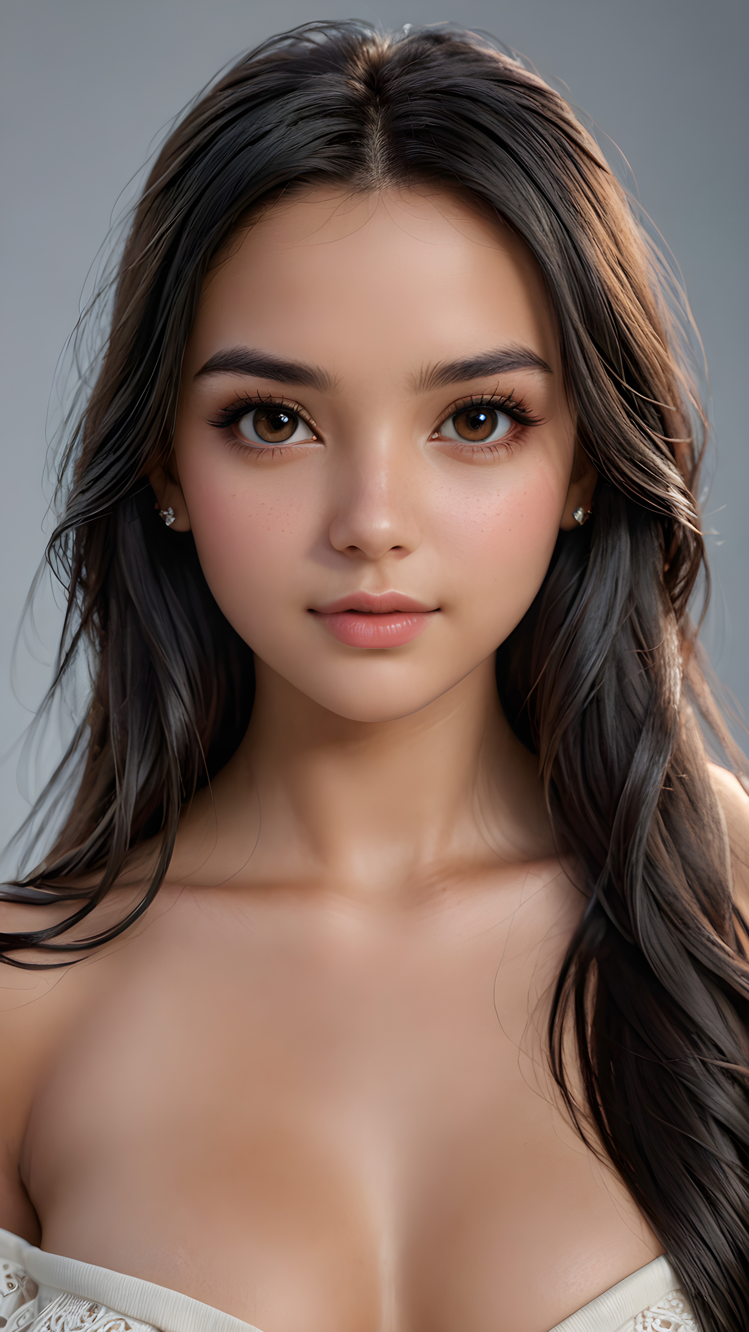 a (((beautiful young girl))) with long, straight black hair and (realistic) dark brown eyes, perfect for showcasing extremely detailed curved body, highly detailed realistic anatomy, realistic digital painting, (((looks at the camera)))