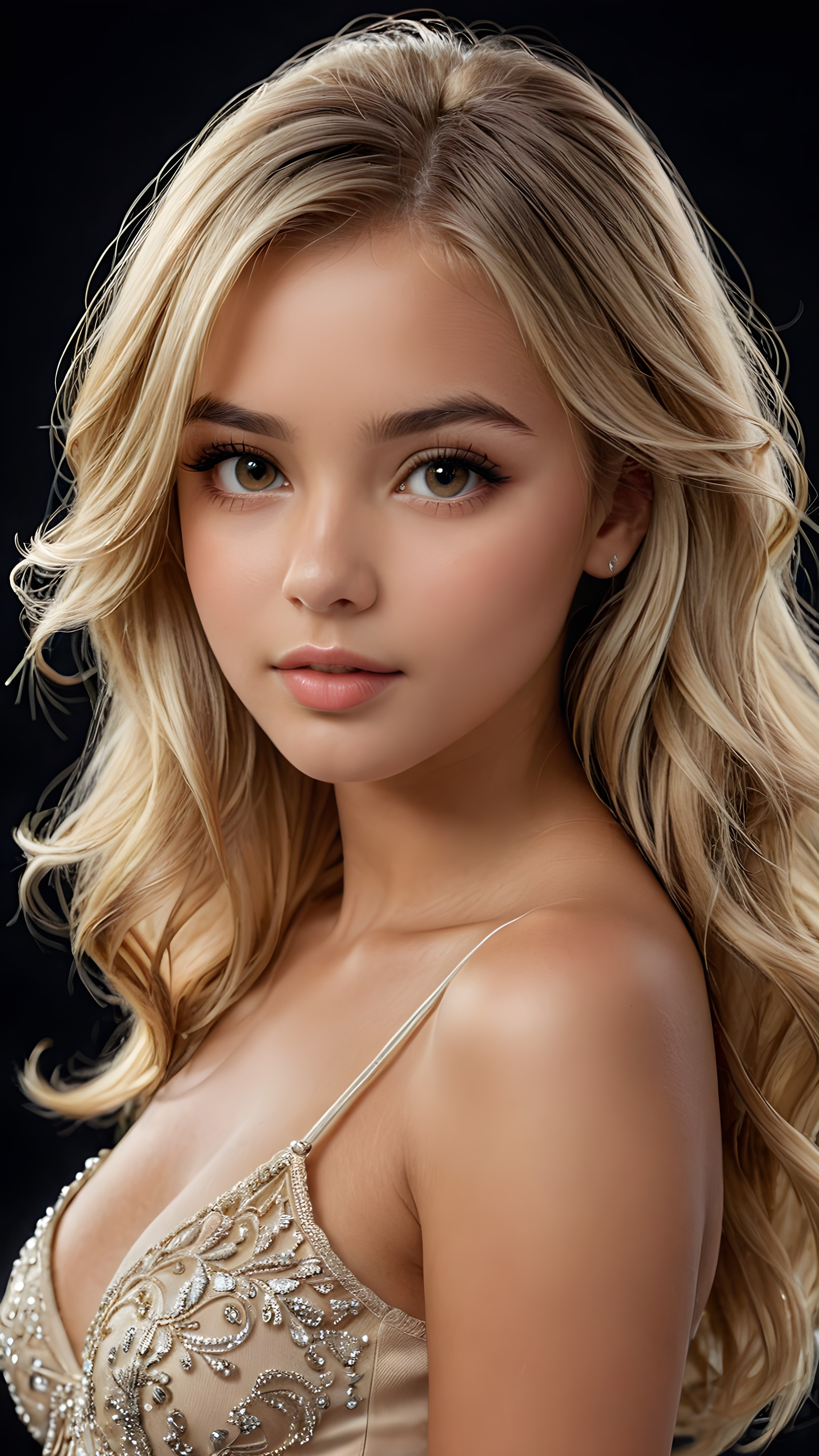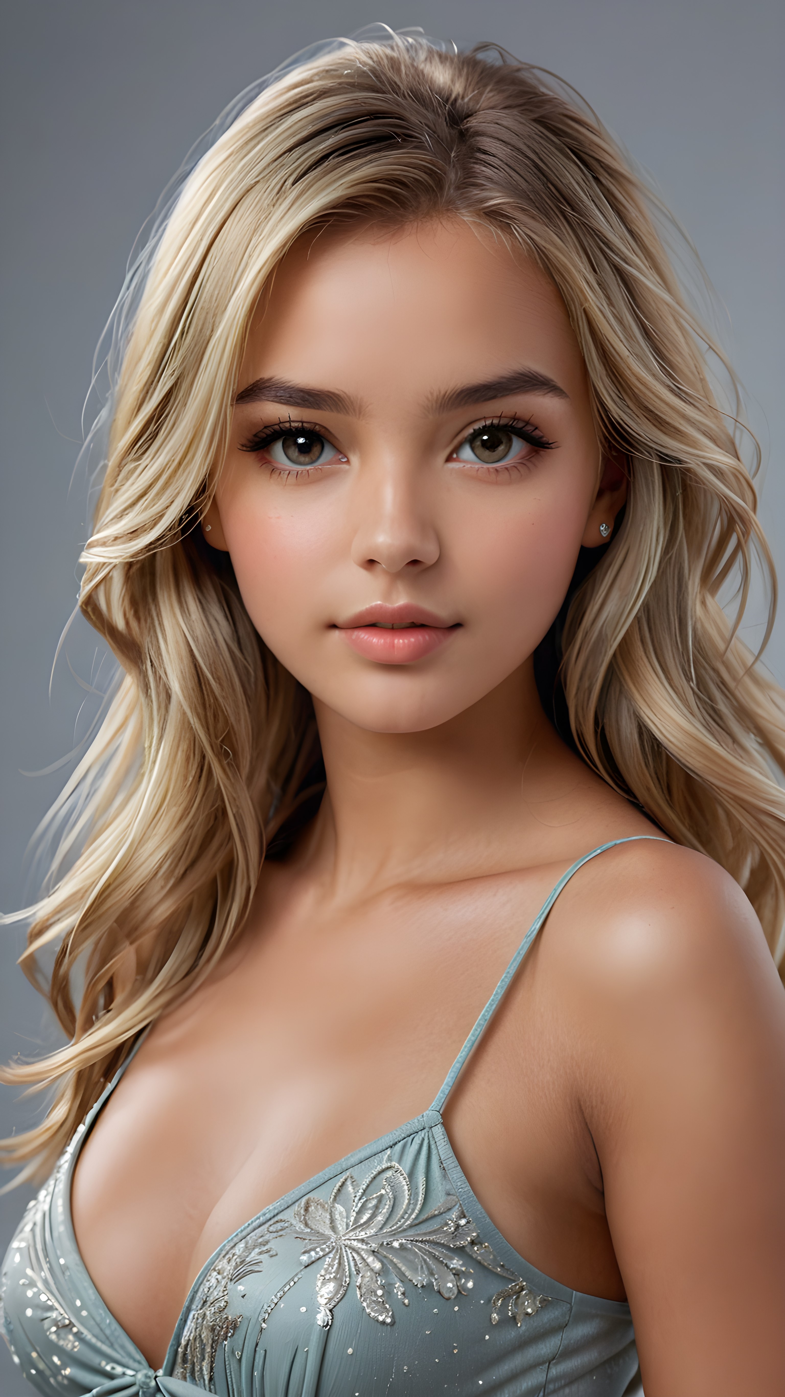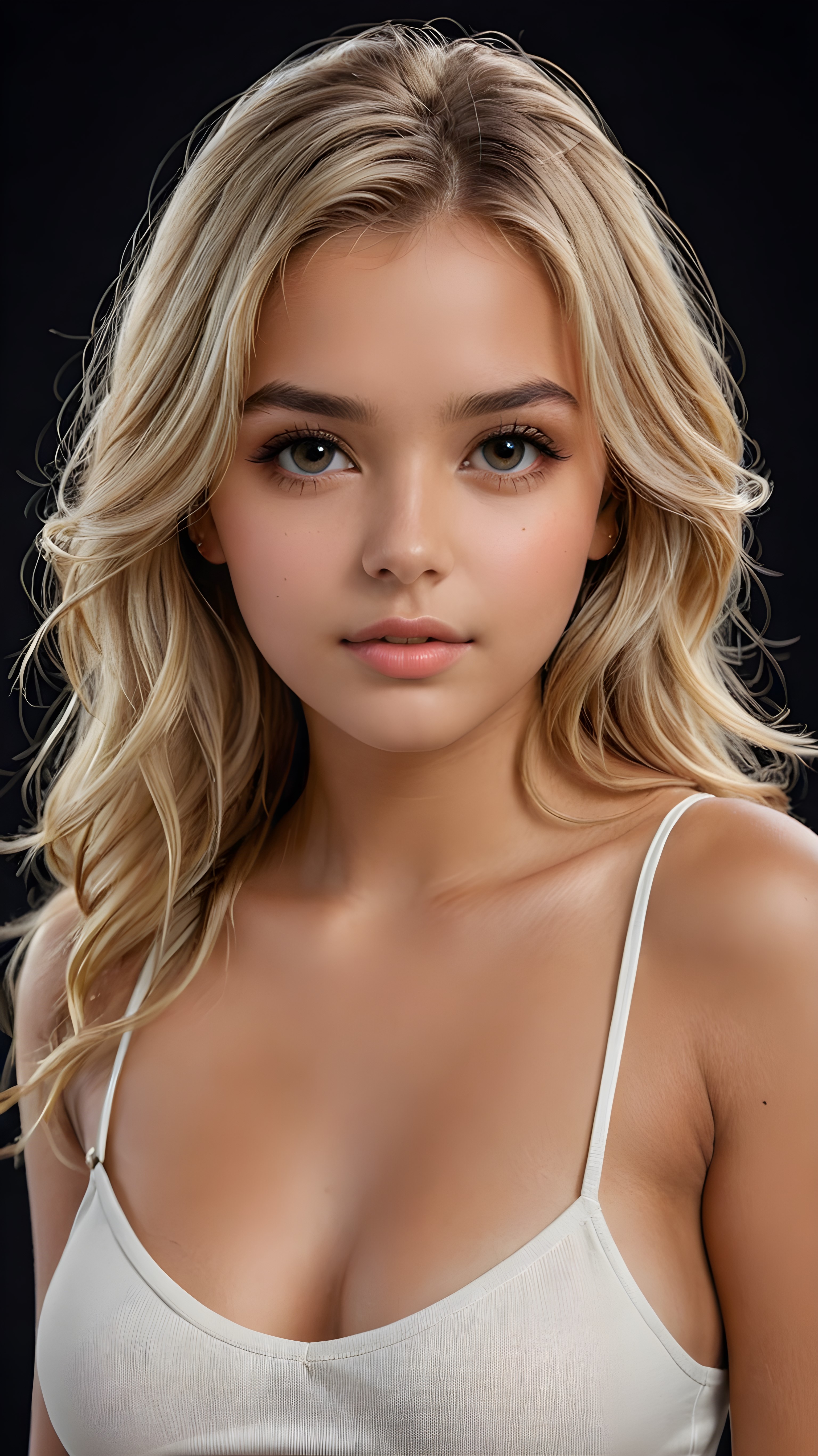 a beautiful and detailed portrait of a young and pretty tanned busty girl, 14 years old, long straight soft blonde hair falls over her shoulders, she wears a thin short t-shirt with deep v-neck and looks seductively at the viewer with her big shining eyes, full lips, her skin is flawlessly beautiful, she has a wonderfull curved body ((side view))