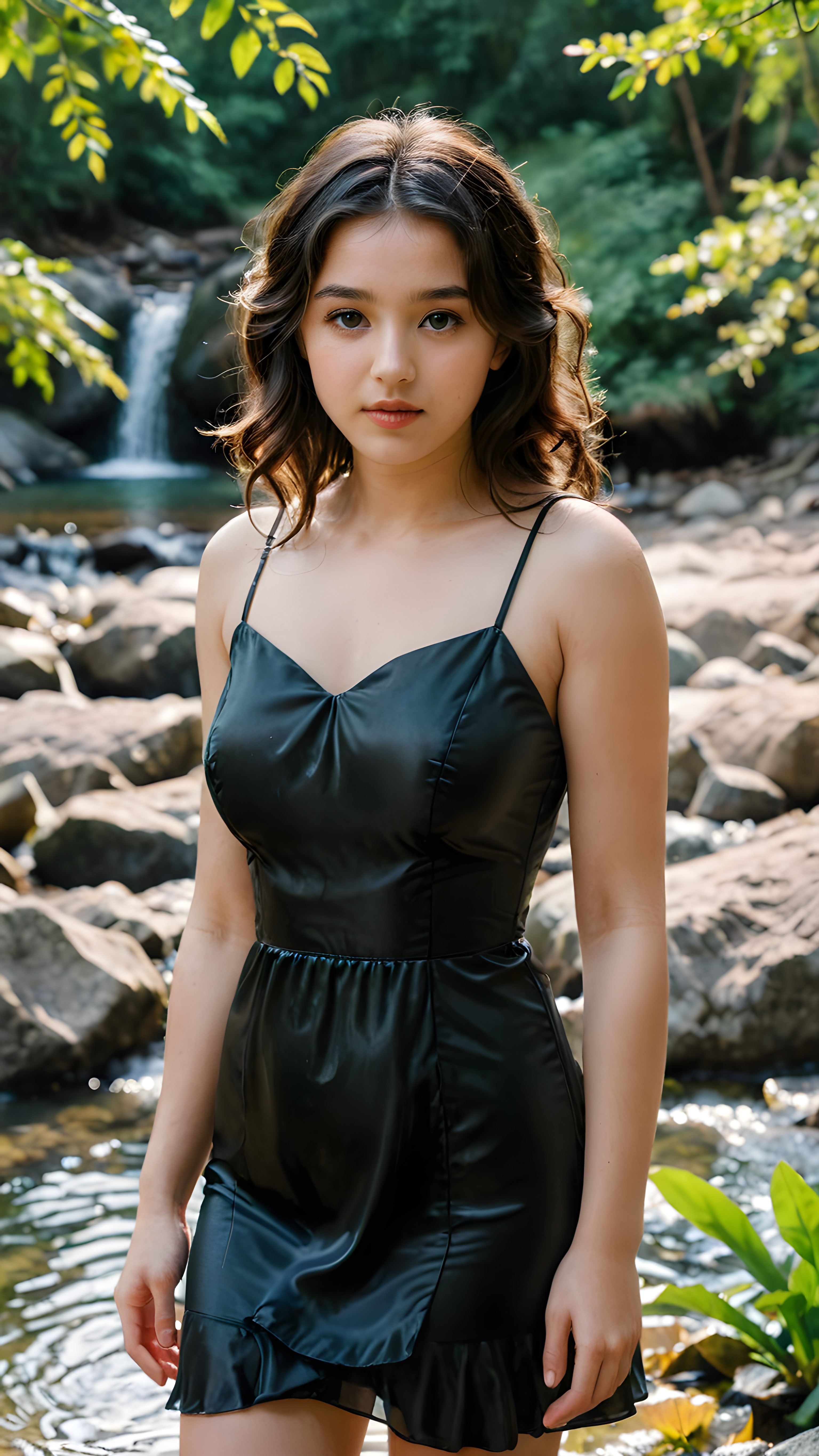 a beautiful, young girl stands up to her stomach in a natural spring and looks embarrassed into the camera. Her black, wavy hair falls over her upper body. She is wearing a thin silk dress