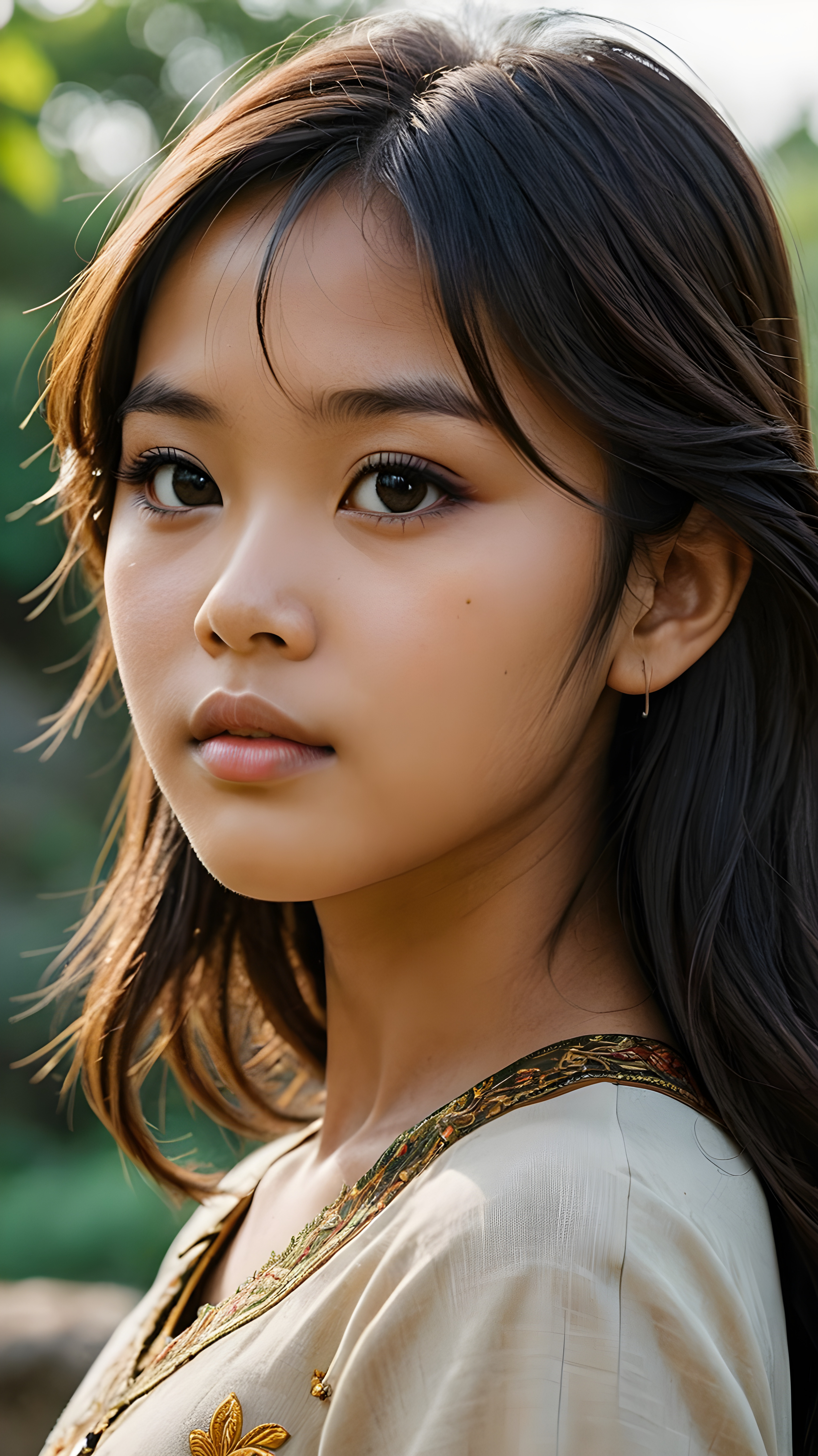 a beautifully drawn (((Burmese girl))) aged 15 with long, straight, hazelnut hair framing a (((flawlessly detailed face))), intricate features like (((round dark eyes))), cut bangs, and a softly downturned mouth, captured in a (((side profile, advanced anatomy))), her expression suggesting a sense of melancholy
