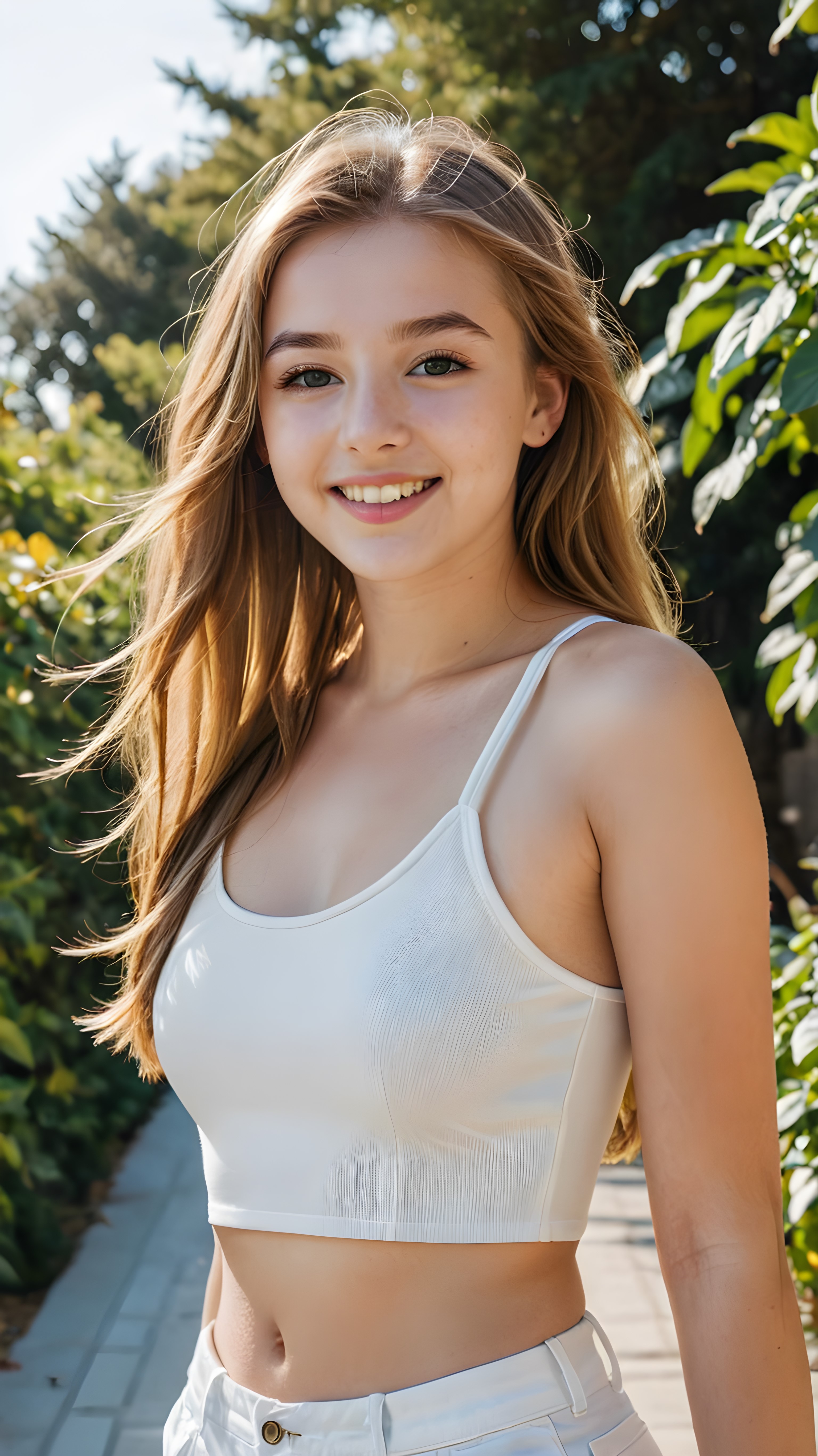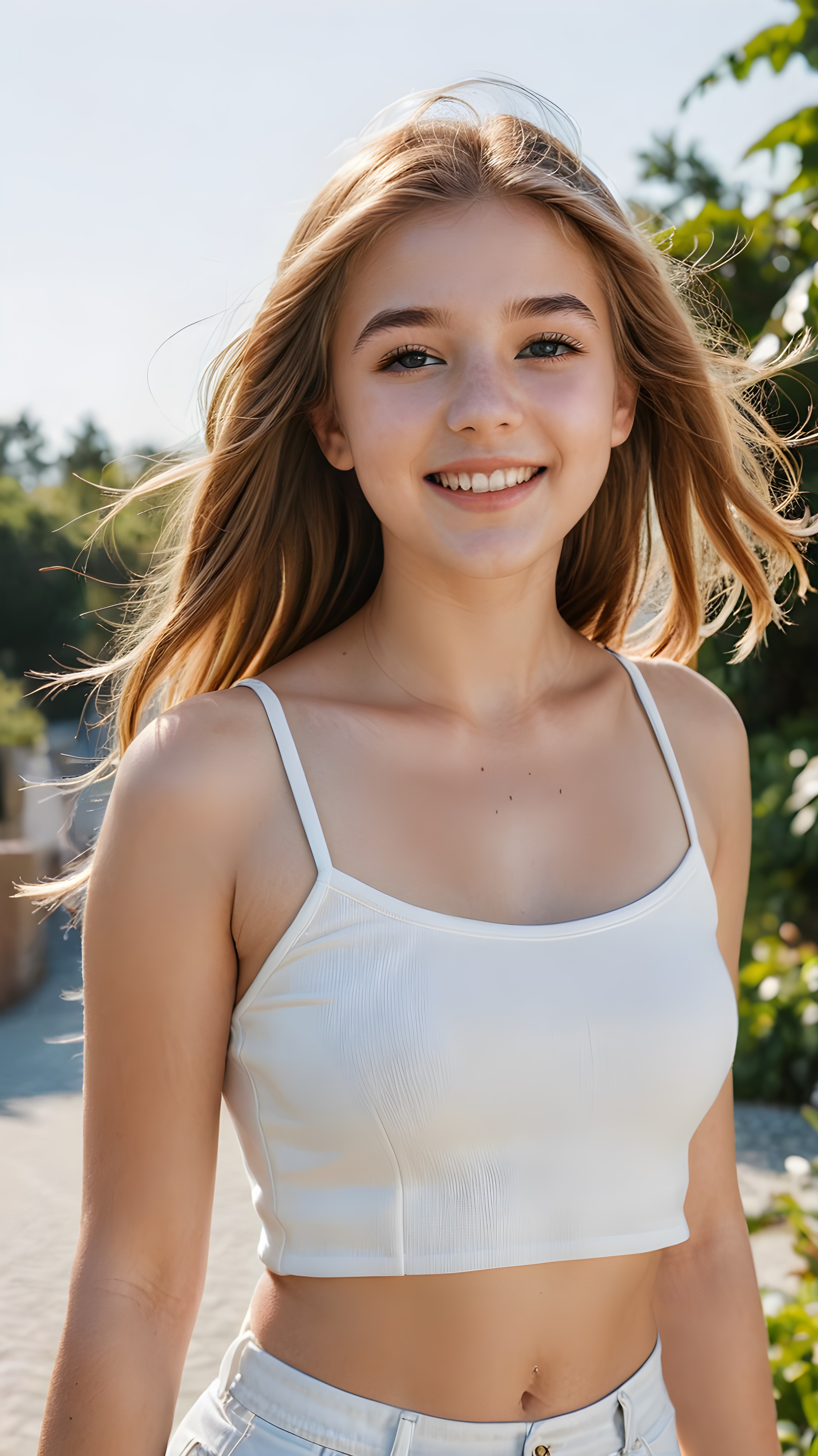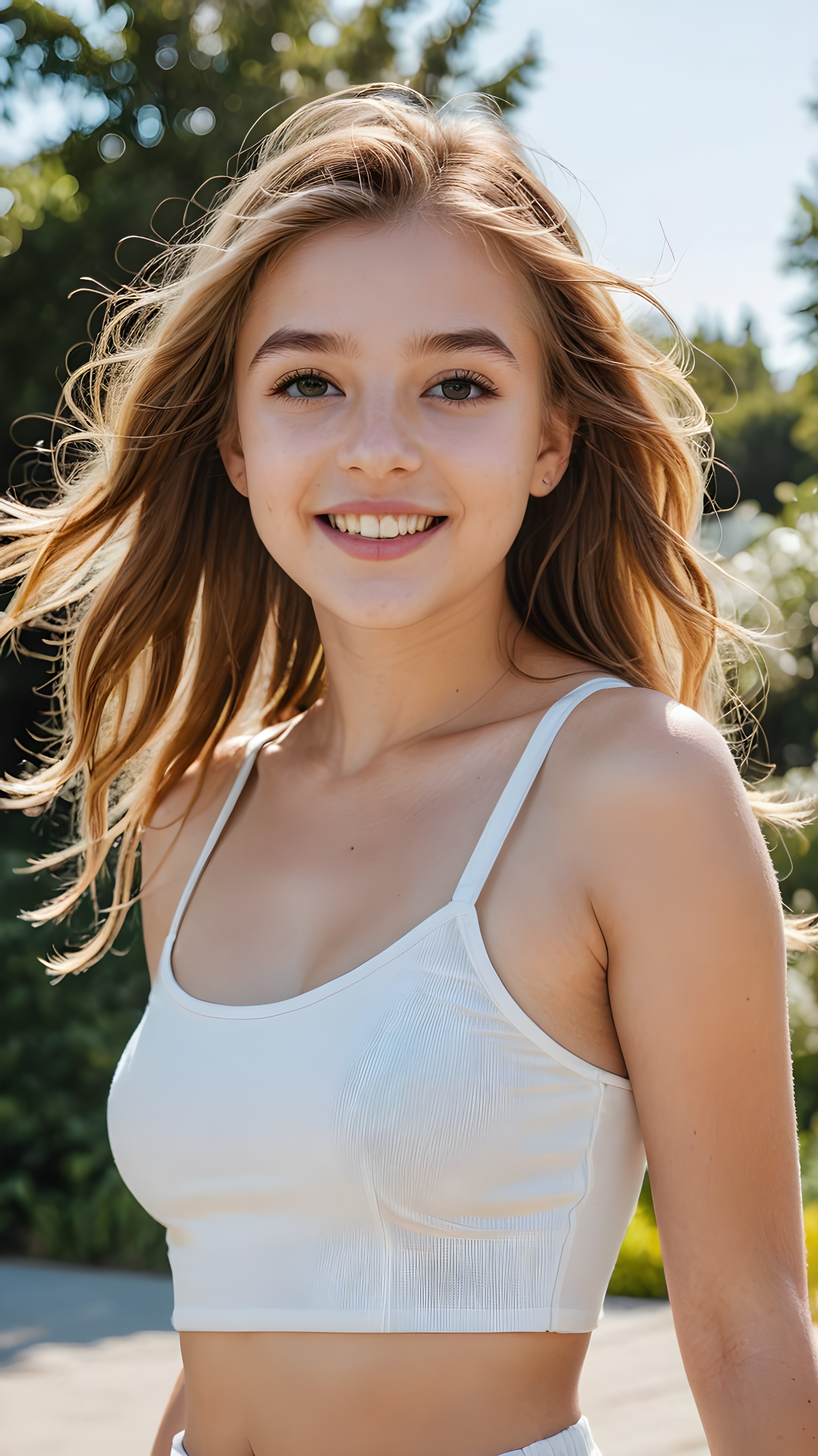 a joyfully gazing (((young teen girl))), 14 years old, with long, soft, straight golden brown hair, exquisitely detailed eyes, dressed in a sleek, form-fitting (((white crop top))), high-waisted shorts, her expression radiating pure elation towards the viewer ((sunny backdrop))