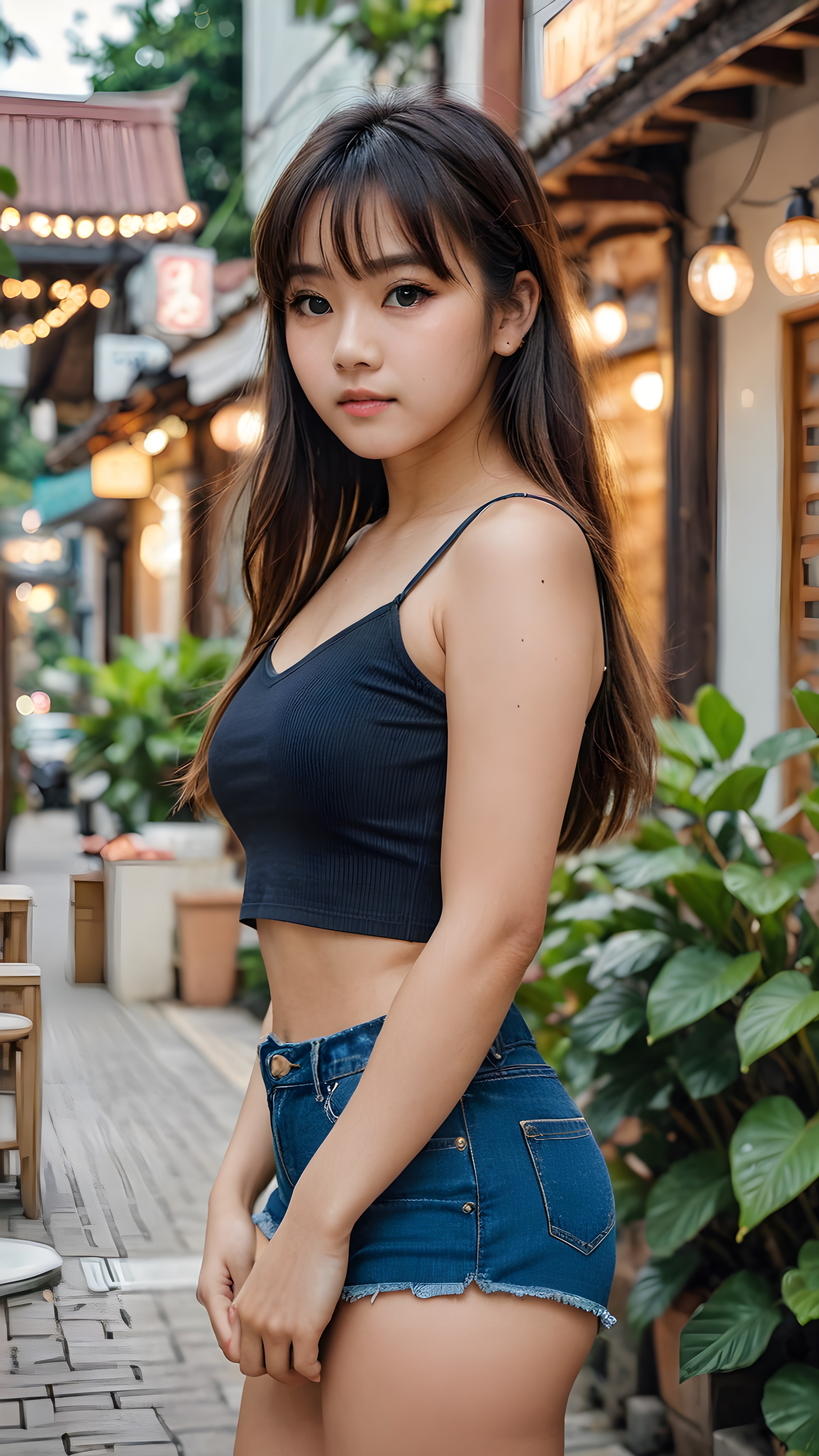 cute asia teen girl, long straight hair, bangs cut, realistic detailed eyes, she is elegantly dressed in a form-fitting low cut crop top, short pants, looks sadly at the camera