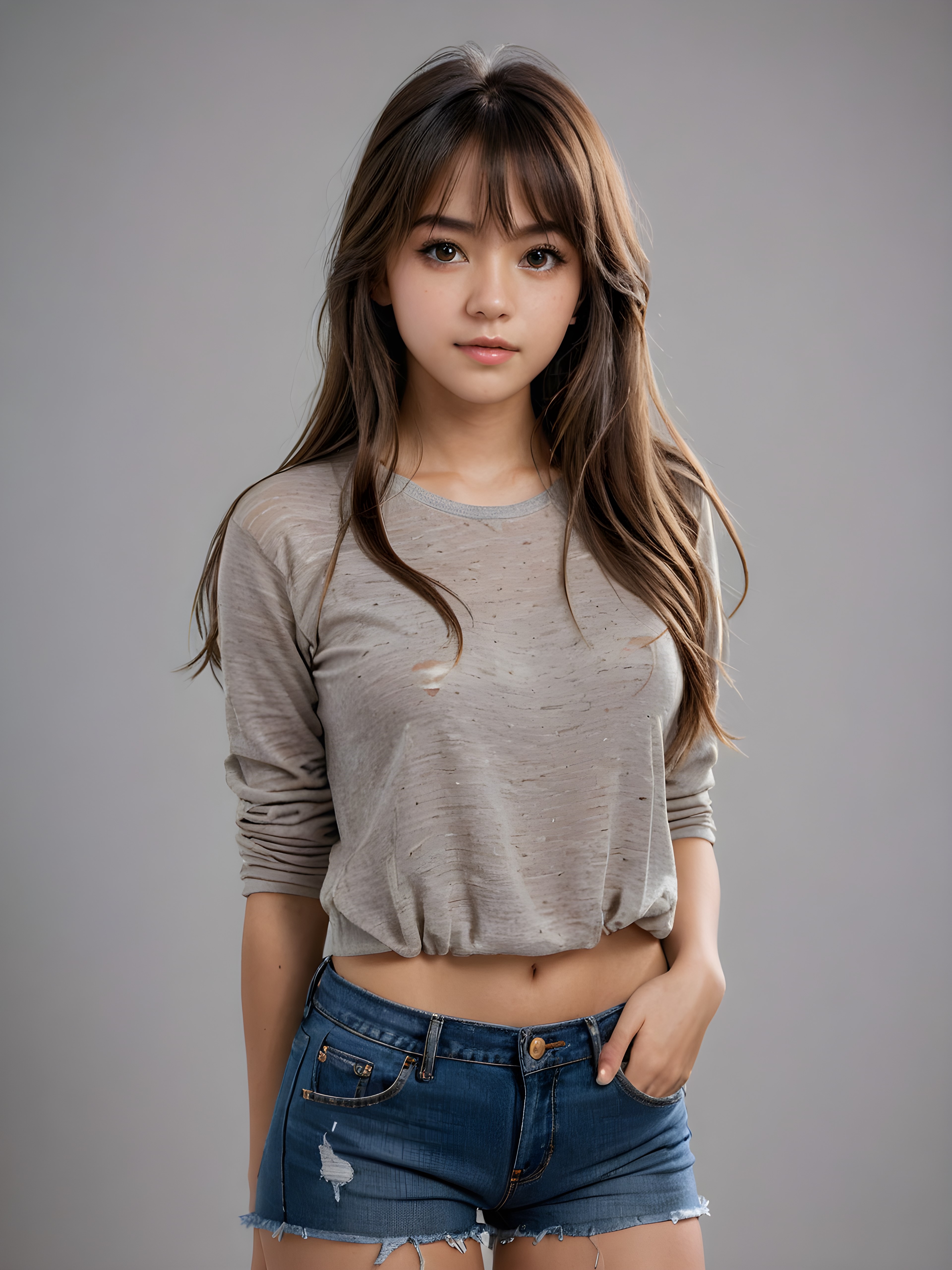 ((full body view)) of (((cute))) (((elegant))) ((attractive)) (((long, messy, straight hair))) ((stunning)) a beautifully realistic, cinematic lights, teen girl, bangs haircut, detailed hair, realistic detailed angelic face, ((realistic detailed brown eye)) looks sadly at the camera, portrait shot, perfect curved, wears a super short tight (grey shirt) made on thin silk, super short jeans pants, perfect anatomy, white background, side perspective, ((no background))