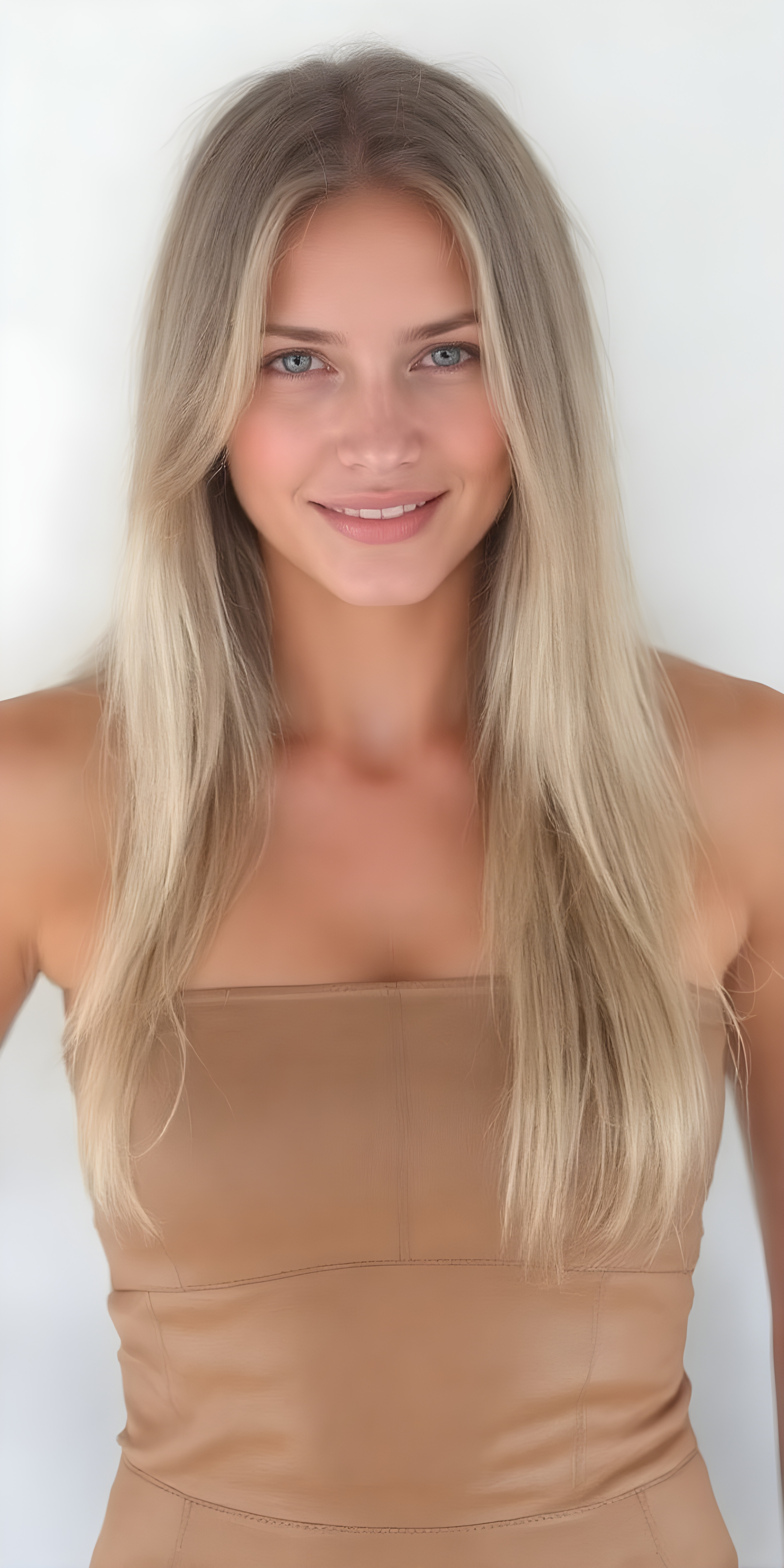 a (((very strong, exceptionally muscular))), yet softly smiling (((cute adult girl))) with long, straight full soft hair, flawless complexions with clear pores and light leather dress that perfectly complements her figure, accentuating her toned legs and thighs. Her body is perfectly proportioned and exceptionally lean, with a slight but unmistakable hint of a six-pack and light blonde hair that doesn’t quite cover her front. She wears a wide leather strapless top that covers her neck and upper chest, leaving her mid-back and shoulders bare. The leather dress tight in the waist, accentuating her perfect legs and making her look like a (superheroine) with a flawless, yet subtle, hint of a six pack on her otherwise flawless face.