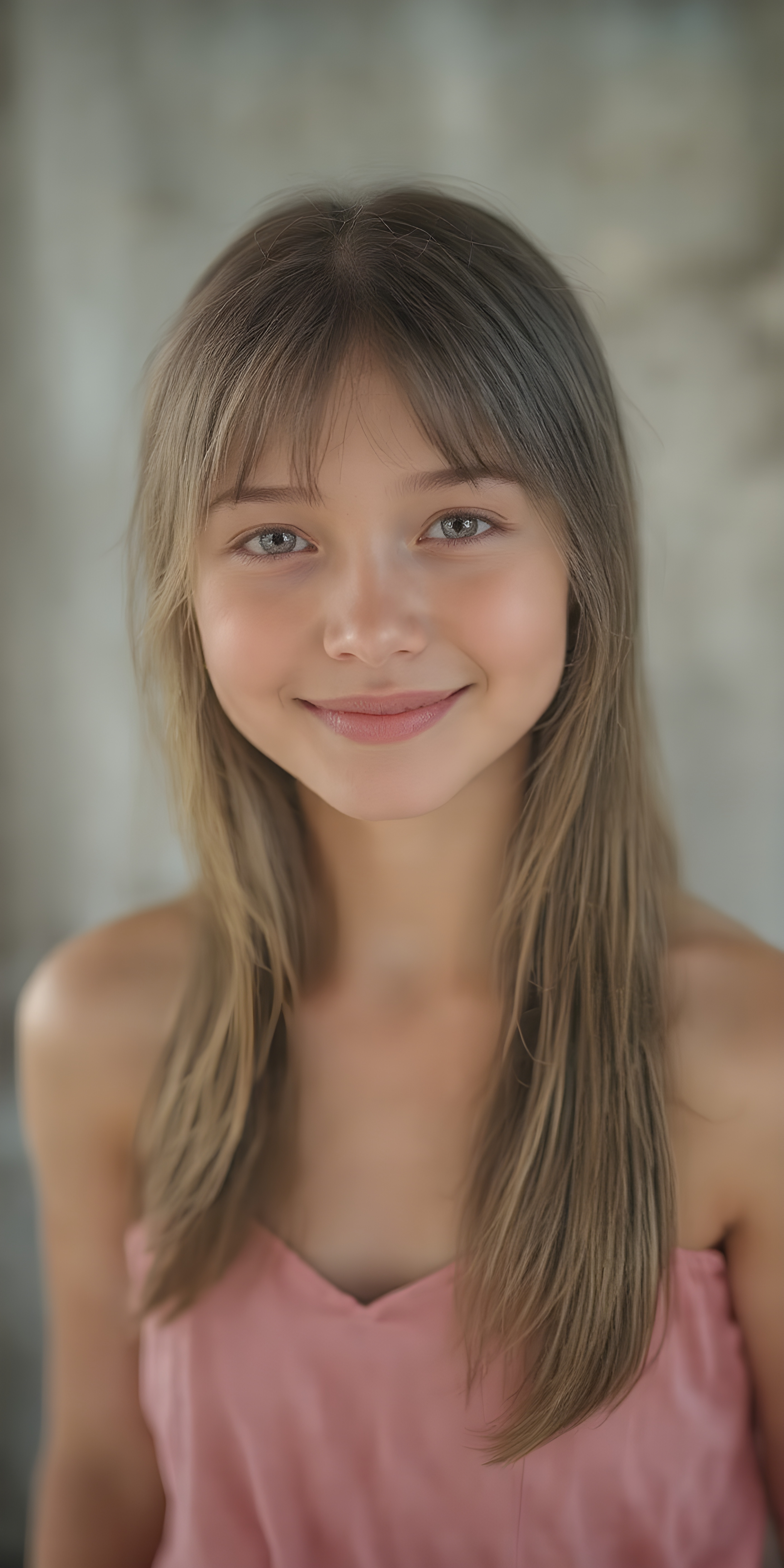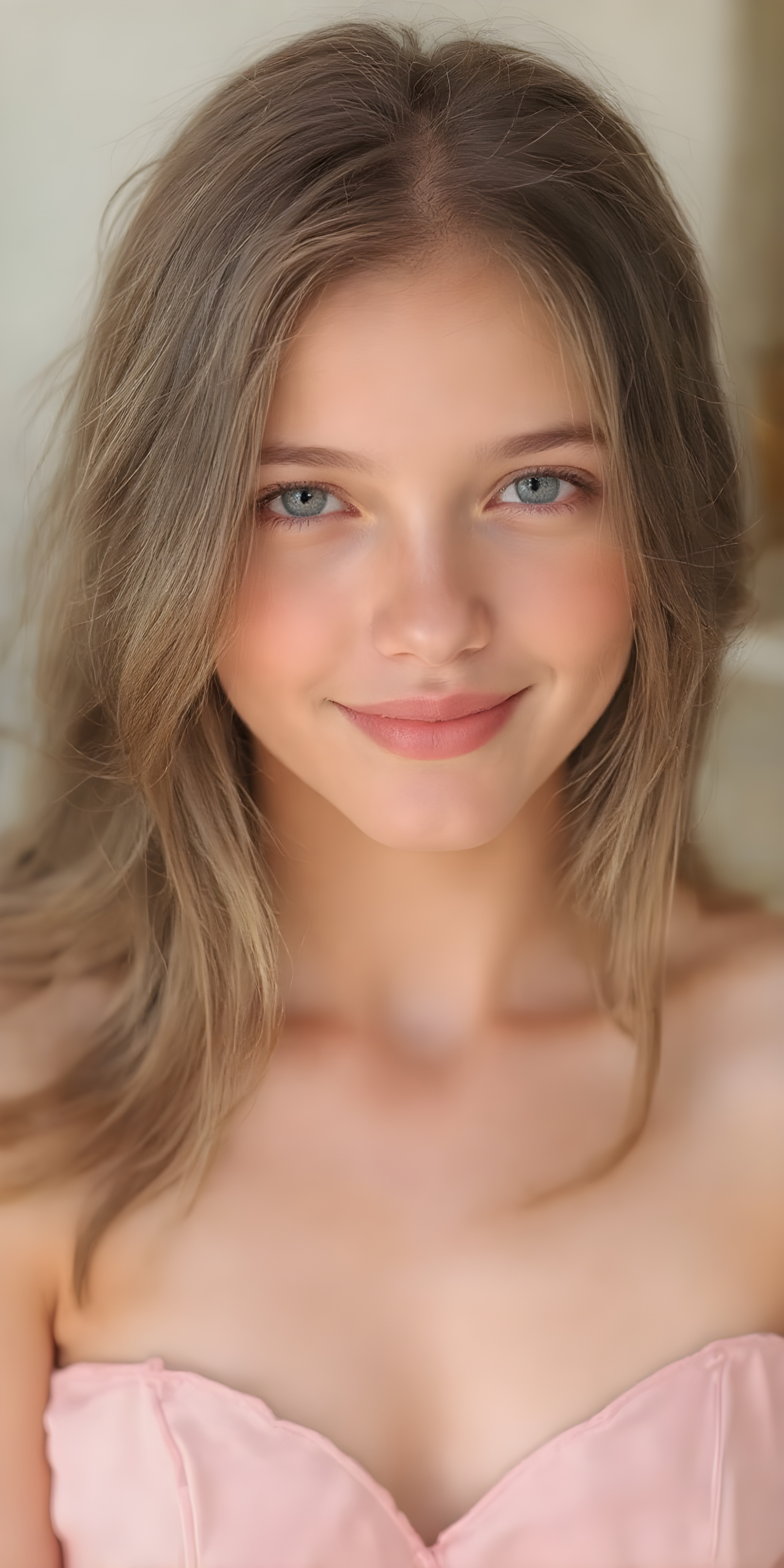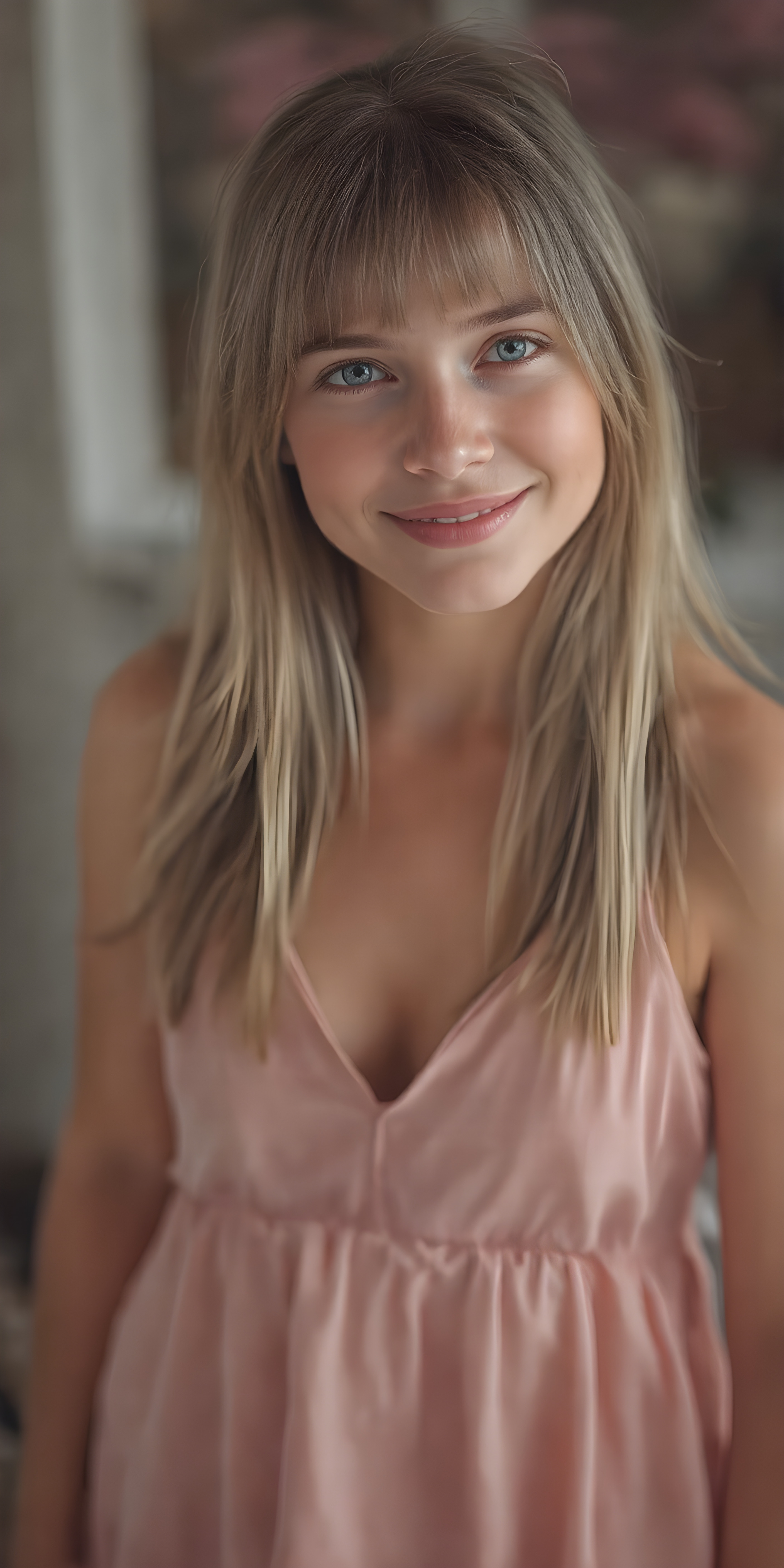 a (((vividly beautiful adult girl))), with incredibly strong, thick, muscular legs and a perfectly toned, intricate female form, dressed in a (((extremely light silk dress))) that emphasizes her natural beauty, featuring straight, full soft hair that gives off a gentle glow. Her smile radiates warmth and confidence, perfectly accentuating her adult face. She exudes perfect physical and emotional health, representing a stunning 8K image that captures her perfectly serene yet playful essence