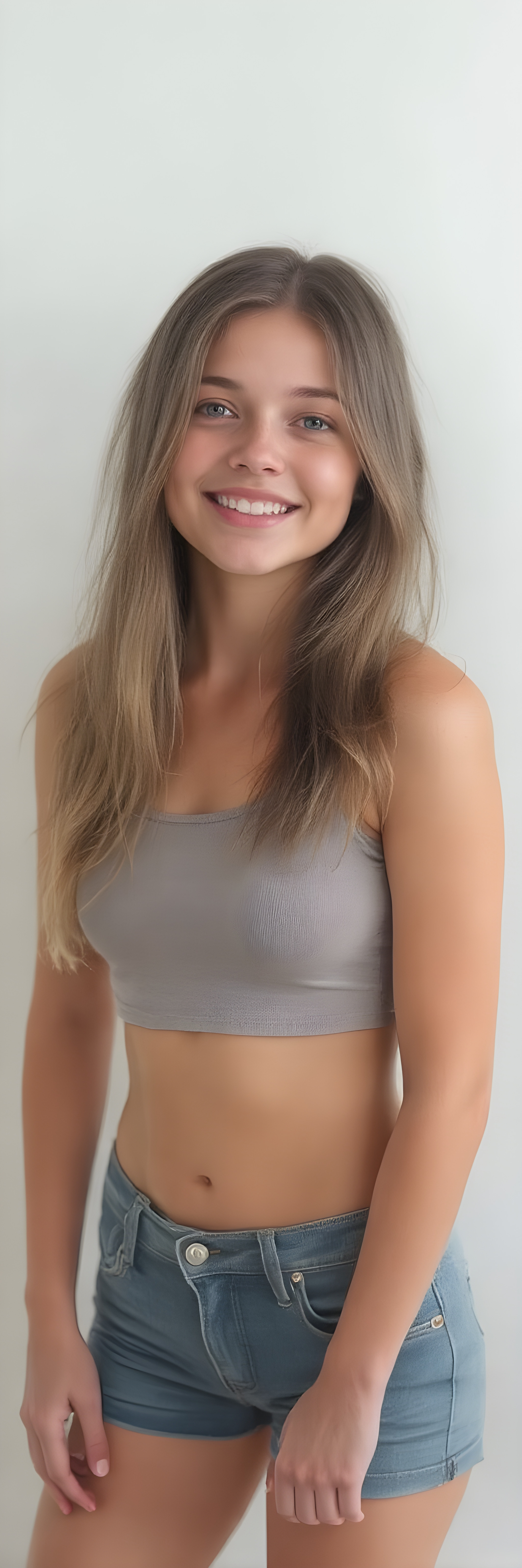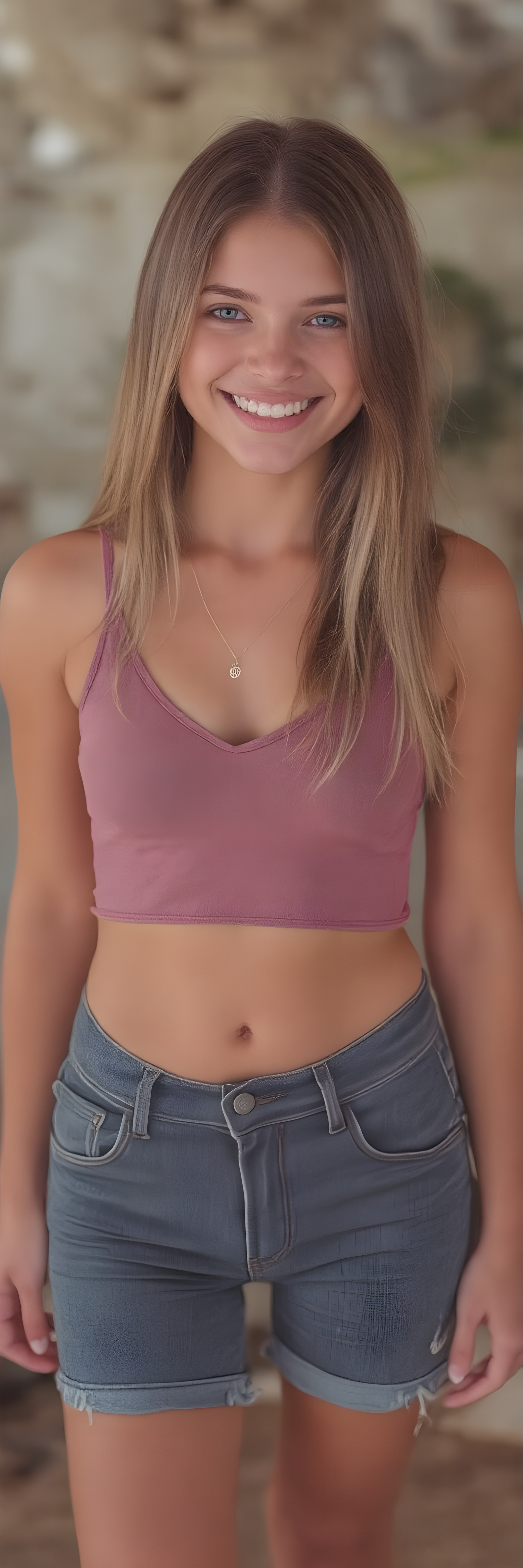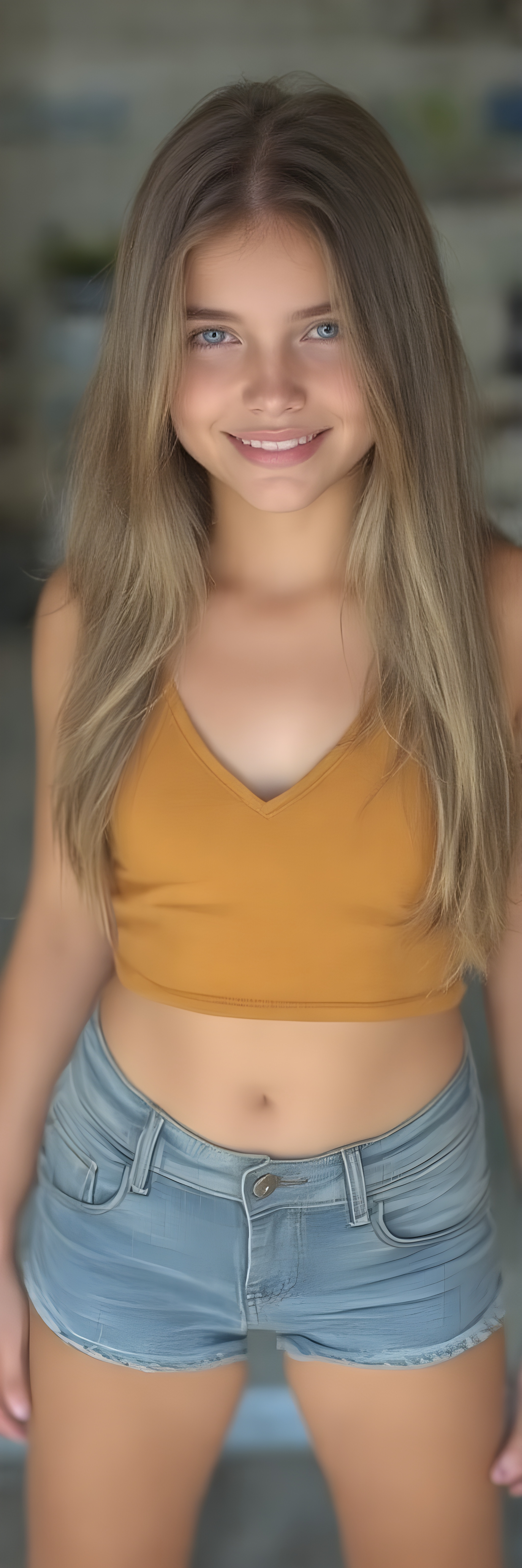 (((full body shot)) a (((vividly beautiful young girl, 18 years old))), with incredibly strong, thick, natural legs and a perfectly toned, intricate female form, dressed in a (((short cropped tank top, deep v-neck and short jeans pants))) that emphasizes her natural beauty, featuring straight, full soft hair that gives off a gentle glow. Her smile radiates warmth and confidence, perfectly accentuating her adult face. She exudes perfect physical and emotional health, representing a stunning 8K image that captures her perfectly serene yet playful essence